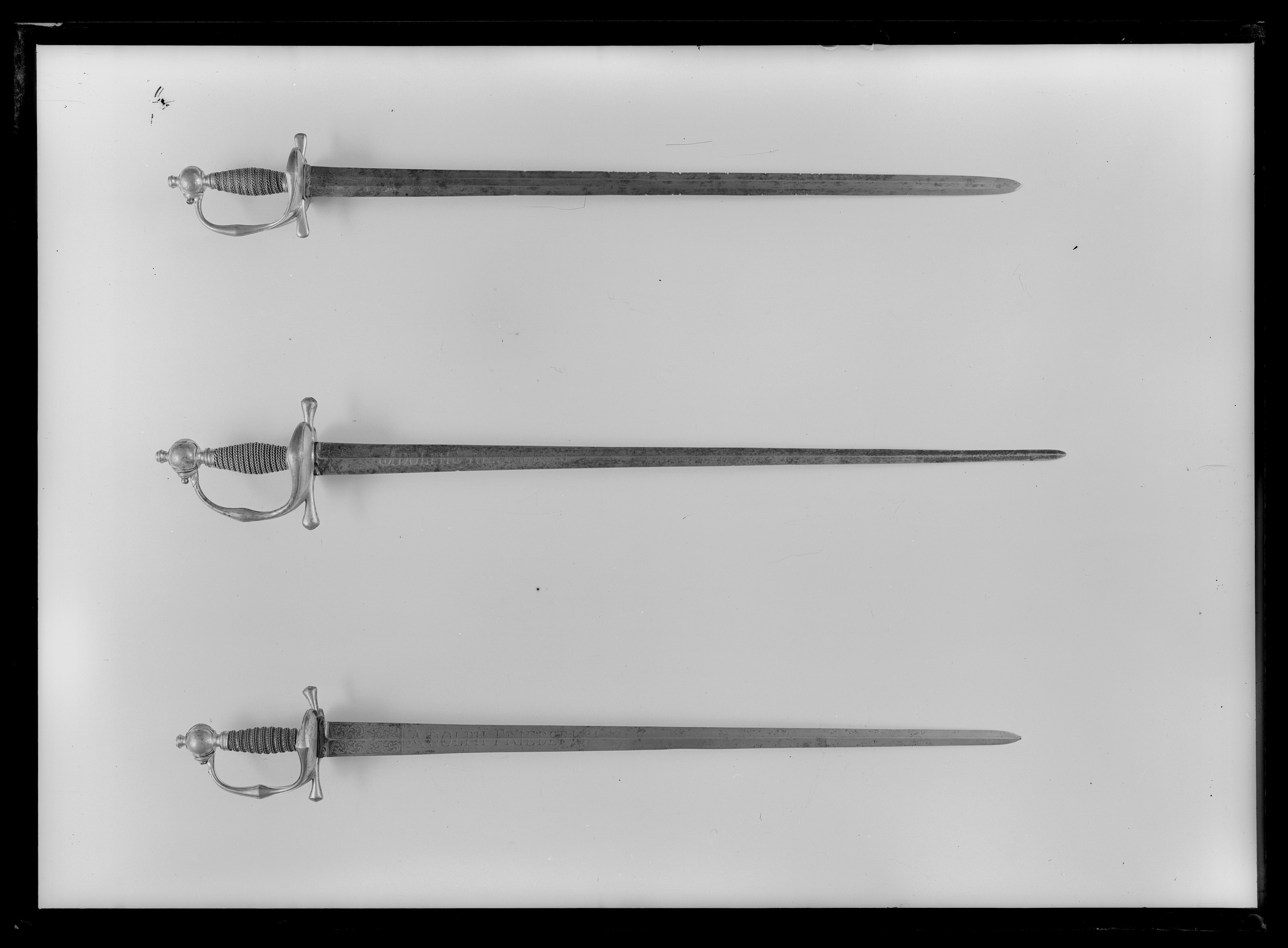 Fäste av förgylld mässing, efterkarolinsk typ. Utmed knappens fram- och baksida en vertikal list i relief, listens mittparti med konvex kontur. Utmed samtliga kanter en smal list. Handbygeln mjukt vinkelformigt utvidgad något ovanför mitten. Parerstänger tämligen korta, ytterändarna rundat utvidgade. Kaveln lindad med tvinnad förgylld mässingstråd, upptill och nedtill en ring med inpressade ränder. Klinga rak, tvåeggad, slipad med sexsidigt tvärsnitt. Ornering etsad och förgylld. På båda sidor av starka delen med baspartiet ett upptill tvärt avskuret förgyllt fält, vari en oval medaljong med monogram i skrivstil under kunglig krona AFR (Adolphus Fredericus Rex, Adolf Fredrik, konung 1751-1771), nedanför monogrammet: "PRO DEO ET PATRIA". Ovanför och nedanför medaljongen flätade bandornament. Fritt ovanför fältet ett ornament av varandra korsande C-formade bågar och bladornament.