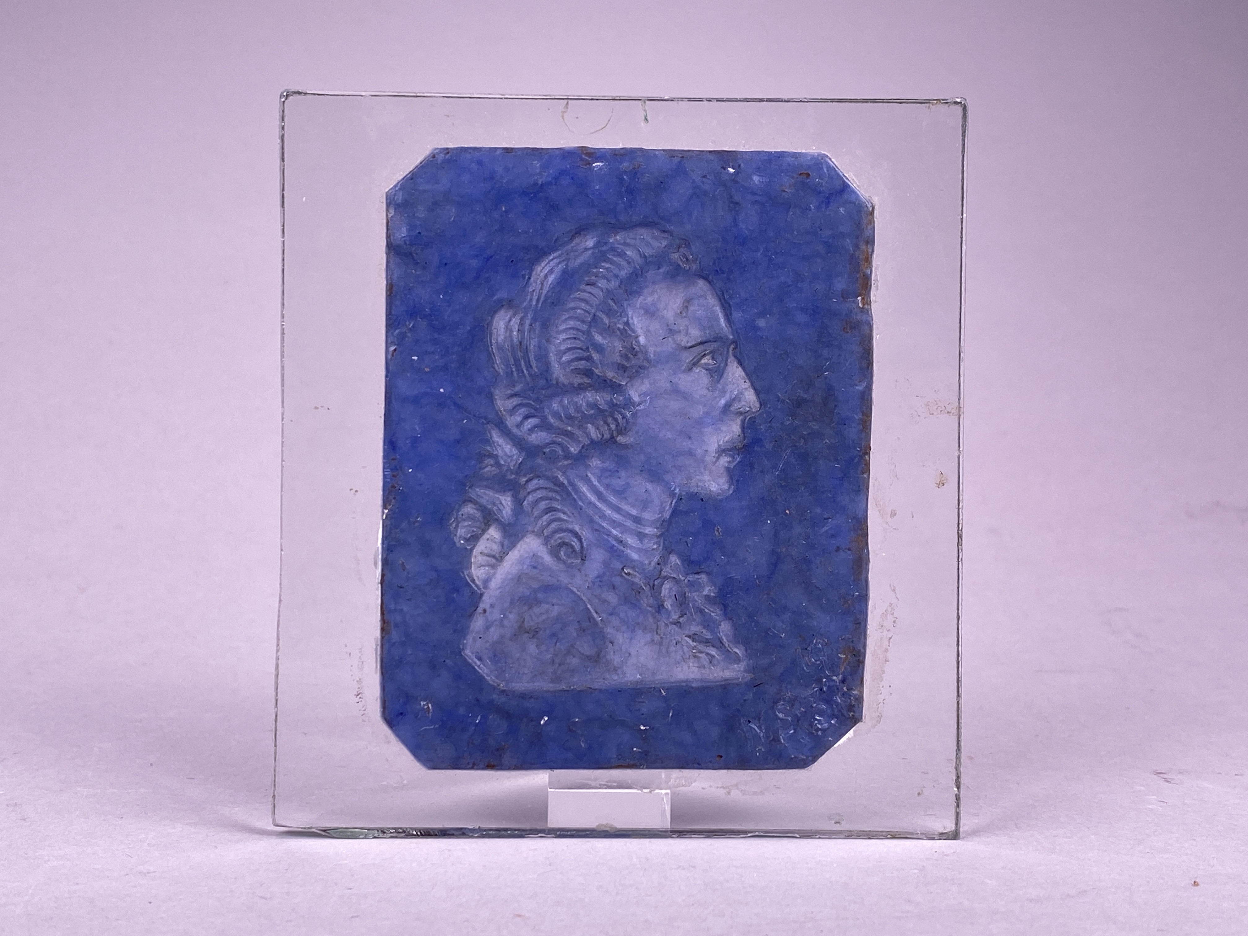 Gravyr tillverkad i vax på en skiva av glas. Rektangulär skiva med blått vax. Vaxet med gravyr föreställande ett profilporträtt på okänd mansfigur.