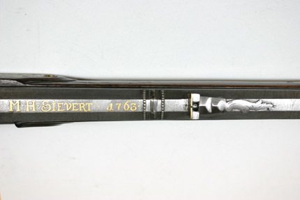 Åttsidig, damaskerad pipa av stål, sju räfflor, raka bommar, bombredd 4,1 mm. Svansskruvblad med avsmalnande, rundad spets, rester av graverad rankdekor. Påslagen silverdekor, på de tre övre sidorna på två ställen på kammaren samt vid mynningen i form av band, flankerade av pärlstavar, vid mynningen endast en pärlstav. På kammarens översida med guld (ägarmärkning?): "M. H. SIEVERT. 1763". Riktmedel inlaxade. Sikte av stål med lång, svängd, konturerad flik, på skärmen fäst en mässingsplatta med siktskåra. Långt, spolformigt korn av silver på två inlaxade klackar. Fästning: Pipan fäst med krysskruv samt två (urspr. tre) pipstift av stål. Flintlås med plant låsbleck, svagt fasade kanter, bakspetsen försänkt. Graverad dekor i form av kantlinjer samt på spetsen fågel och koger. Framför hanen signatur: "I. ECHSTED // A STRALSUND" (ortnamnet delvis utplånat). S-formig hane med fasade kanter, graverade kantlinjer och blad. Välvd nötskruv med blomformig gravering. Triangulära käkar, kort, triangulär hangren, käkskruv med skivformigt huvud. Fasetterad fängpanna med bred fals. Batteri med plant fängpannelock med breda, fasade kanter, eldstål med ryggås, slagytan förnyad med pålödd stålskiva (kopparlod?). S-formigt svängd fot, vulstformig häl. Batterifjäder med fasade kanter, bladdekor, kort, konturerat löv. Nöt med yttre springkil. Fästning: Två låsskruvar. Avtryckare med snälltryck och rak, bakåtböjd avtryckare med fasade kanter, rak snällare. Avtryckarbleck av stål med liljeformig, bakre avslutning. Helstock av valnöt av fransk typ med kolvlåda och kindstöd. Snidad dekor, rocailler på kolvlådelocket, kindstödets främre ände, vid svansskruvbladet och vid spetsrörkan. I rocaillen på kolvlådelocket inskuret: "1763". Beslag: Näsband av horn. På kolvhalsen ett fyrsidigt stålbeslag, l: 11 mm, h: 7 mm, bågformigt fasade kanter, kvadratiskt hål, fästkruv med ovalt, platt huvud (för dioptersikte?). Övriga beslag av mässing. Bakplåt med markerad häl och konturerad ryggflik, graverad rokokodekor, två stålskruvar. Kolvlådelockets ände mässingsbeslagen, två stålskruvar, stjålfjäder med fingergrepp. På kolvens undersida en oval mässingsplåt med graverat nr 1. Konturerat sidbleck med graverad trofégrupp och bladrankor. Tre åttsidiga rörkor, spetsrörka med triangulär spets, graverade bladrankor. Varbygel med s-formigt svängd bygel, främre delen med mittås, främre armen 8-formig med fasade kanter, avslutad med bladspets Bakre stolpen omvänt c-formig, välvd arm avslutad med treflikigt blad, graverad dekor på bygelns ändar, främre armen samt ändbladen. Tillbehör: Laddstock av mörkbrunt trä, l: 979 mm, i ena änden en hornskoning, l: 23 mm, i andra änden ett mässingsrör, l: 87 mm.