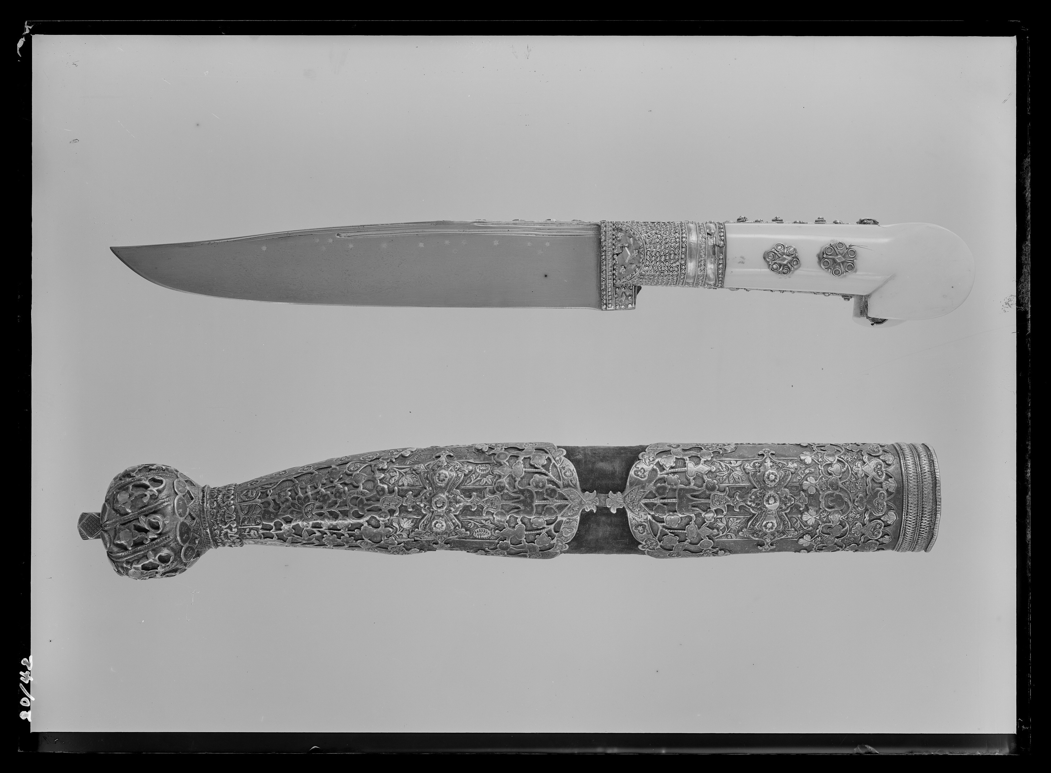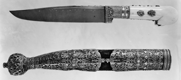 Fäste av yatagantyp med två utstående "öron", 54 mm vida. Av två hopnitade elfenbensplattor, nitarna beslagna med två rosettformiga filigranarbetade, förgyllda silverplattor. Fästet beslaget med förgyllt silver med filigranarbete. Beslaget omfattar nedtill klingans bas och täcker 62 mm av dess rygg. Klinga av damaskerat stål, eneggad, 37 mm bred vid basen. Ryggen något svängd. Intill den en längre och en kortare smal hålkäl. Eggen först rak, sedan smalnande mot spetsen. Längs klingans rygg tio små inslagna stjärnor av silver.