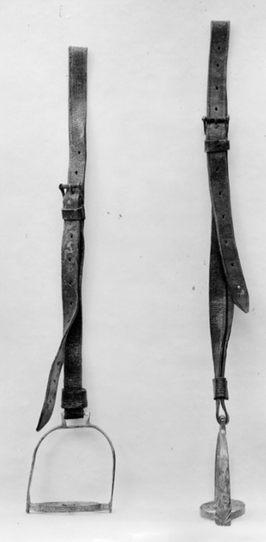 Bomsadel av brunt läder med bommarnas insidor och sits av ljusbeige sämskskinn med stickningar av ljust silkegarn. Rektangulära kappor med inpressat blommönster (tulpan) samt blad och rätvinkligt mönster. Hel frambom 520 mm bred, 90 mm hög, kantad med ljusare läder. Bakbom med stödbommar ca 520 mm bred, 80 mm hög, båda lodräta stickningar på insidorna. Rundad, räfflad, framåt utdragen sadelknapp av mässing. Bom överklädd med väv. Bossor av naturfärgat linne med kant och foder av brunt skinn. Framför frambommen två rader med vardera 14 mässingstennlickor. Bakom bakbommen två rader, den ena med 18, den andra med 14 mässingstennlickor. 4 stroppar för sadelgjord av brunt läder. Två byglar för stigläder, två krampor för hölster samt en sölja för svansrem. Alla av stål. Tillbehör: Sadelgjord av hampa med läderstroppar.