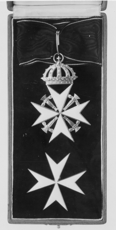 Rektangulärt etui av trä, utvändigt klätt med rött skinn, på undersidan rött, mönsterpressat papper. På locket infällt ett vitt malteserkors av gulnat, krackelerat skinn (?). Stängning mm: Knäpplås av mässing, ett gångjärn. Locket invändigt klätt med vitt siden, firmamärke i guldtryck från hovjuvelerare C F Carlman, Stockholm. Underdelens sidor invändigt klädda med vitt siden, på bottnen vitt papper. Uppfällbar insats, klädd på ovansidan med svart sammet, urtag för ordenstecken och bröstkors, på undersidan klistrat vitt papper.