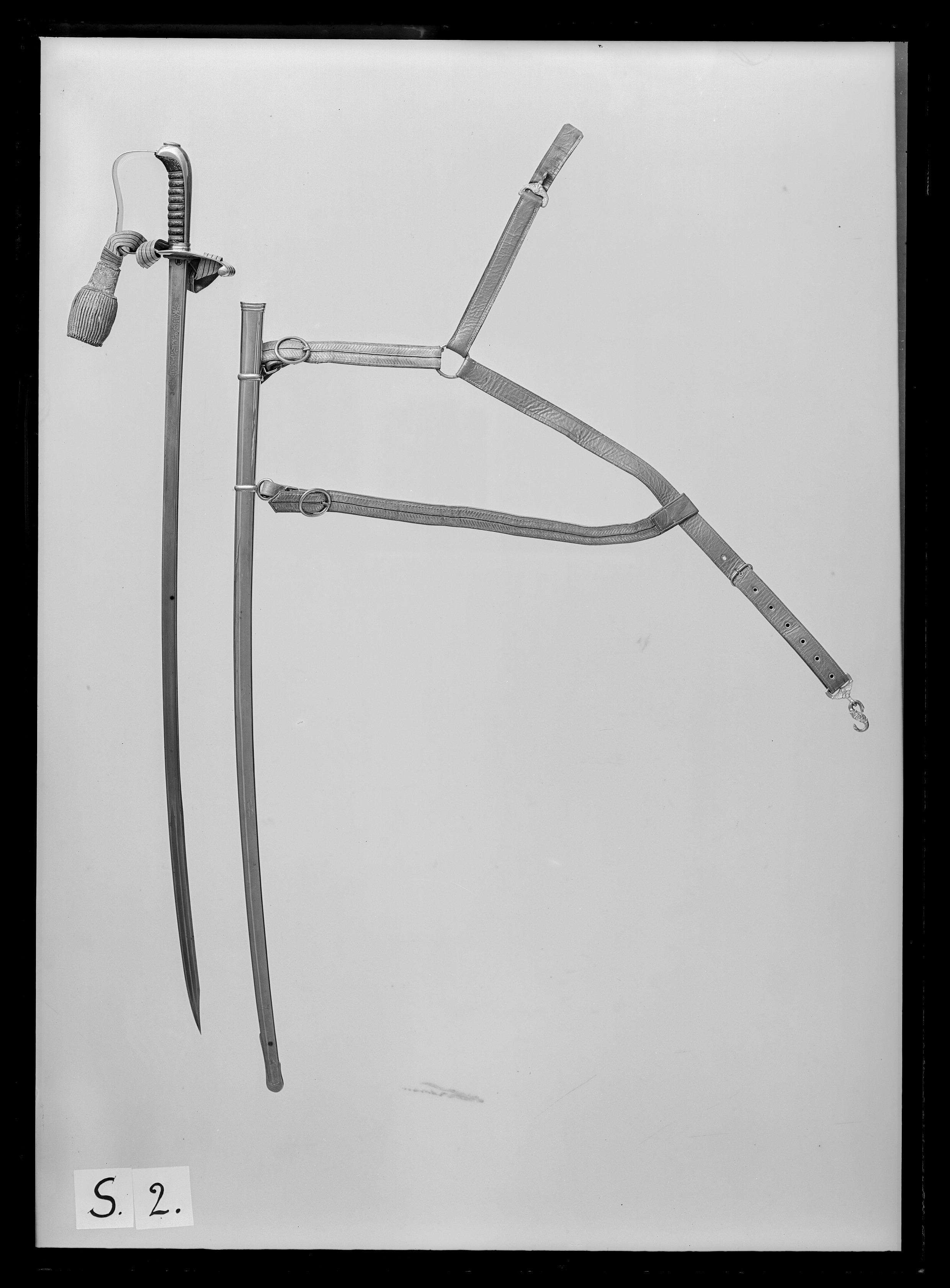 Fäste av slätt, förnicklat stål. Kappa sexkantig med platt, oval nitknapp, kappan övergående i ryggbeslaget. Parerplåt plan, lika bred på båda sidor om krysset och övergår i den något inåtböjda, platta handbygeln som är intappad i kappan. Parerplåten övergår baktill i en platt bakre parerstång, vari två skåror för portepé, änden nedböjd och inrullad med tre räfflor. Kavel med nio räfflor, klädd med svärtat fiskskinn, lindat med försilvrad, tunn koppartråd. Intill parerplåten profilerade ringbeslag av stål. Stötlapp av röd sammet. Klinga av damaskerat stål, tämligen smal, böjd, eneggad. Ryggen breddad vid det 255 mm långa spetspartiet som har två hålkälar. Vid spetsen är ryggen snett inskuren mot den uppåtböjda, vassa udden. Vid klingbasen på yttersidan inslaget ett märke i form av en sittande ekorre i ovalt fält (möjligen Carl Eickhorn, Solingen). På starka delen på båda sidor en långsträckt, förgylld kartusch med inskription av arabiska bokstäver, vid kartuschens ändar en stjärna resp. en halvmåne. Tillbehör: Portepé av gult skinn, klätt med galon av guldtråd vari tre smala ränder av svart silke. Tofsens platta holk av guldtråd, broderad med Österrikes örn och monogram F J (kejsar Franz Joseph).