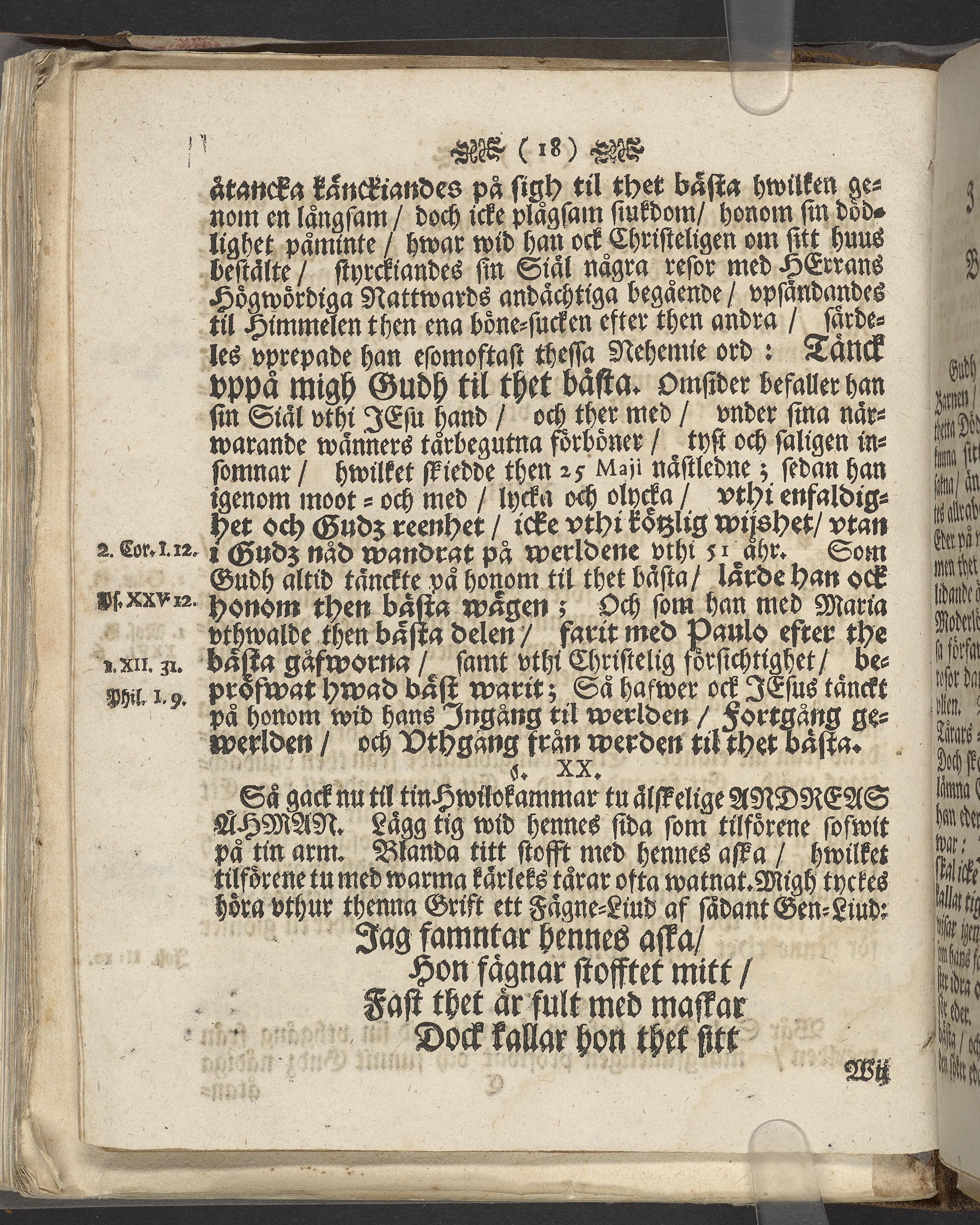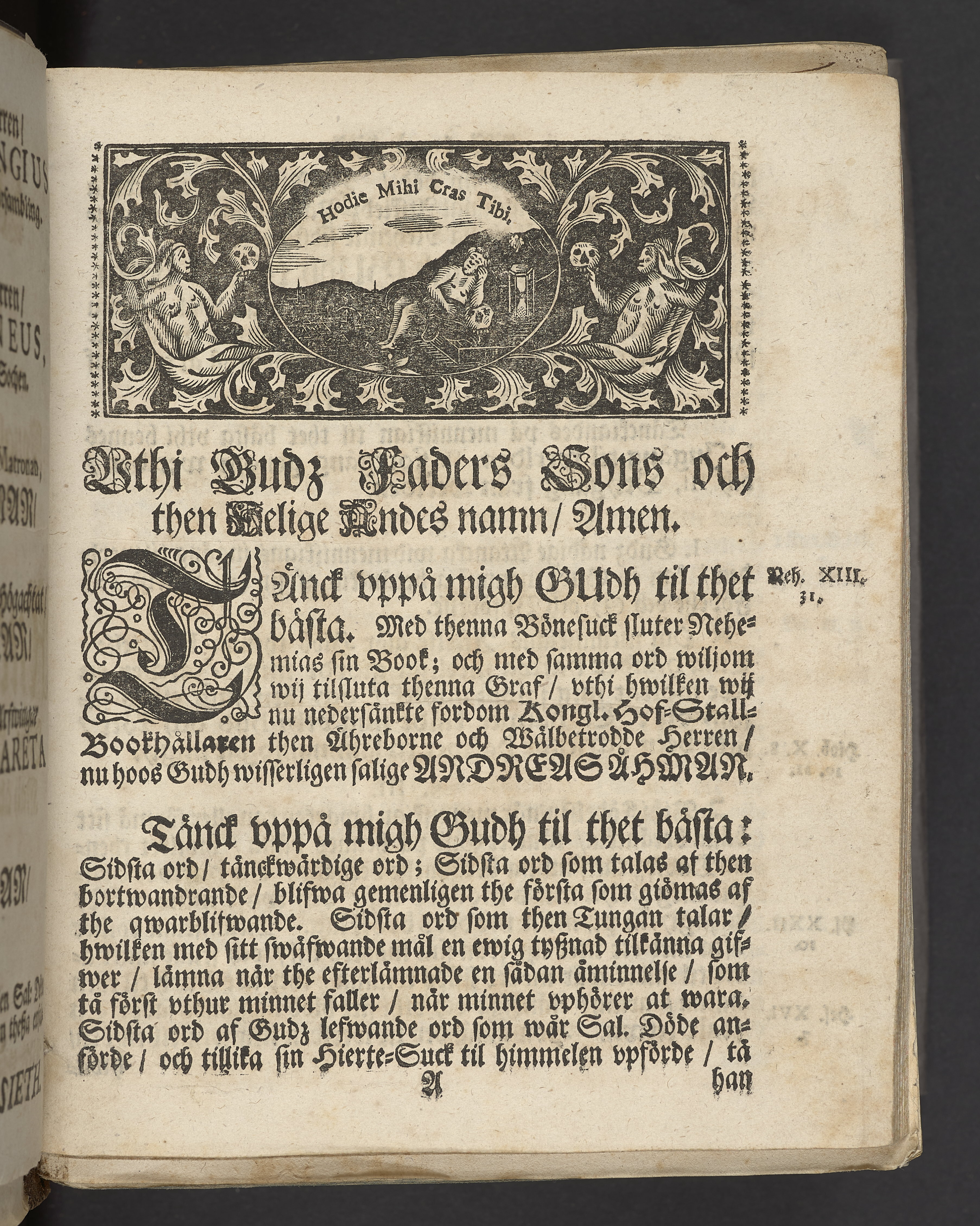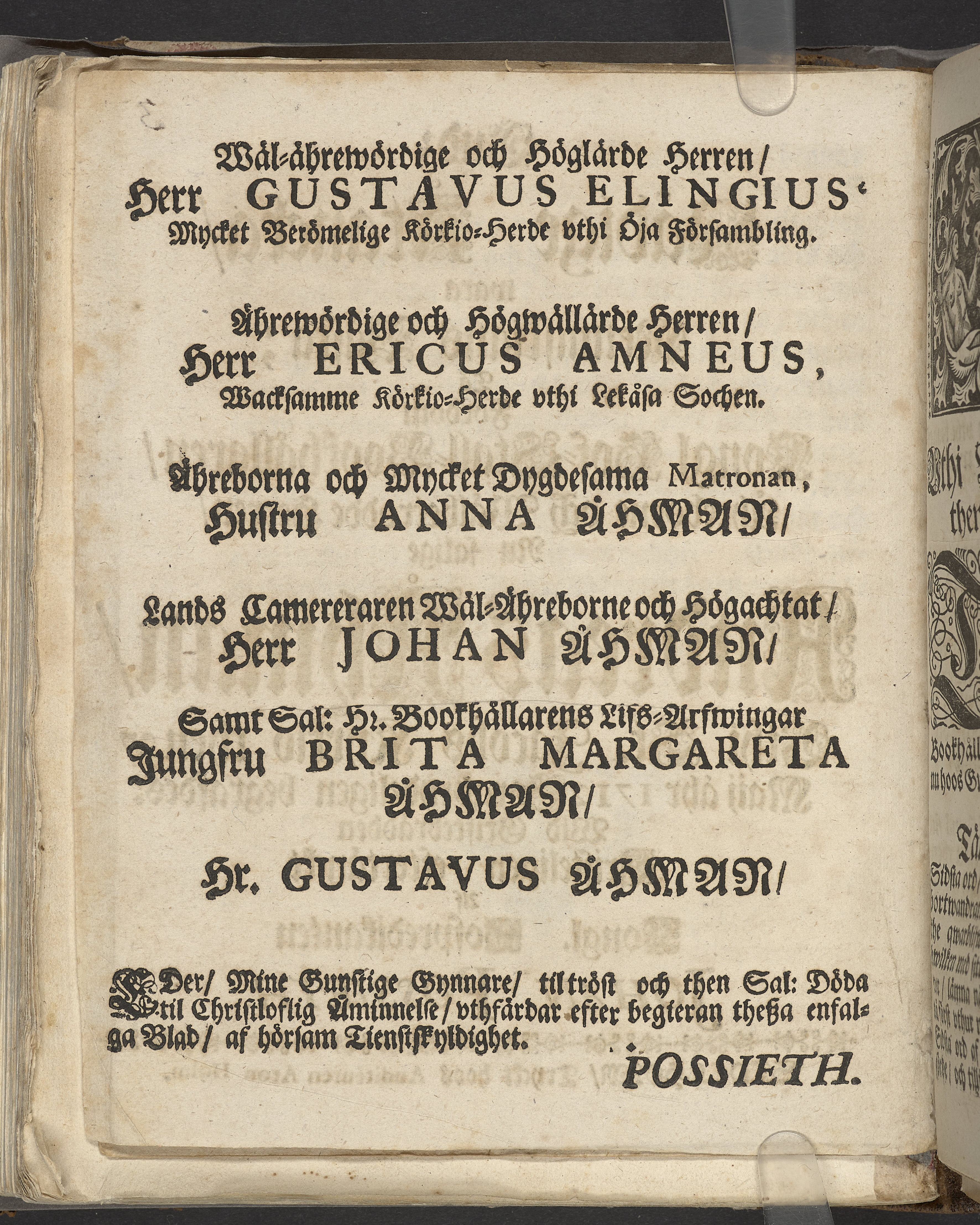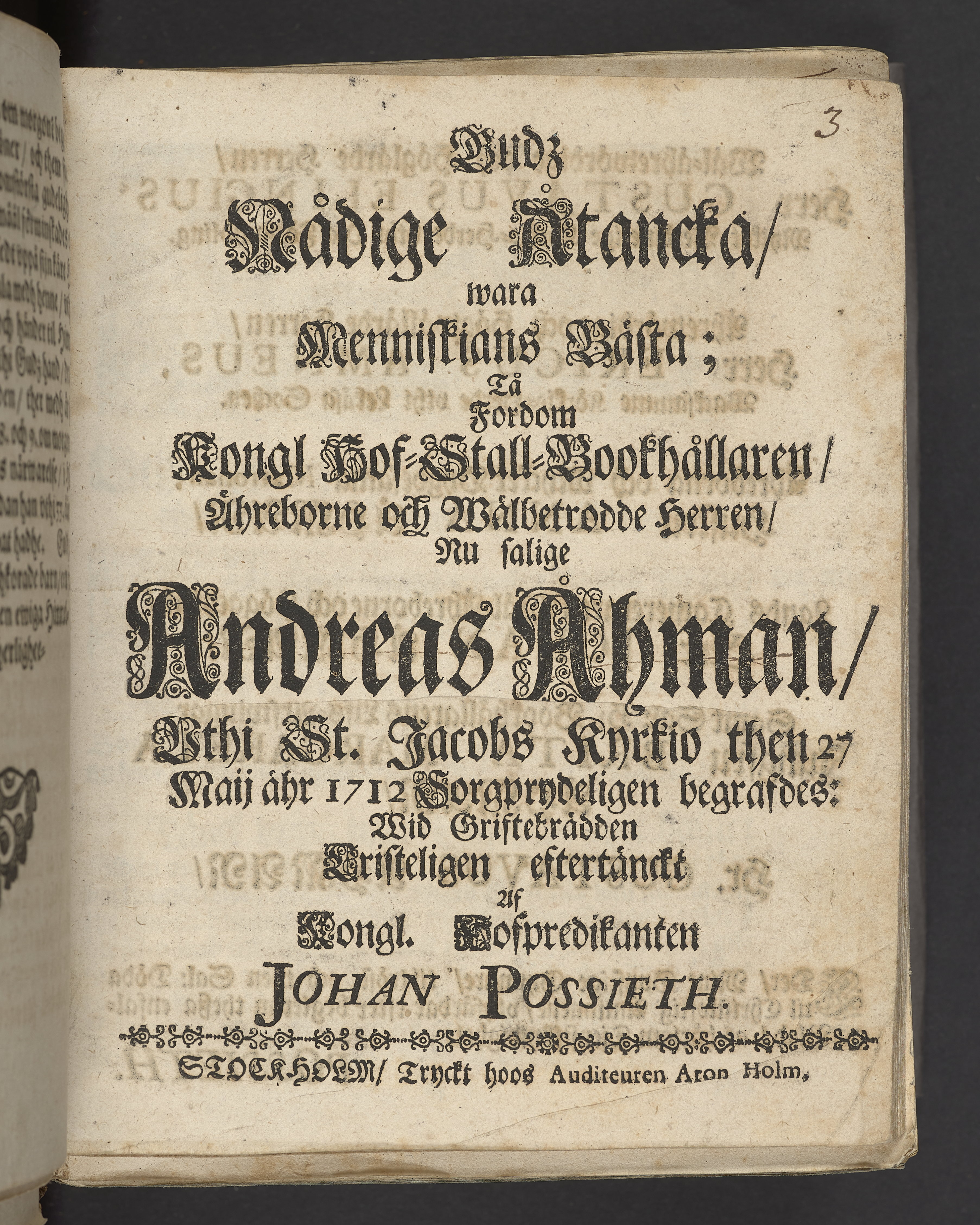 Gudz nådige åtancka, wara menniskians bästa; tå fordom kongl hof-stall-bookhållaren ... nu salige Andreas Åhman, vthi St. Jacobs kyrkio then 27 maij åhr 1712 sorgprydeligen begrafdes: wid griftebrädden cristeligen eftertänckt af ... Johan Possieth. Stockholm, tryckt hoos auditeuren Aron Holm.