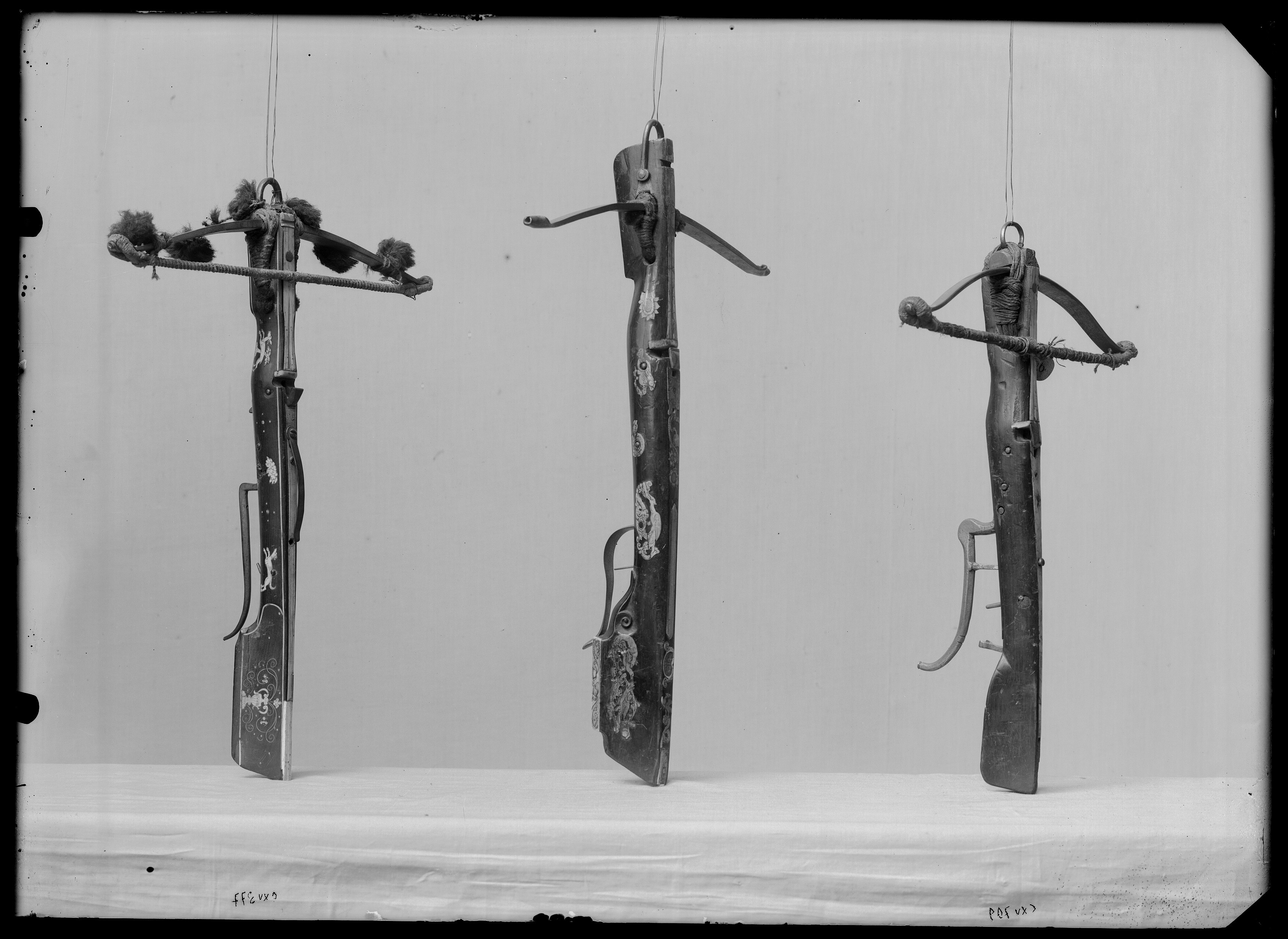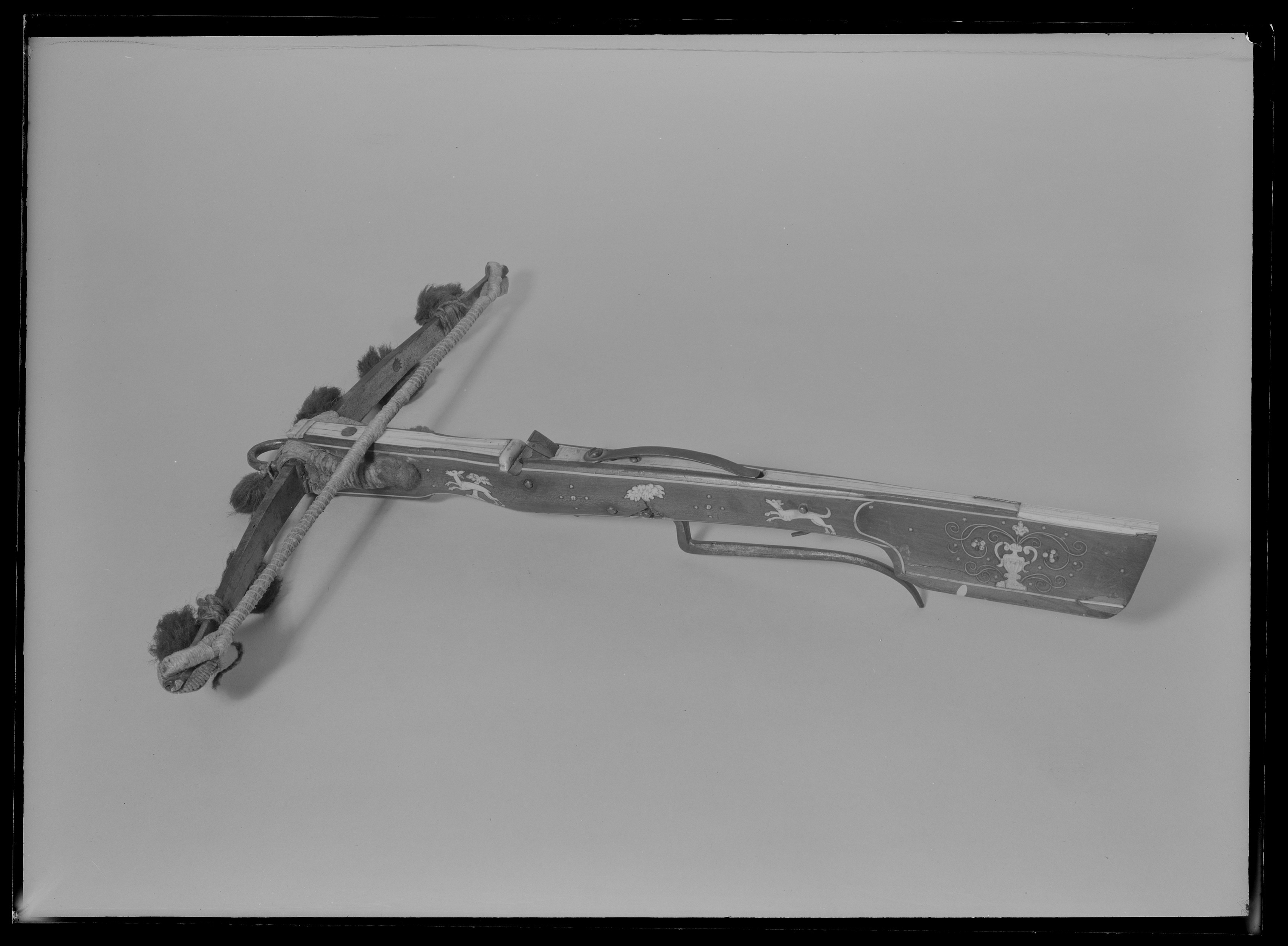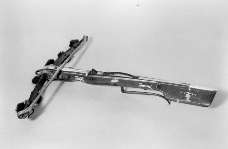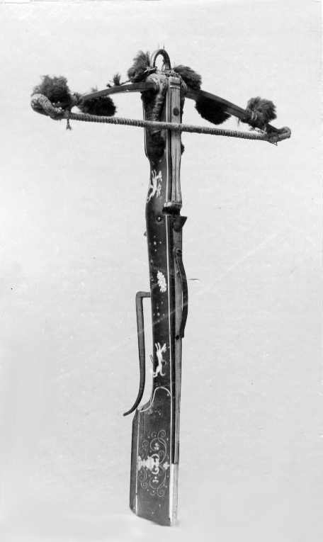 Båge av stål på höger arms baksida finns en stämpel med ett kors (se Stöckel 6451). Bågen fästad vid stocken med flätad hamptråd. På bågen finns 7 runda tofsar av grönt ylle, fästade på tvinnad ylletråd. Sträng av hampa. Lås med nöt av stål med stränghållare och pilhållare. Avtryckare med säkring. Stock av trä med pilränna av ben. Kolv av tysk typ. På anslaget inläggning av benslingor och vas. Listerna på stocken av ben. Inläggningar på stocken i form av hundar träd och hjortar av graverat ben och ovala benplattor. Benplatta på hela ryggsidan av stocken. Framför låset på stockens undersida stämplat "L.D.". Bygel och varbygel av stål. Varbygel enarmad i vinkel.