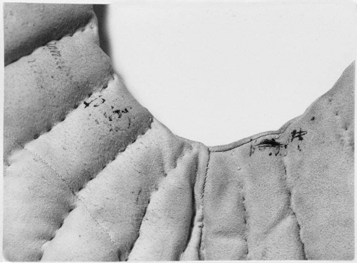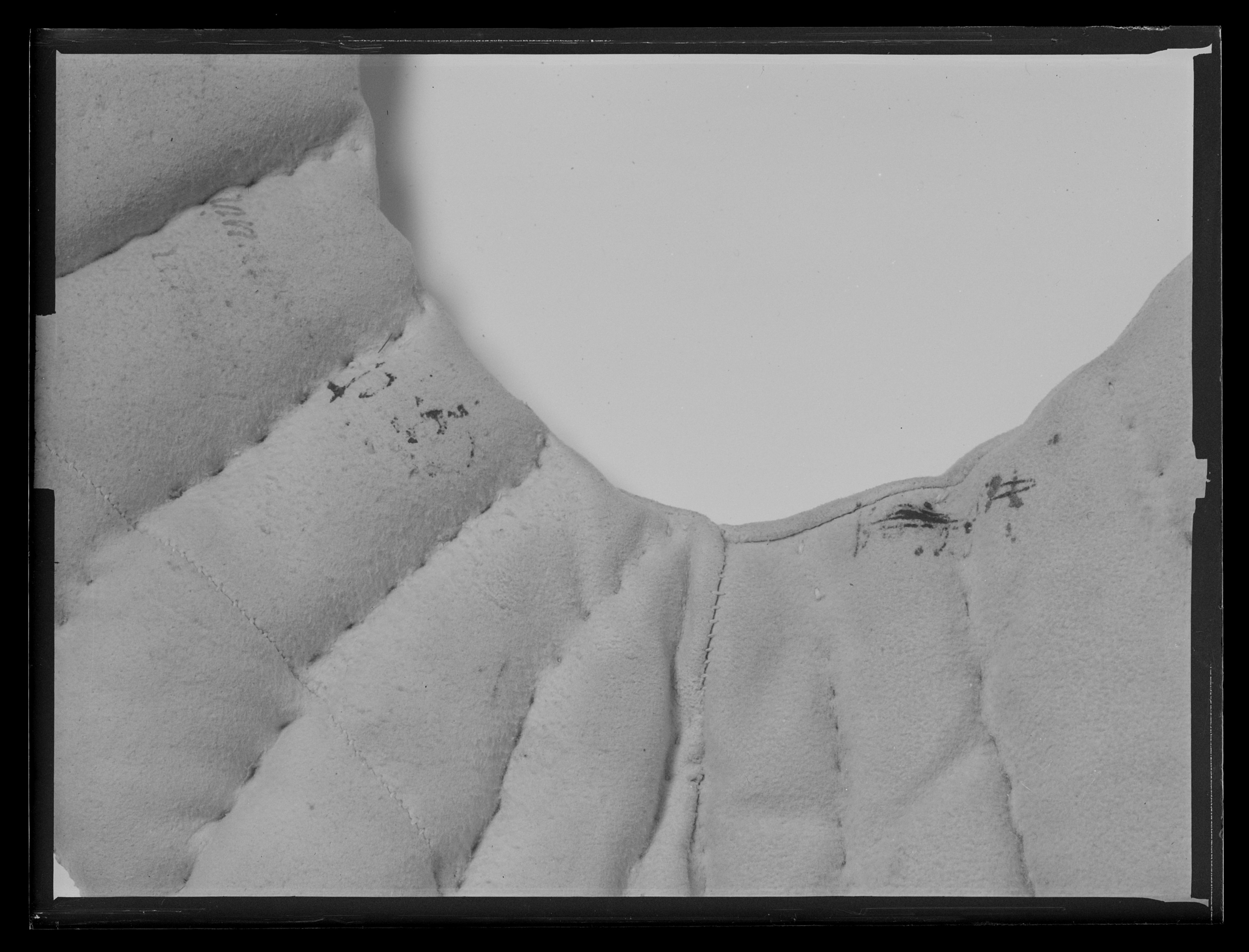 Ringformig tornerhalsputa av gult sämskskinn. Vadderad, främst på sidorna. Troligen vadderad med tagel. Sömmar för att hålla vadderingen på plats. En skarv löper tvärs över tornerhalsputan dvs den består av två ihopsydda stycken. Själva ringen är ca 100mm bred. Två smala linneband, 160mm långa, framtill för att knyta ihop halsputan.