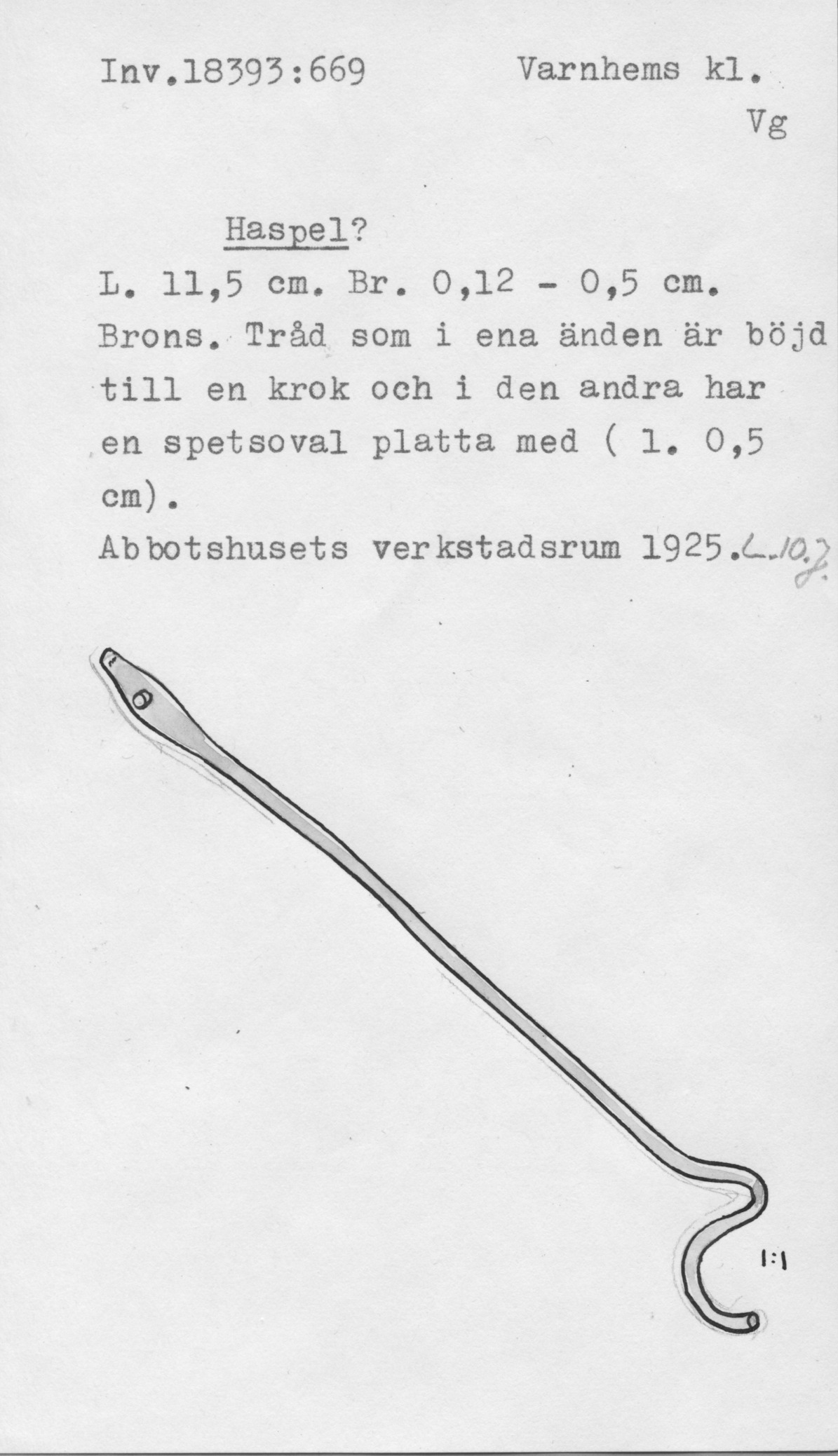 Tråd som i ena änden är böjd till en krok och i den andra har en spetsoval platta med ett hål.