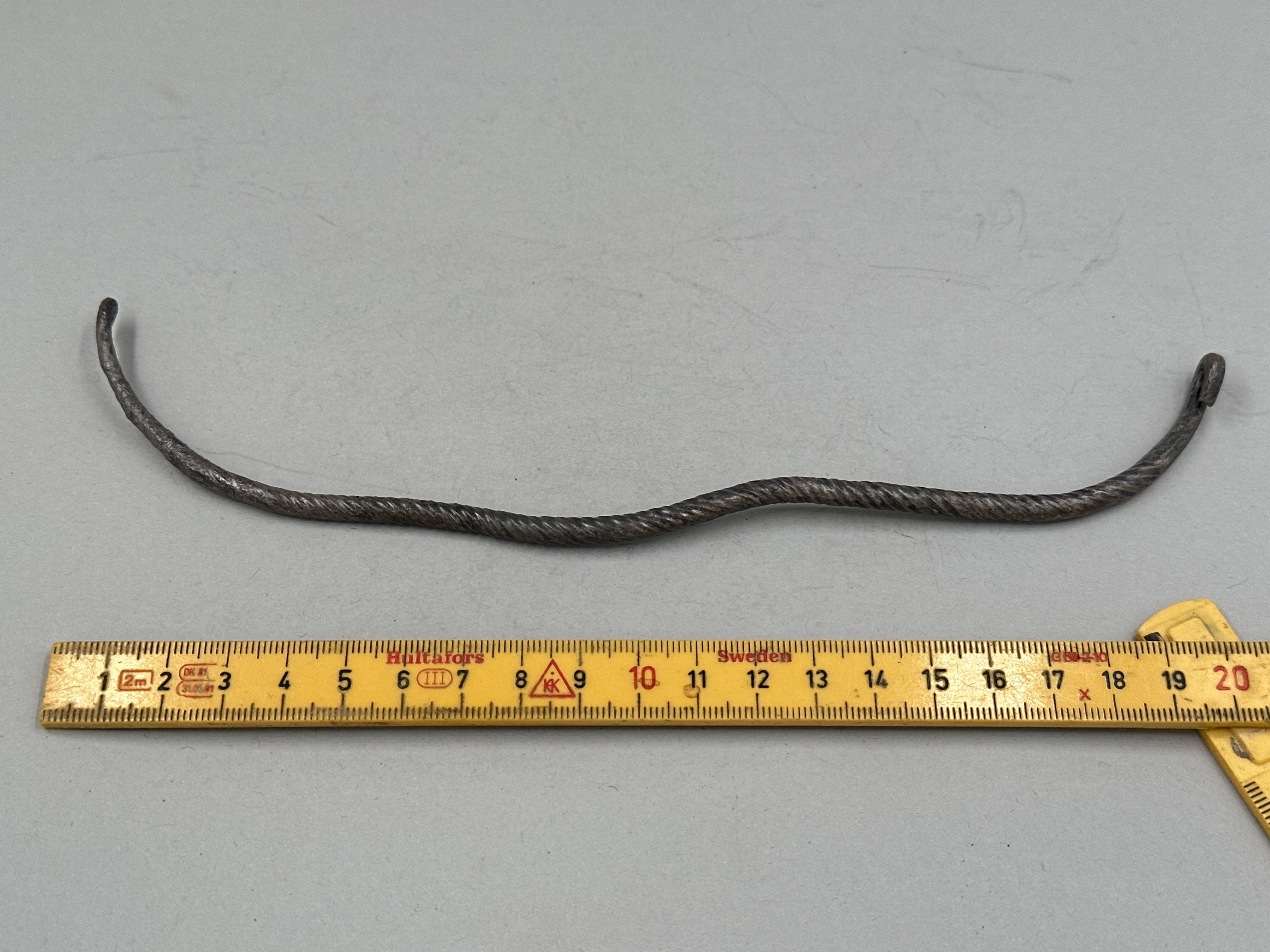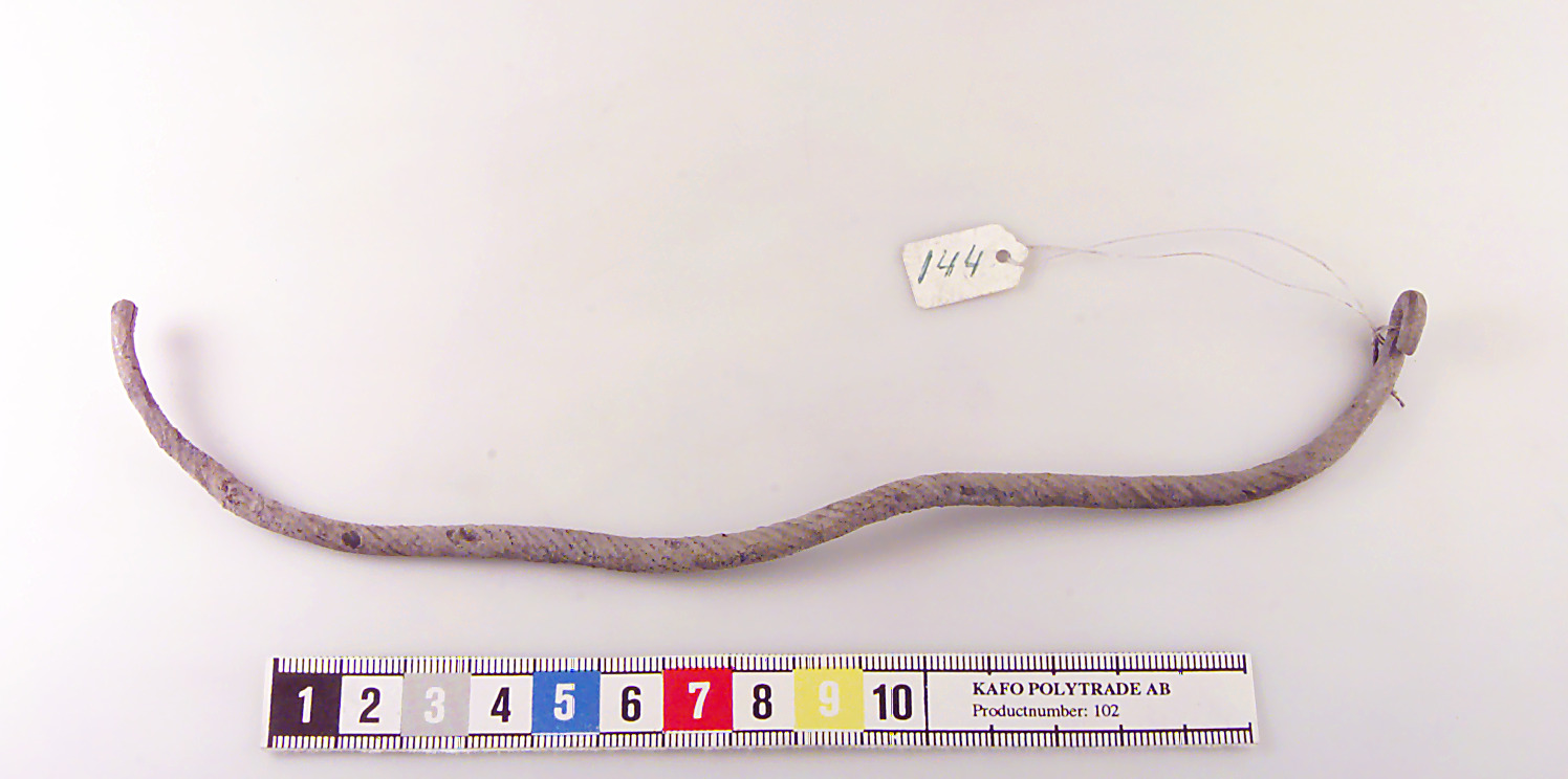 Rundad ten med ändarna tillbakaböjda till öglor. Spiralornerad. Något skadat ytskikt.