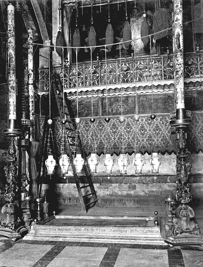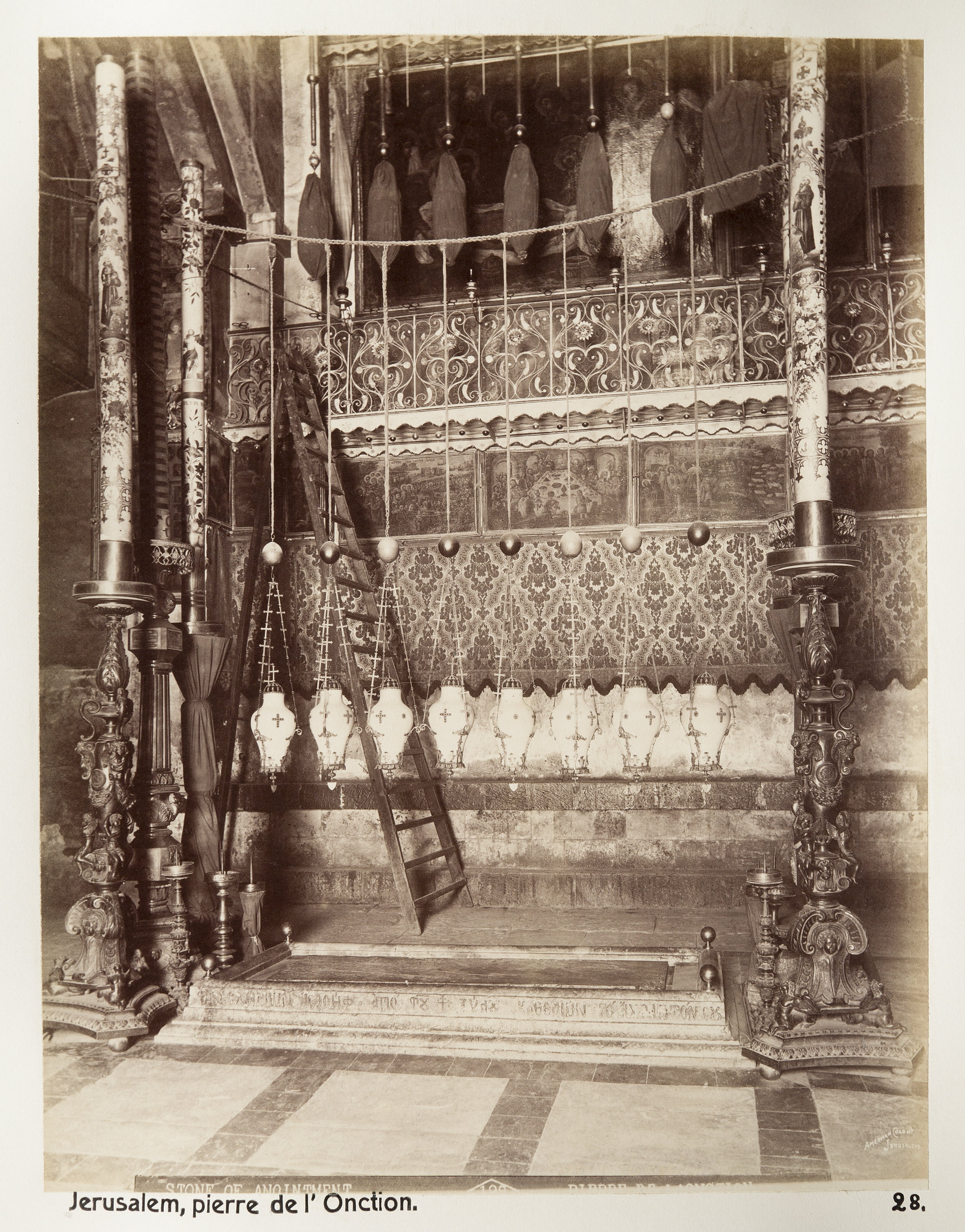 Smörjelsestenen i Heliga gravens kyrka, Jerusalem. Text på originalet: "Stone of Anointment/Pierre de l'Onction." Fotografierna LXVI:N.01.-180. kommer från resan till Palestina och Syrien som Wilhelmina och Walther von Hallwyl gjorde den 30 mars-27 april 1901. De lämnade Sverige den 5 november 1900 för Egypten, där de stannade till den 28 mars 1901, då de fortsatte till Palestina. Med på resan var Wilhelminas sällskapsdam, fröken Ida Uhse. Den 27 april fortsatte de till Turkiet och Mindre Asien. De mindre fotografierna (utom de från Samos) LXVI:N.90.-100. är tagna av Wilhelmina själv, under en resa till häst från Jerusalem till Damaskus 8-20 april 1901. Övriga fotografier är inköpta av Wilhelmina i Jerusalem, Damaskus och Beirut. Alla uppgifter kommer från Ida Uhses reseanteckningar.