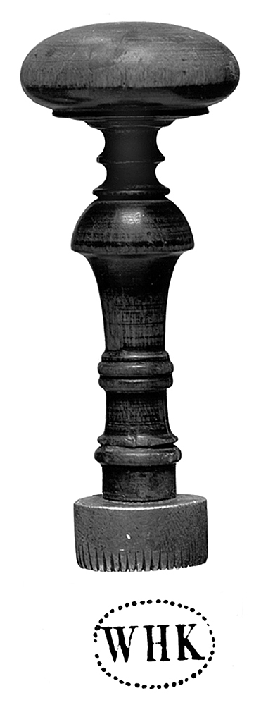 Oval tjock skiva, på vars undersida i högrelief: W H K, kring kanten en pärlrand (avtryck, se Planschverket); på översidan en kort cylindrisk skafthylsa. Skaft av björk, svarvat, balusterformigt samt svartbetsat och polerat; övre ändan avslutad i en starkt tryckt knopp. Tillhört inventarierna på Wilh. H. Kempes kontor, inrymt i Schinkelska huset, dåvarande adress Kornhamnstorg 2 (f. d. Lilla Nygatan 29, nuvarande Kornhamnstorg 4), Stockholm, 1843 -1883; därefter på firman Wilh. H. Kempes (innehavare Walther von Hallwyl och Johanna Kempe, f. Wallis) kontor, Blasieholmstorg II, 1884 - 30 September 1896, och Hamngatan 4, 1 Oktober 1896 - 1909.