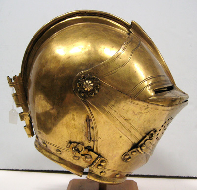 Hjälm av på utsidan förgylld koppar (?), sammanfogad av två halvor i hjälmkammen, h: ca 28 mm, som har enrundad, omvikt överdel, nederkanten formad som en närmast v-formig kantvulst, avsedd att gripa omhalskragens kant. Längs nederkanten en rad nitar med välvda, förgyllda huvuden med rester av läderklädselpå hjälmens insida. Ovanför nitraden samt på vardera sidan av hjälmkammen en filad dubbellinje. Överhjälmkammens bakre ände fäst en plymhållare, h: 118 mm i form av ett nedåt avsmalnande rör med treuppsågade rektangulära öppningar, så att fyra ringar bildas. Den övre ringen utformad som en öppen kronamed fem synliga blad, det bakre större och delat på mitten av hjälmkammen. Nederänden flikig. Vid ring två nedifrån två utvikta, konturerade löv, fästade i hjälmklockan med två förgyllda nitar vardera, bådaskadade mellan nitarna.