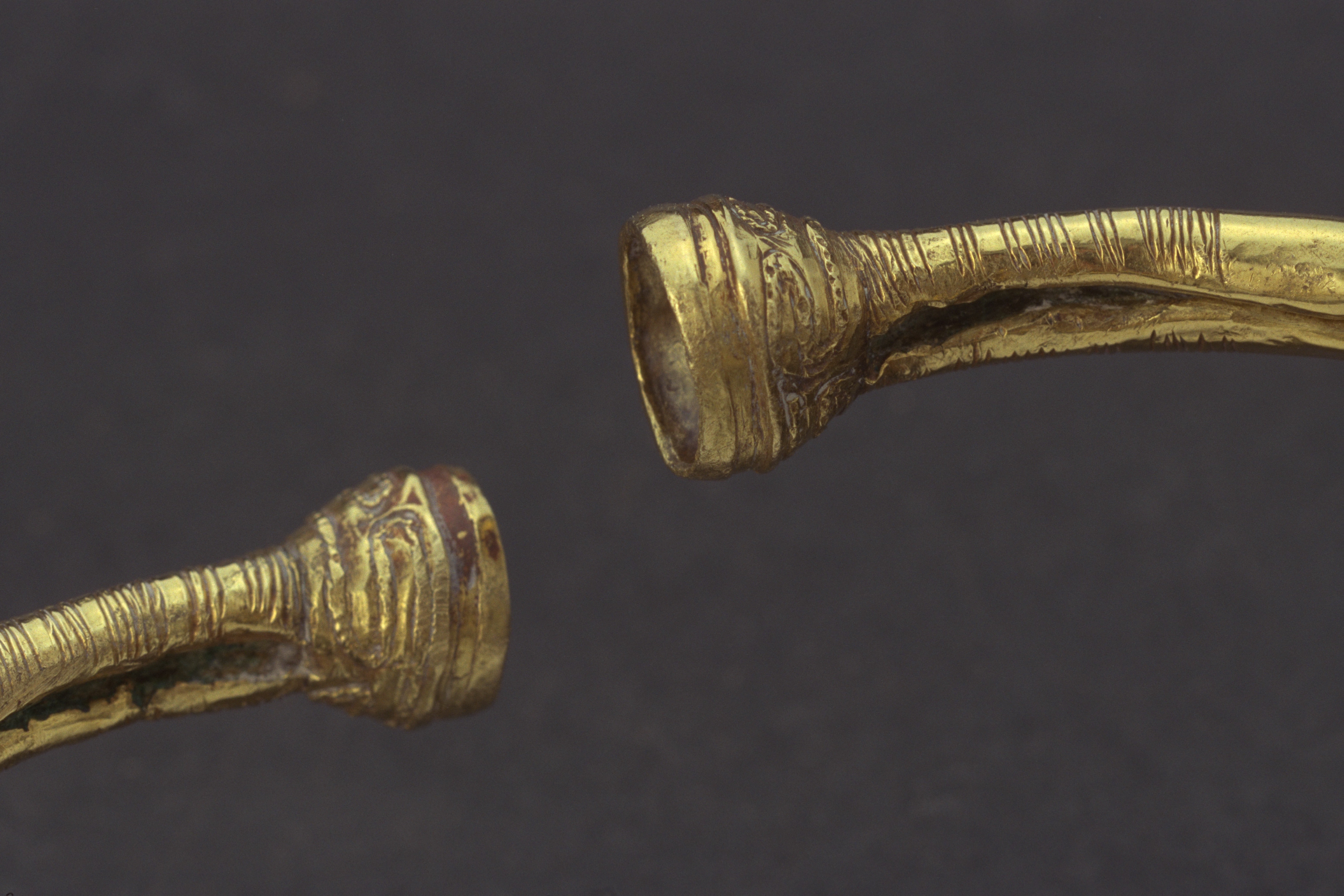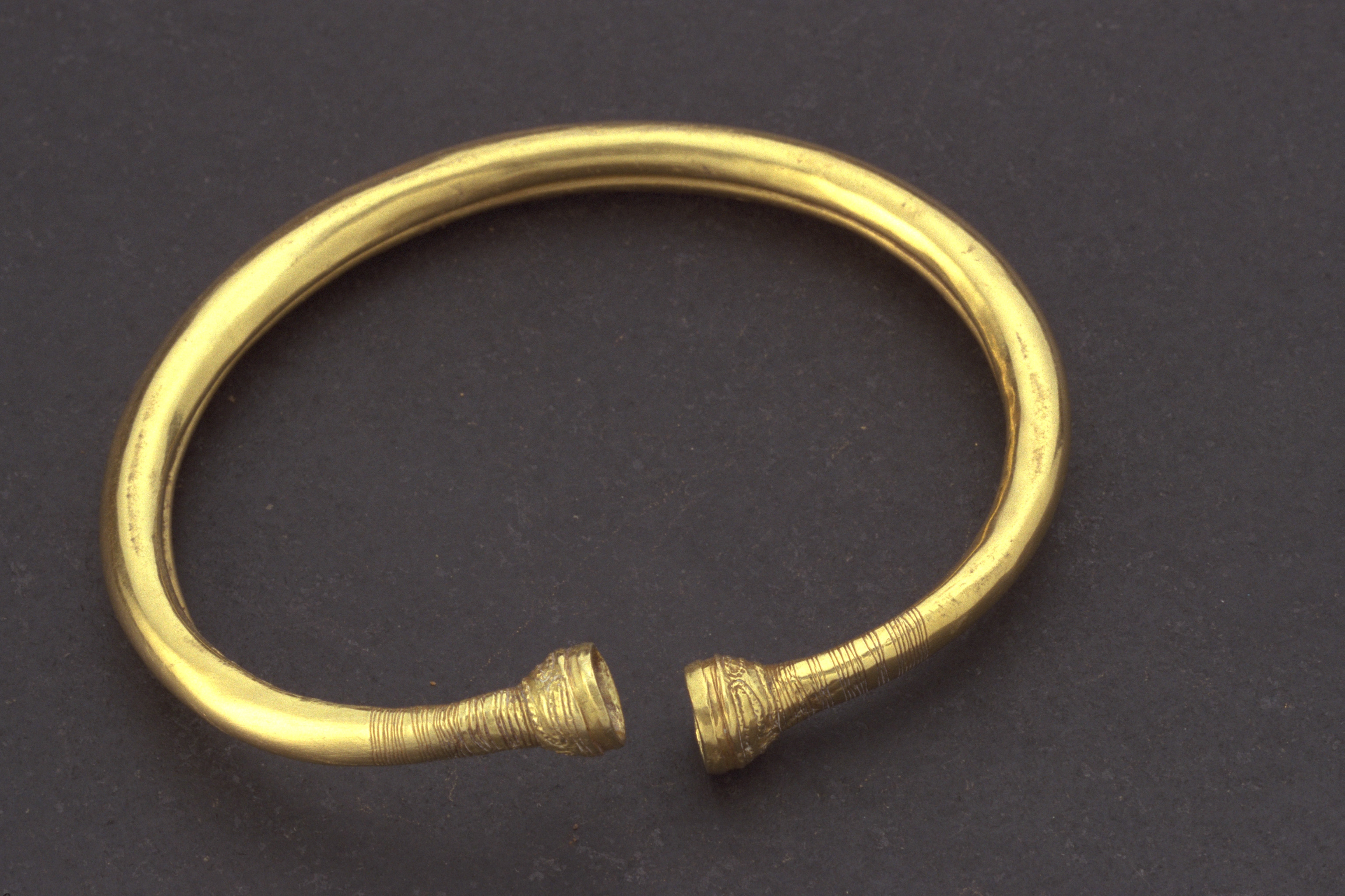 Guldbleck böjd runt kärna av brons. Armring med skålformade ändar. M per V. Funnen vid åkerarbete. Jfr MM 1306, 1304