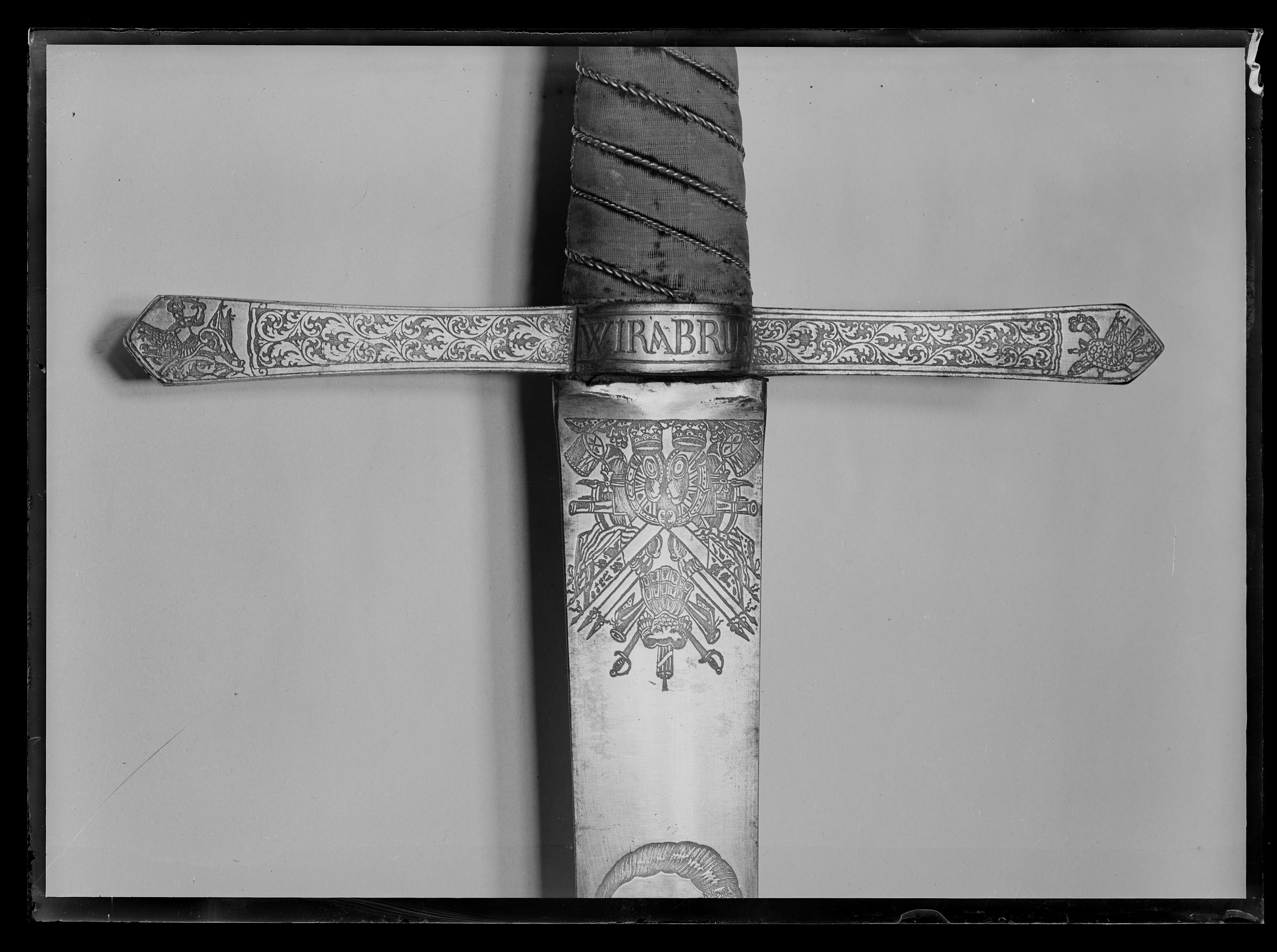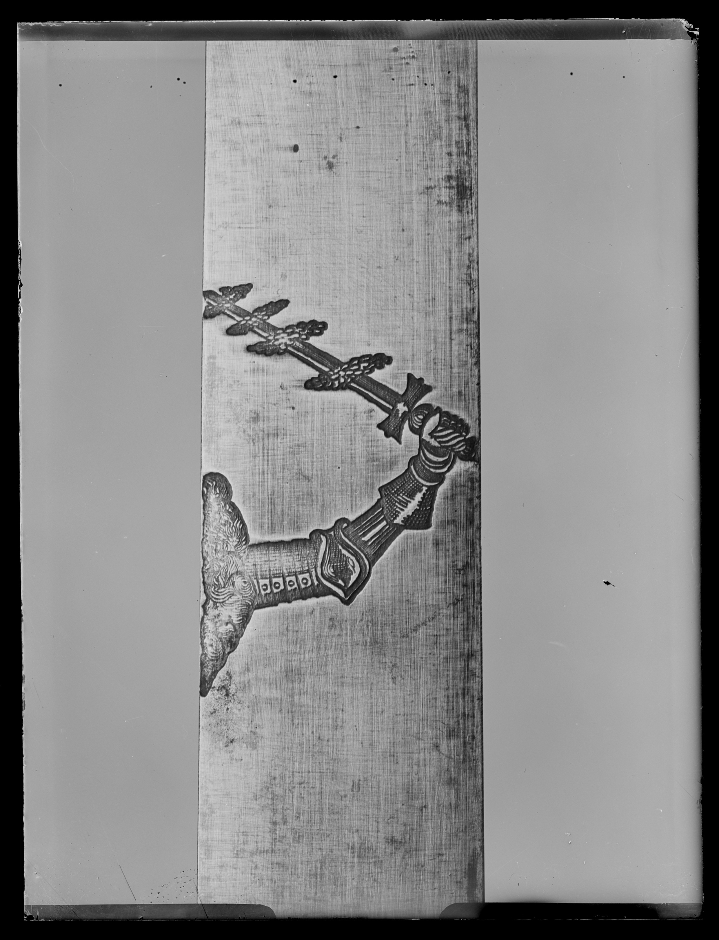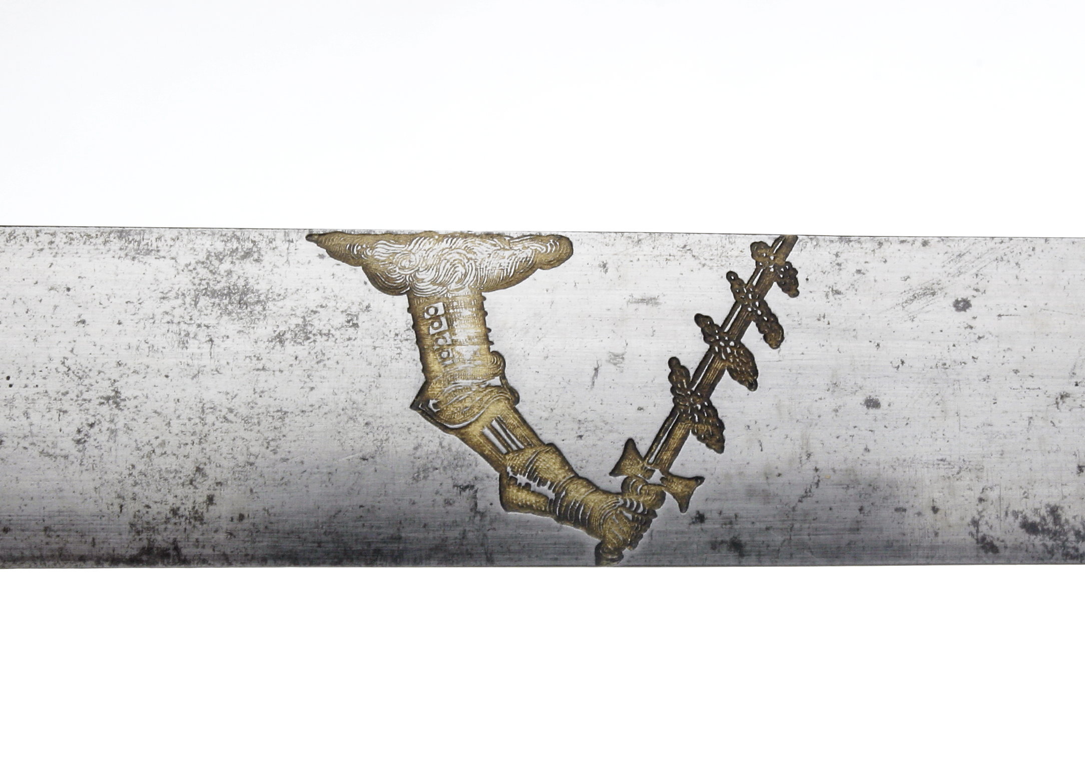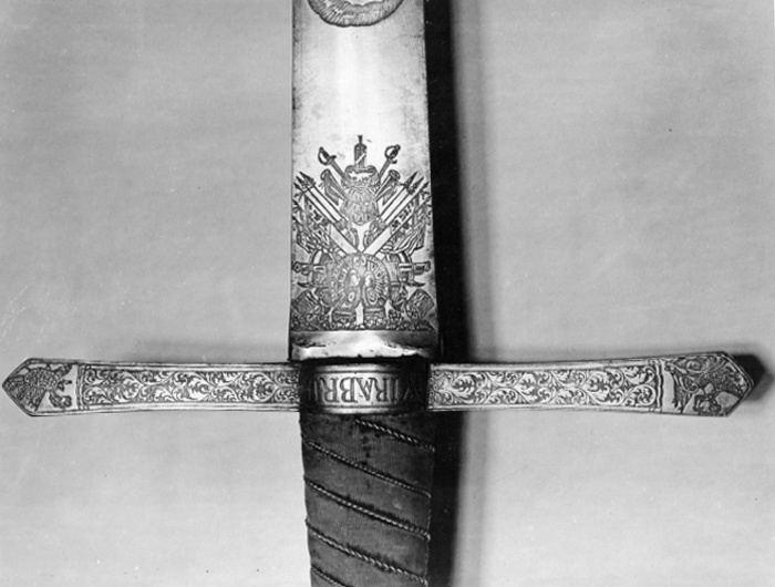 Fäste av korsform. Knapp, parerstänger och kryss av stål med etsad och förgylld ornering. Knapp av tryckt päronform, på ut- och insidan tre kungliga kronor, ställda två över en, på fram- och baksidan under kunglig krona en sköld med Göta vapen. Nitknapp tämligen vid, låg. Parerstänger raka, kraftiga, något vidgade utåt och med vinkelformiga ytterändar. Orneringen yttäckande, på utsidan akantusrankor, på insidan band-, rut- och bladmönster, ytterändarna på båda sidor med trofégrupper. Kryss lågt, format som mellanled mellan parerstängerna, på utsidan text med versaler: "WIRA BRUK", på insidan "ANNO 1750". På främre parerstångskanten: "I", på den bakre "W K" (avser klingetsaren Johan Wilhelm Kindt vid Vira bruk). Kavel klädd med blå sammet, lindad med mässingstråd. Klinga rak, tvåeggad, flackslipad. Orneringen etsad och förgylld, lika på båda sidor. Sett från basen en ca 76 mm hög trofégrupp. Därovanför med tvärställda, stora bokstäver bildade av symboliska figurer, bokstäverna fördelade utmed hela klingan: "CAROLVS".