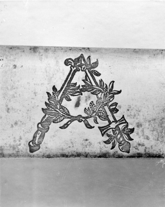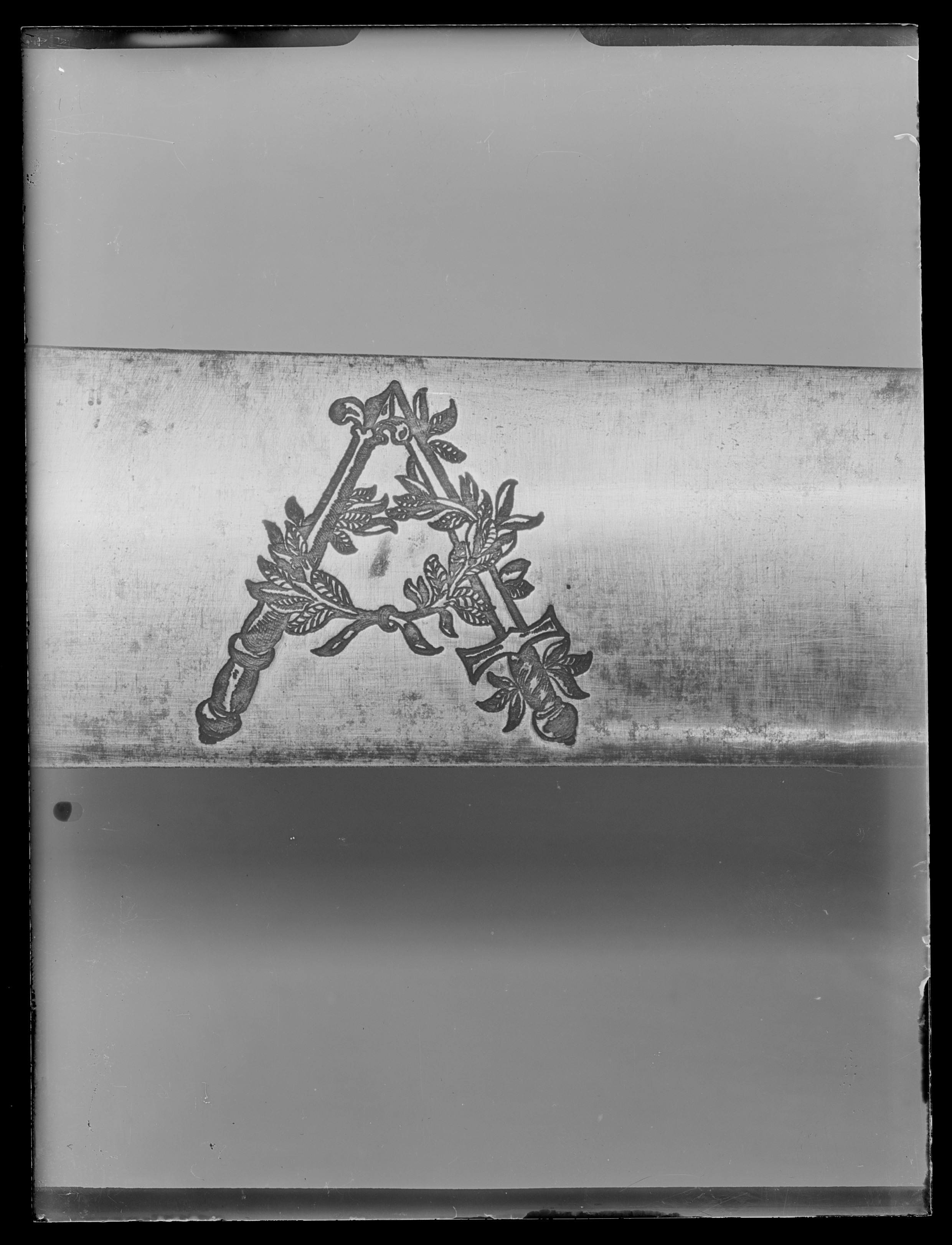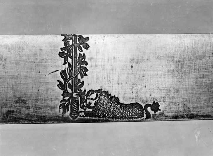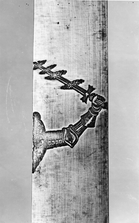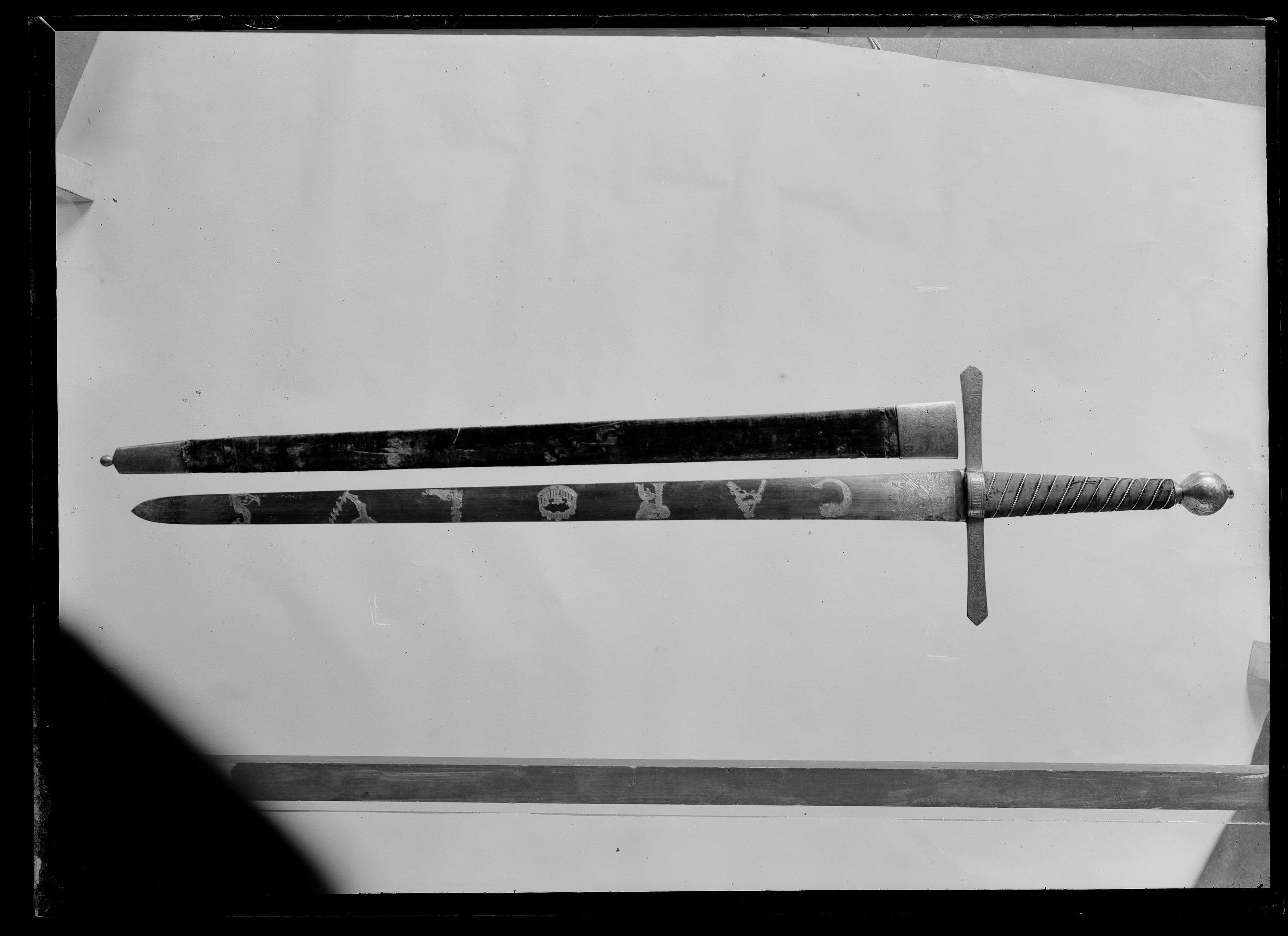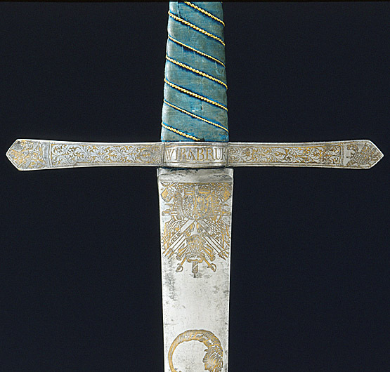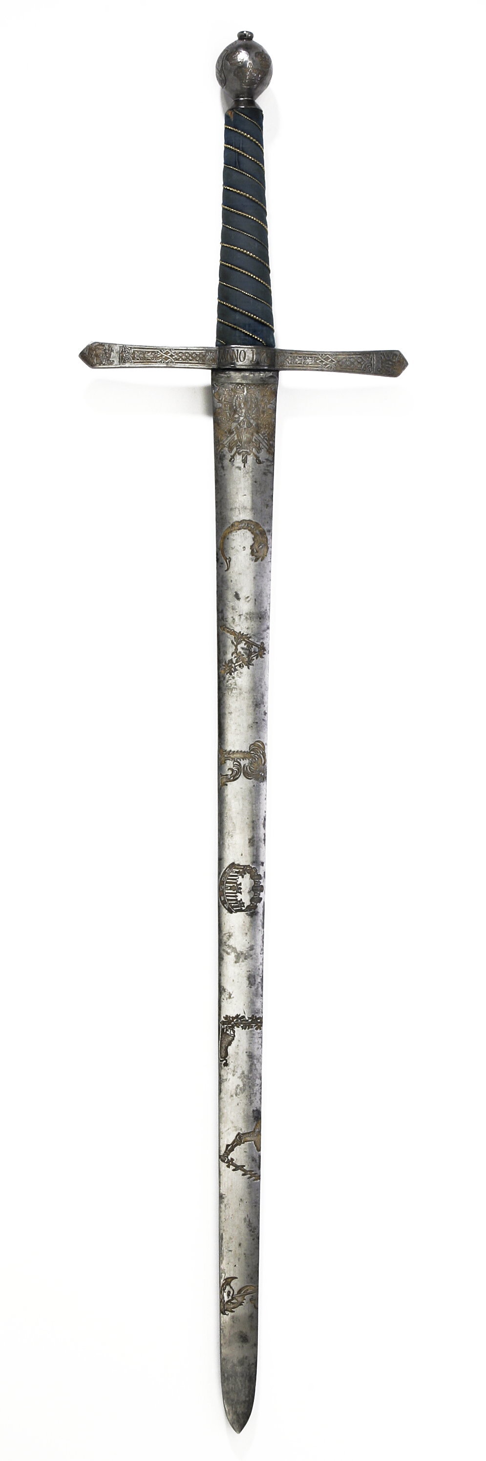 Fäste av korsform. Knapp, parerstänger och kryss av stål med etsad och förgylld ornering. Knapp av tryckt päronform, på ut- och insidan tre kungliga kronor, ställda två över en, på fram- och baksidan under kunglig krona en sköld med Göta vapen. Nitknapp tämligen vid, låg. Parerstänger raka, kraftiga, något vidgade utåt och med vinkelformiga ytterändar. Orneringen yttäckande, på utsidan akantusrankor, på insidan band-, rut- och bladmönster, ytterändarna på båda sidor med trofégrupper. Kryss lågt, format som mellanled mellan parerstängerna, på utsidan text med versaler: "WIRA BRUK", på insidan "ANNO 1750". På främre parerstångskanten: "I", på den bakre "W K" (avser klingetsaren Johan Wilhelm Kindt vid Vira bruk). Kavel klädd med blå sammet, lindad med mässingstråd. Klinga rak, tvåeggad, flackslipad. Orneringen etsad och förgylld, lika på båda sidor. Sett från basen en ca 76 mm hög trofégrupp. Därovanför med tvärställda, stora bokstäver bildade av symboliska figurer, bokstäverna fördelade utmed hela klingan: "CAROLVS".