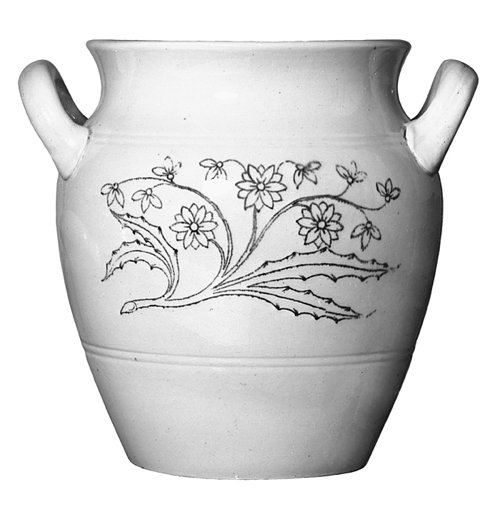 KRUKA (sylt-) Av stengods ("stenmassa") med vit glasyr. Tunnformig, med plan botten, utsvängd mynningskant samt två öron. På utsidan två grupper insänkta ränder med två i varje grupp, en i höjd med öronens fästen och en nedtill; mellan randgrupperna på två motsatta sidor en blom- och bladornering i blå konturteckning under glasyren. Öron flackstaviga, ögleformiga och snett utstående. Höjd: 24,4 cm.; diameter: 21,7 cm. Svensk tillverkning; Gustavsberg.