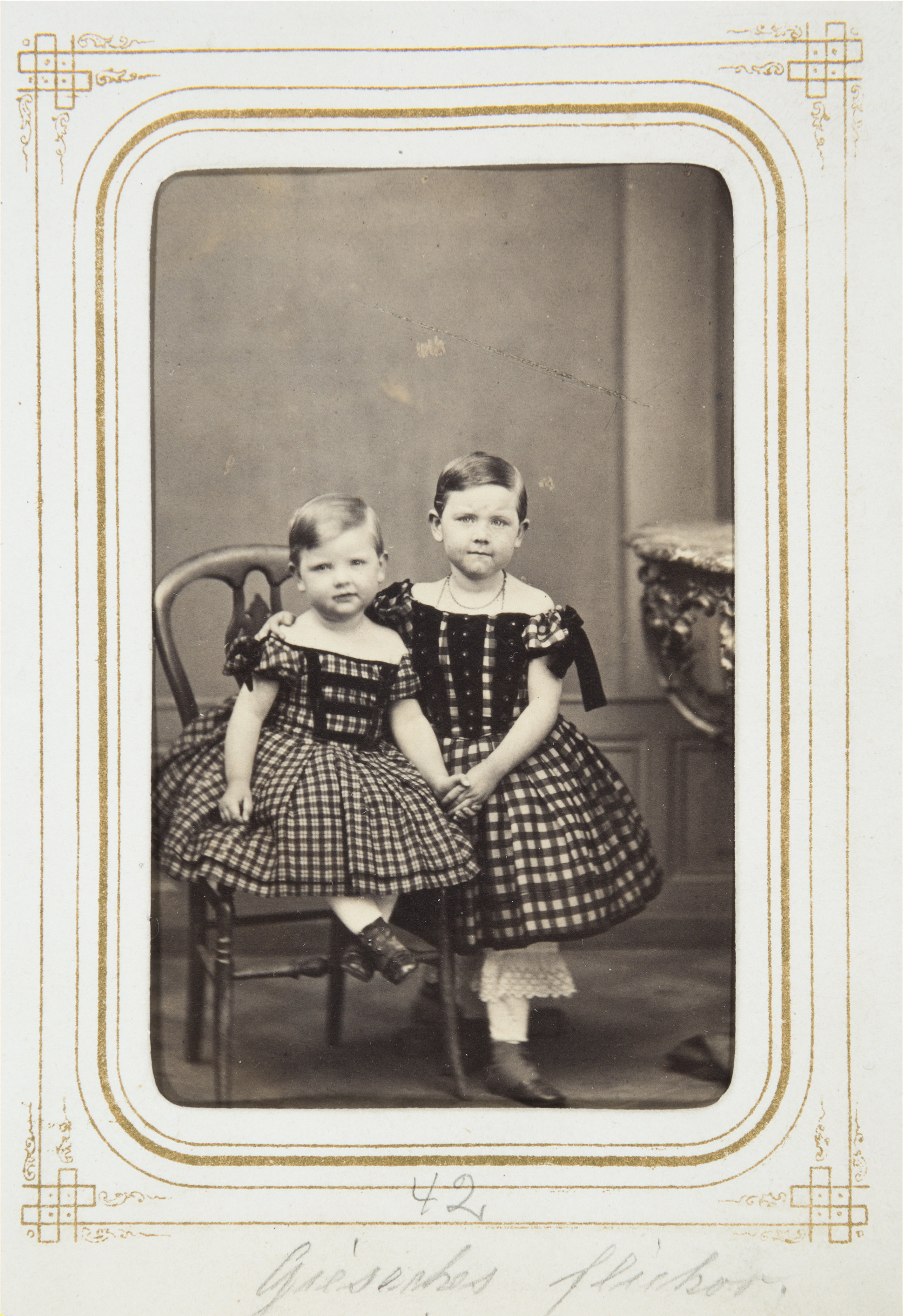 Biografi. Fotografiporträtt. 101 porträtt i album. GIESECKES FLICKOR (två stycken). Erhållet av Johanna Kempe, f. Wallis på 1860-talet. 26,5x20,7x4 cm.