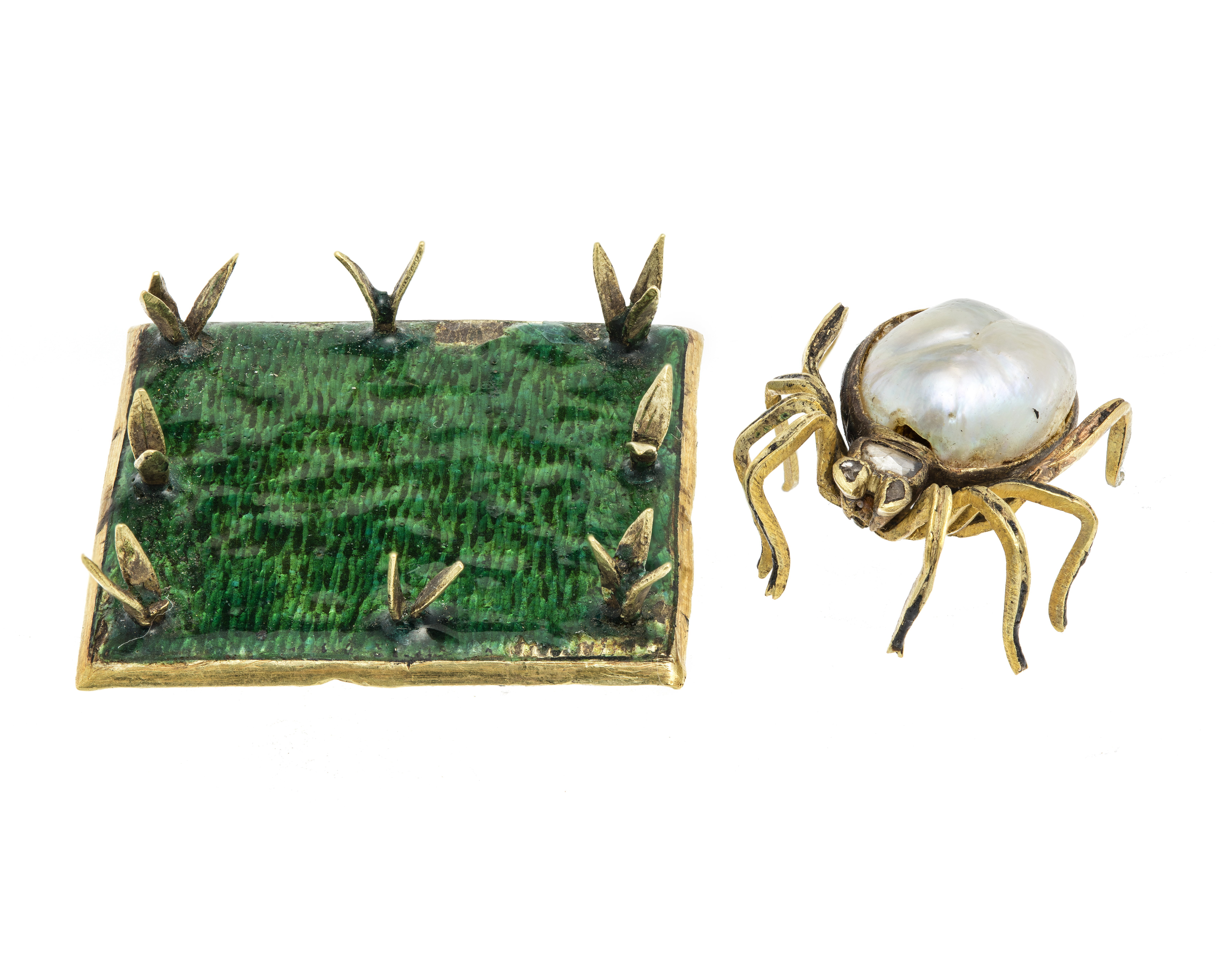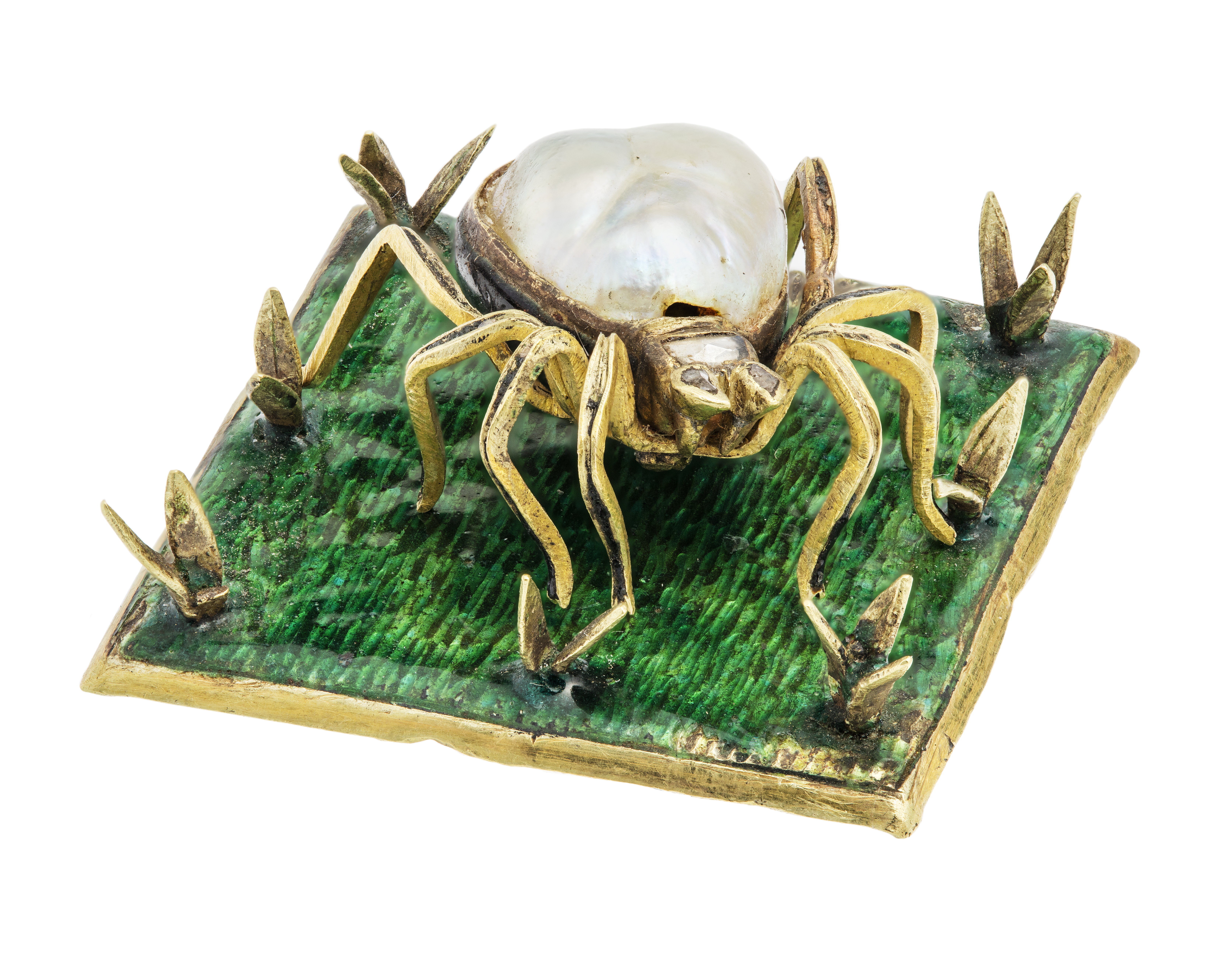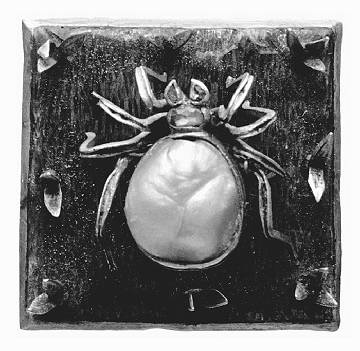 SPINDEL med fotskiva. Av guld med barockpärla, rosenstenar samt emalj. Spindeln med benen av guld, med rester av svart emalj, bakkroppen (abdomen) bestående av en stor barockpärla, undersidan konvex av svart emalj, huvud och vadera mundel med en rosensten. Diameter med ytterring: 8,3 cm. Plåt, diameter: 7,8 cm. Fotskiva: Av förgyllt silver, kvadratisk med fasade nedviken kant, översida belagd med grön emalj på gräsliknande bottenmönster. Vikt: 3,7 gr. Sidlängd: 2,6 Antaglien ryskt arbete från 1700-talet. Inköpt av Wilhelmina von Hallwyl september 1896 från antikvitetshandlaren Ed Kahlert, Tyskland.