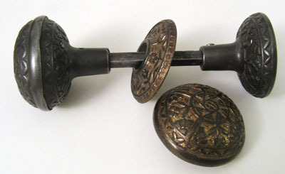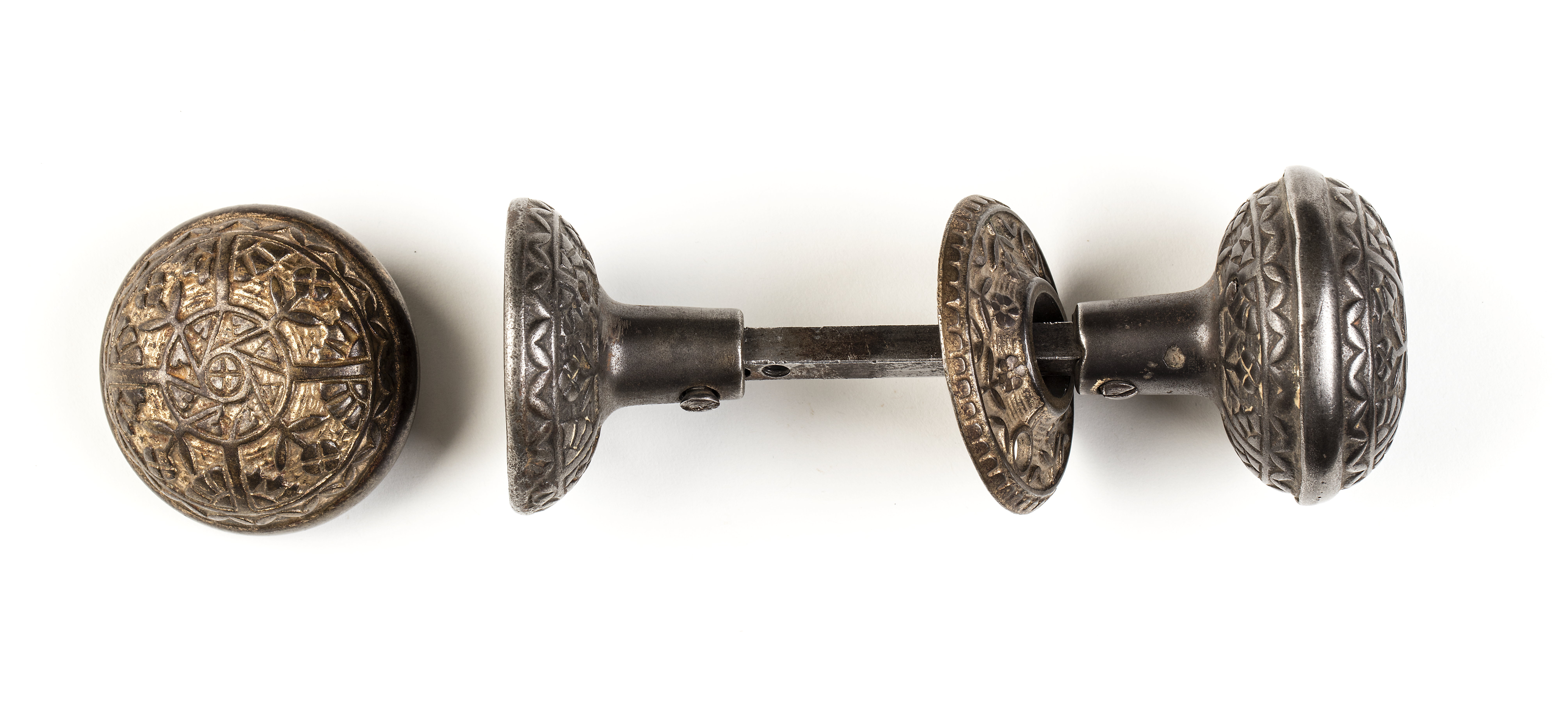 Av stål med rester av förgyllning. Bestående av sex delar. På fyrsidig axel löst hängade cirkulär bricka. I ändarna knoppformiga vred av två kupiga halvor, sammanfogade med skruvar från insidan. Bricka och vred med blommor och blad i relief samt kantbårder med rester av förgyllning.