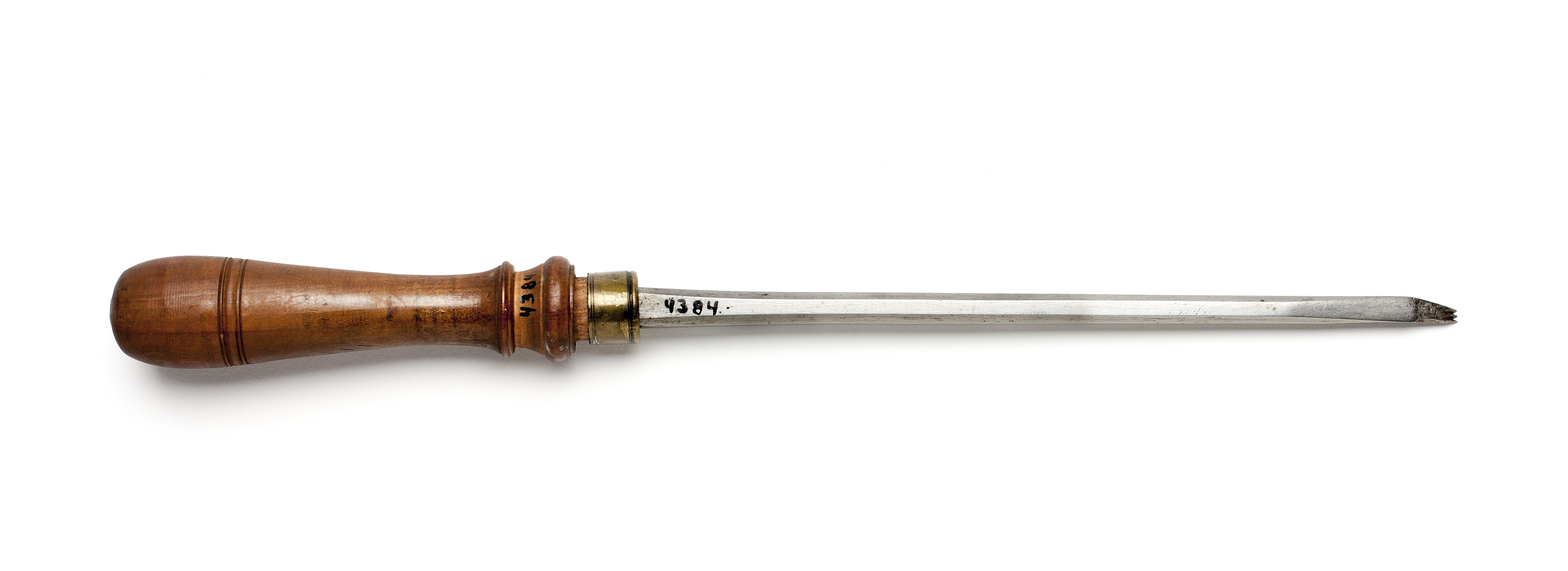 Klinga med åttkantig genomskärning, i änden tillplattat. Stämplat på klingan: "IK" under krona, Johan Kesemaker, Stockholm, samt "2". Rak, tretandad egg. Svarvat skaft av päronträ, med två vulster nedtill ("rydboholmstyp"). Mässingsring. Stämplat på skaftet: "NB" under krona