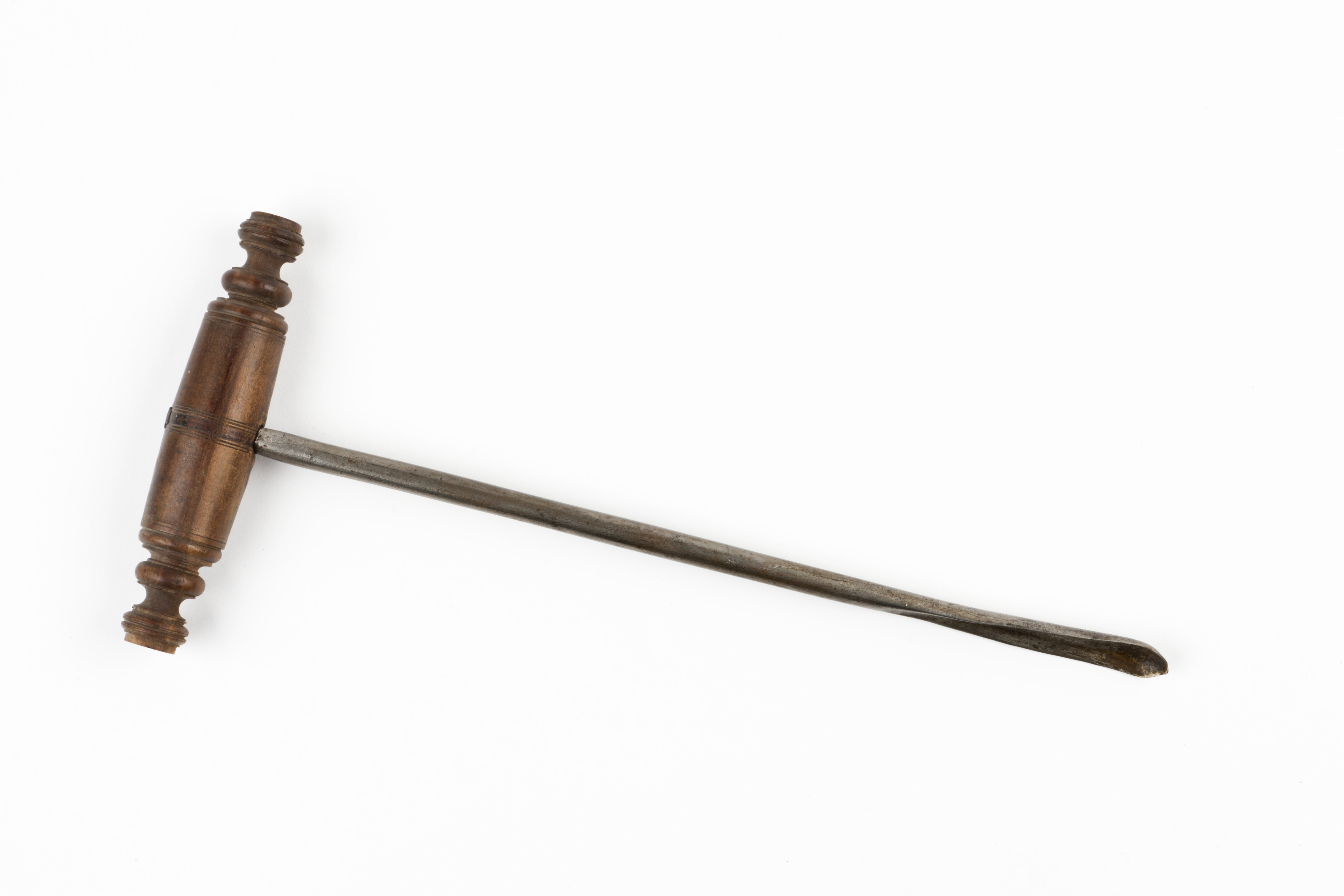 Borren nitad i svarvat, profilerat handtag av päronträ. Stämpel: fisk.