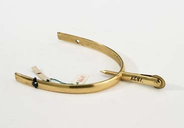 Sporre av förgyllt stål. U-formade släta, på utsidan konvexa skänklar med tvära ändar, försedda med hål. På insidan mitt för halsen en 16 mm lång spets avsedd att fästas i klacken. På ena skänkelns insida stämpel: S inom hästsko. Rak rundstavig hals 30 mm lång. Liten rund slät klinga 12 mm i diameter.