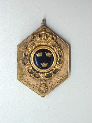 Sexkantig bricka av förgylld mässingsplåt, på framsidan rundel, täckt med blå emalj, därpå fäst tre kronor av mässing. Dubbel kant, repstavsring och därutanför slät ring, krönt av kunglig krona i relief, rundeln omgiven av serafimerkedjan med kors, längs kanten på båda sidor om korset graverat: "Courir Bricka". På baksidan graverat: "N:O 24". Därnedanför samt på övre spetsen öglor av mässing. Brickan av gustaviansk typ.