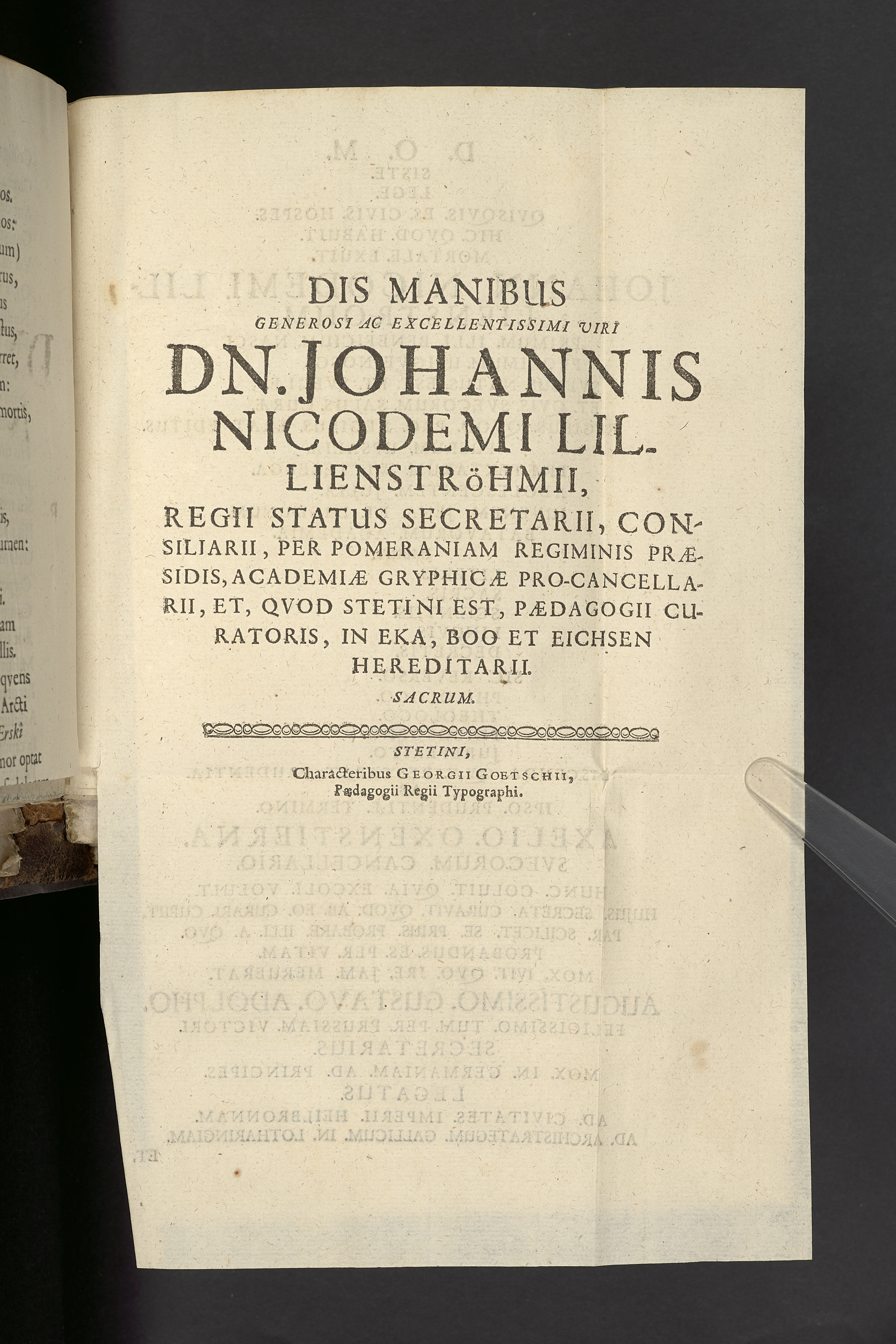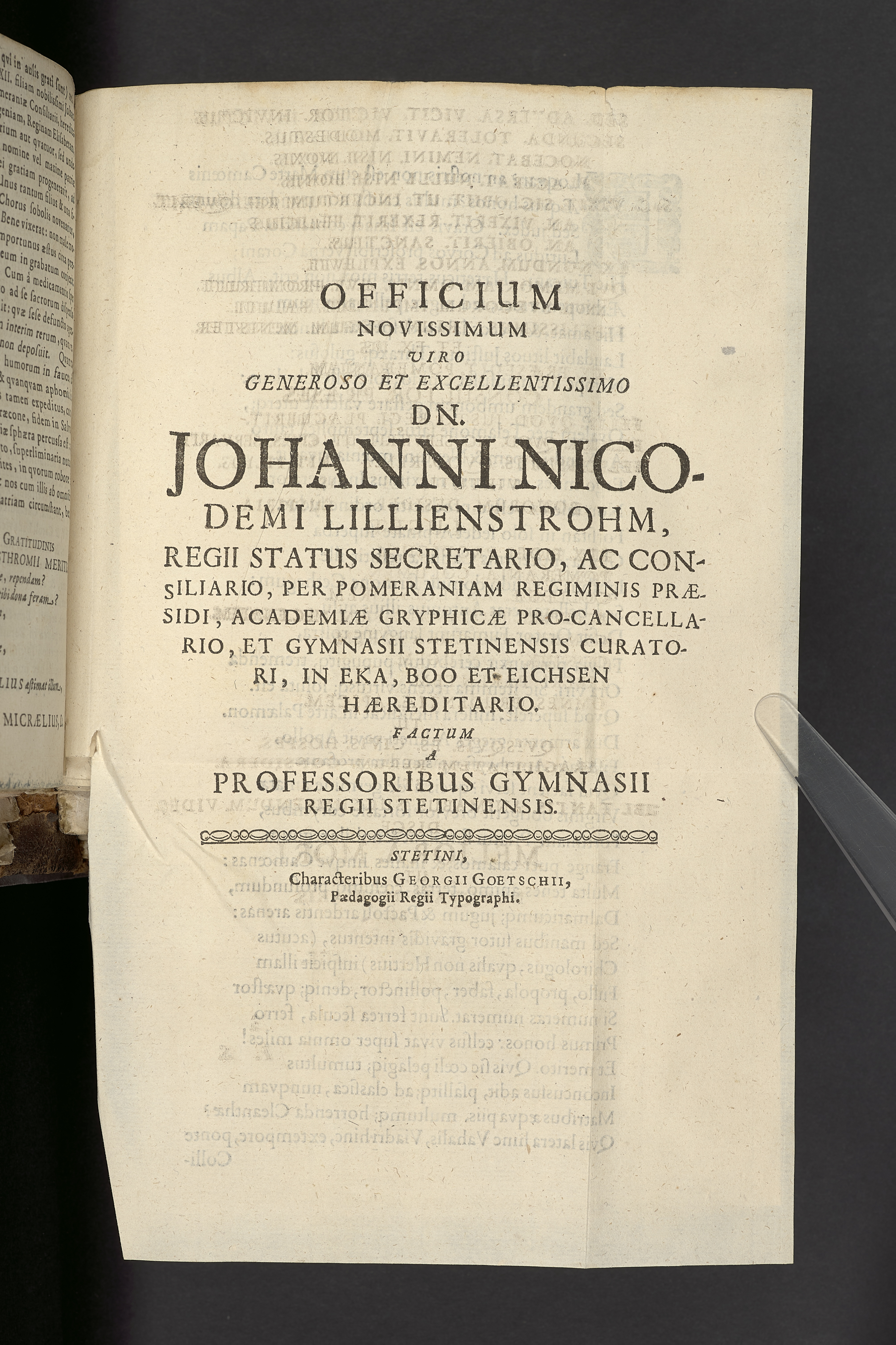Officium novissimum ... Dn. Johanni Nicodemi Lillienstrohm, regii status secretario ... in Eka, Boo et Eichsen hæreditario. Factum a professoribus gymnasium regi Stetinensis. Stetini, characteribus Georgii Goetschii ...