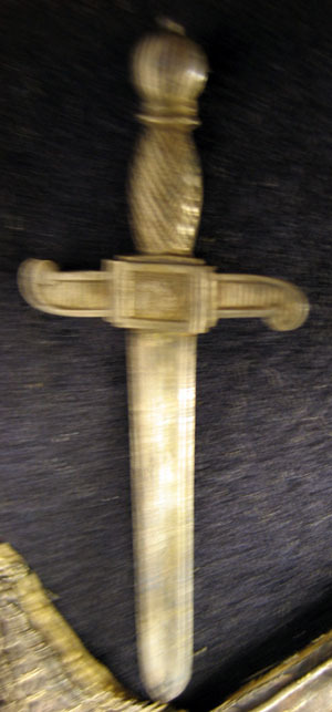 Bröstsvärd av silver. Utformat som ett riktigt vapen. En 37 mm lång klinga med en mittås med jämnbreda mötande skär. Två parerstänger med volutavslutande kanter. Mellan parerstängerna ett rektangulärt kryss med en blomma mitt på. En kavel, 15 mm, med snedställda etsningar. Nederst en knapp med en mittknapp.