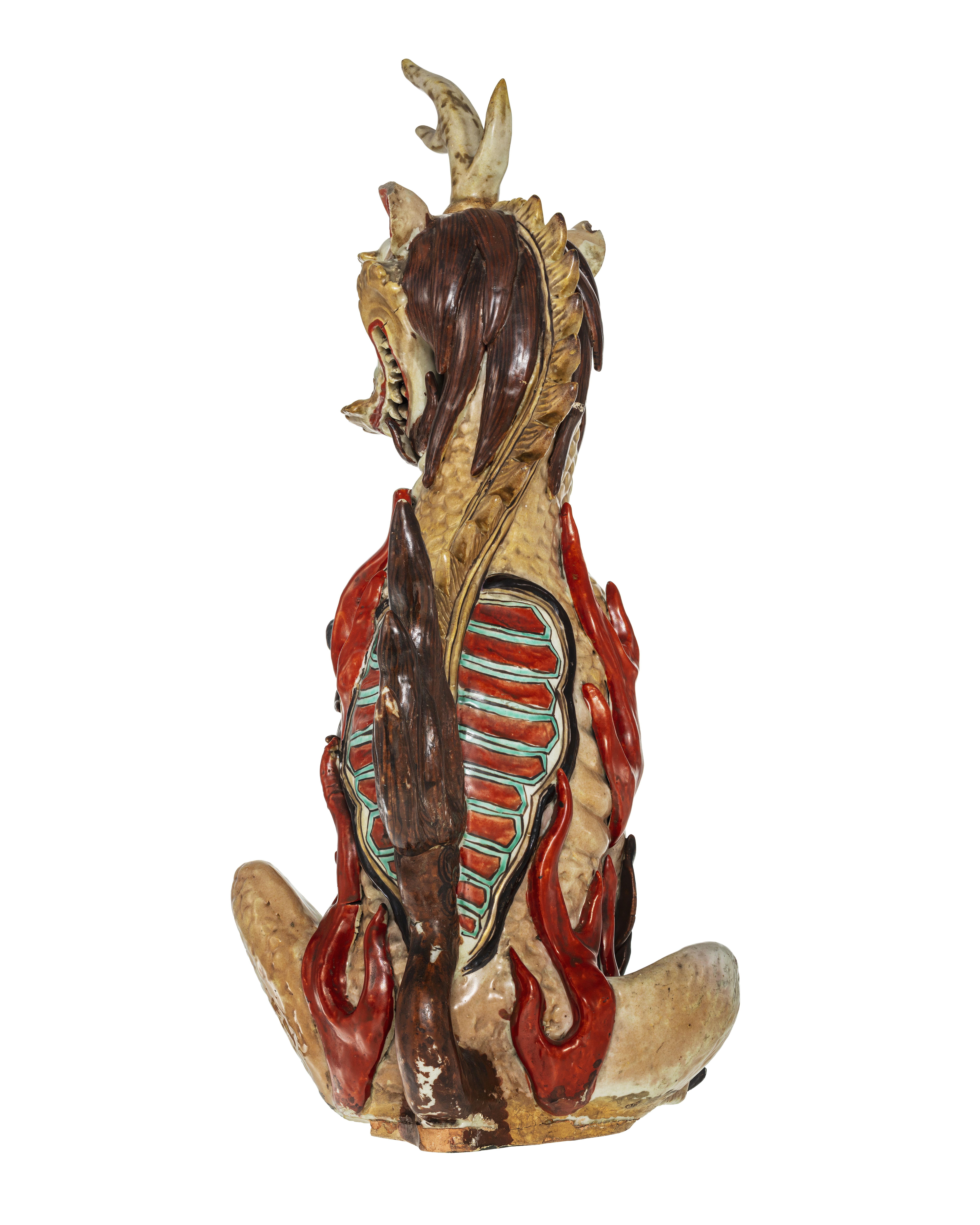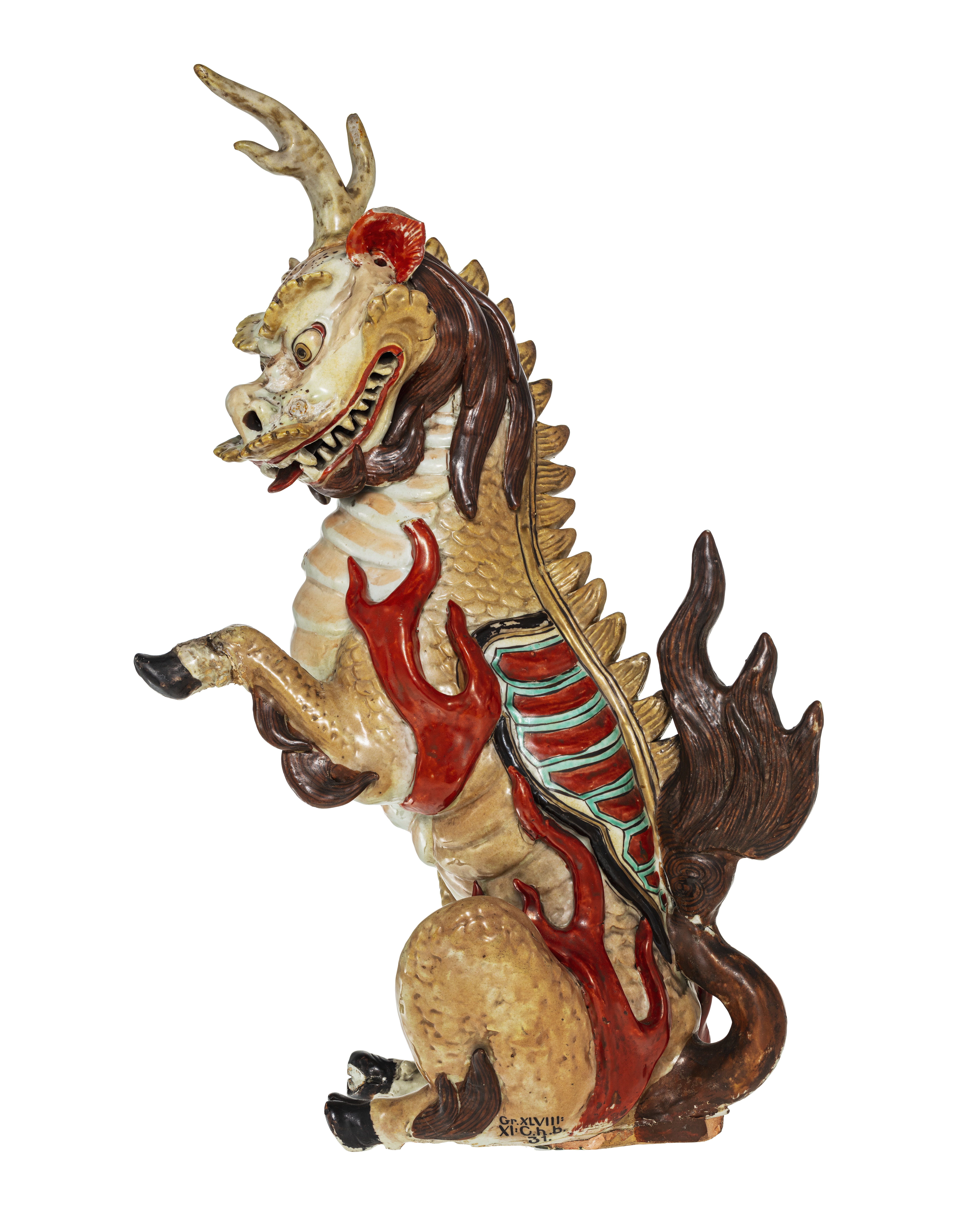 FIGUR. Qilin, fabeldjur med drakhuvud, hjortkropp med fjäll, oxsvans, klövar samt ett horn i pannan. Sittande med vänstra frambenet upplyft. Dekorerad i ljust brungrått, guld, gulgrått, grönt och brunrött. Qilin var en lyckobådande varelse som förde med sig välstånd, fred, skydd, ett långt liv och fertilitet. Detta kan kopplas till varelsens ursprungliga förekomst, vilket sades vara när en viktig lärd person eller välgörande ledare föddes eller dog. Enligt en populär berättelse förutspåddes födseln av den vise filosofen Konfucius genom ankomsten av en qilin. De här magiska djuren har huvud och fjällig kropp som en drake, lejonsvans och kluvna hovar som en hjort. Kroppen är ofta, som här, höljd i heliga flammor. Qilin.Porcelain figure of a qilin decorated in overglaze enamels Qing dynasty, mid 18th century Qilin are auspicious creatures who bring prosperity, peace, protection, long life and fertility. These qualities are linked to its original appearances, said to occur when the birth or death of a great scholar or beneficent ruler took place. A popular story says that the birth of the philosopher sage Confucius was foretold by the arrival of a qilin. The magical animals have a head and scaly body like a dragon, the tail of a lion and cloven hoofs like a deer. Its body is often enveloped in sacred flames, as here.