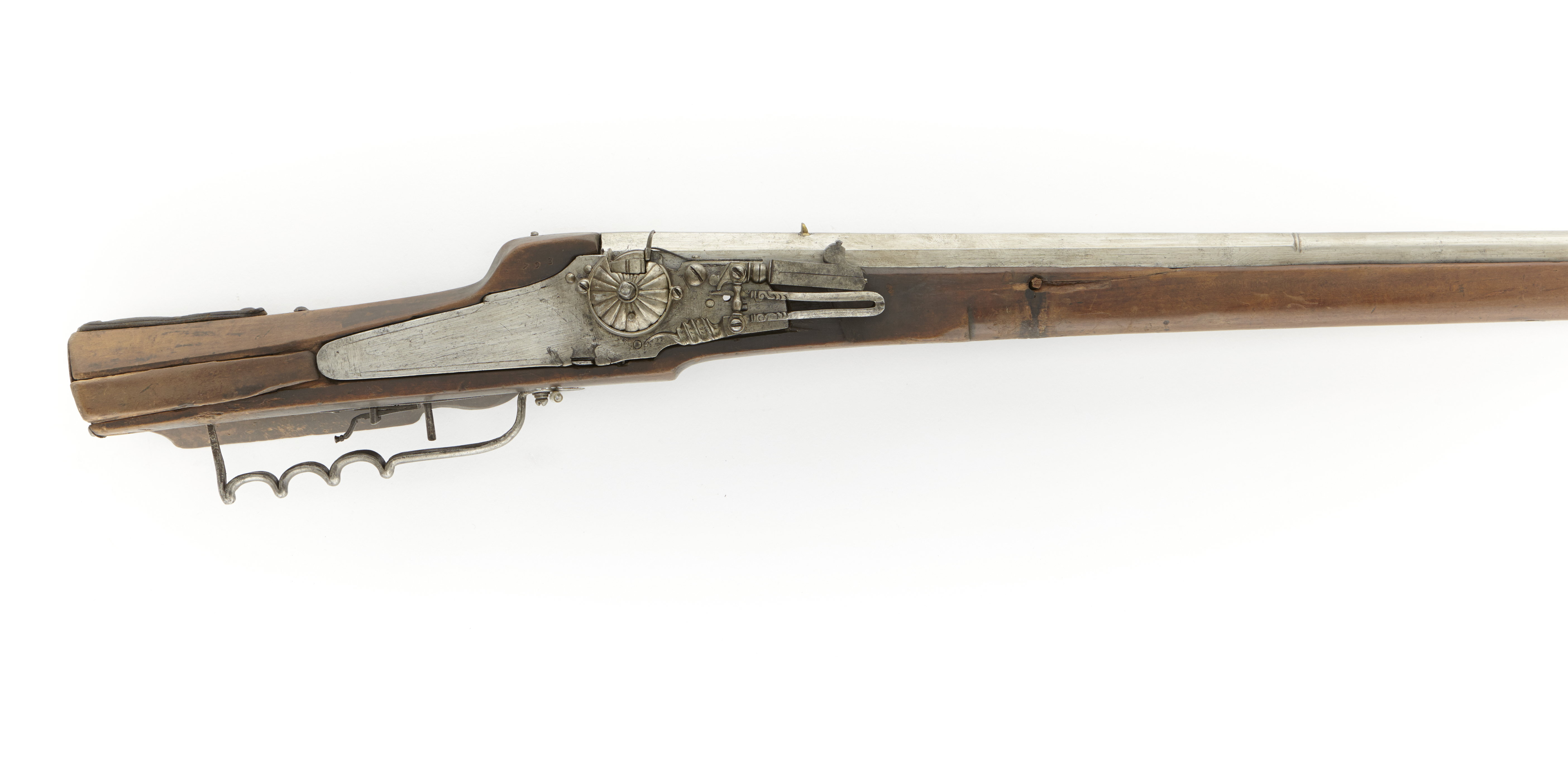 Rund, över kammaren åttkantig pipa av stål. Slätborrad. Ståndsikte och knoppkorn av mässing. Två stämplar på kammarens ovansida, framför siktet en stjärna, bakom siktet en rund stämpel med en treflikig krona? Tre häften. Hjullås med plant låsbleck av stål, tysk typ, bakåt avsmalnande genom två fall. Hjulet täckt av högt hjulhus med godronnerad yta.Mycket låg krutskärm. Hanen avbruten ovanförhanhalsen. Tryckknapp med runt huvud med mittskåra. Brun helstock av trä med smal kolv av tysk typ. Kolvlåda med lock av trä och bakplåt av stål. På kolvryggen är fastspikat en läderbit. Två fyrkantiga låsbrickor av ben. NÄSBAND AV GRAVERAT BEN. Två av pipstiften fäster stålband. Bakre låsskruven har en ring. Varbygel av stål med 3 fingerlägen. Avtryckaren har en skjutbar regel. Tillbehör: Ett halvcirkelformat stålband i kolvlådan (fäster bakre pipstiftet, nu söndrigt). Märkt: 793 ovanför låsblecket, stanstyp 5376. 1710 års inventarium p. 5, rum I: "117-793-1 Liten Hagelbyssa med Hiulåås".