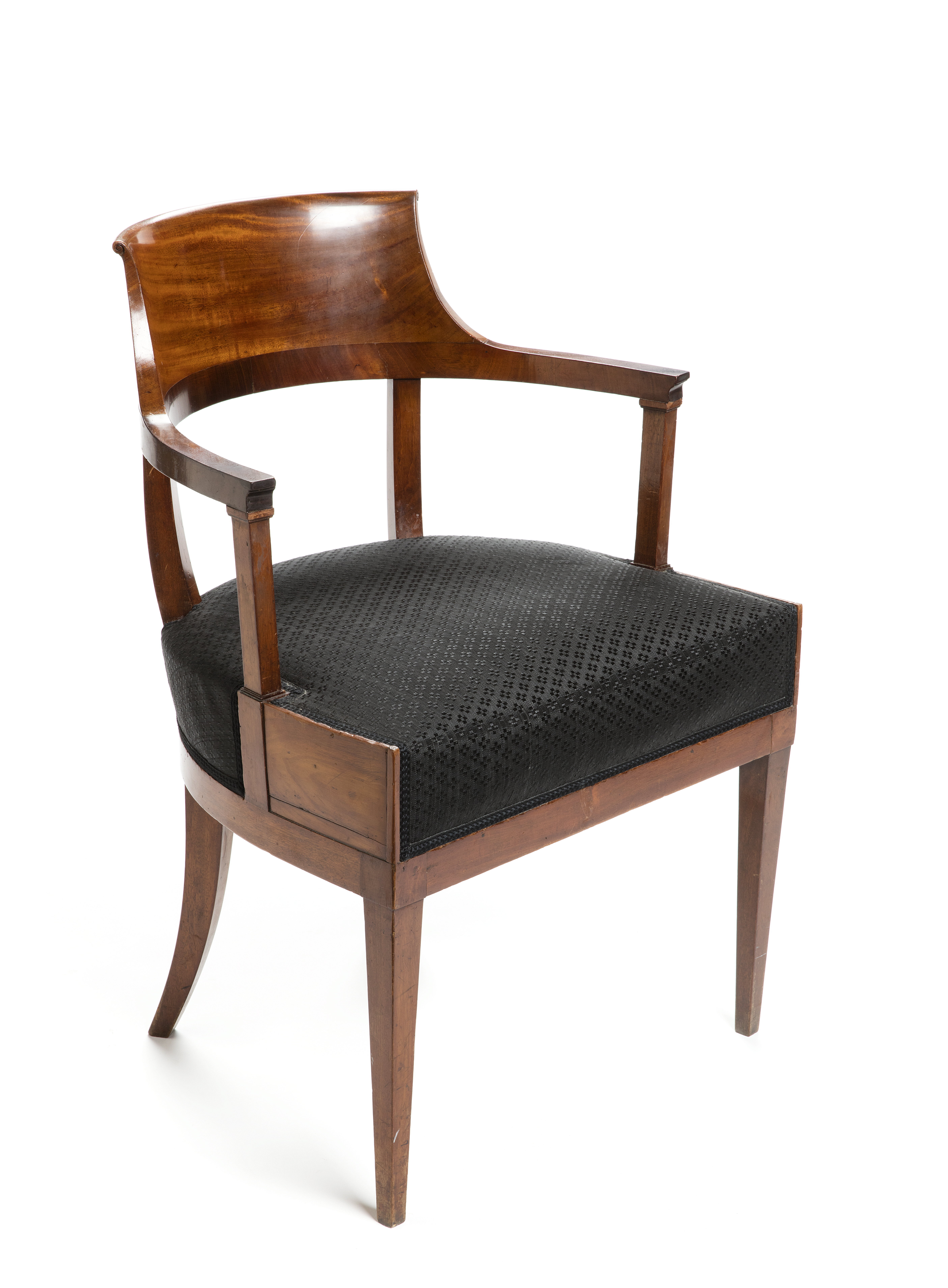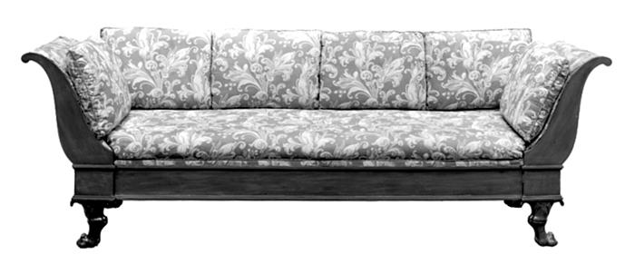 - (Kammarjungfruns rum och Källaren under Stallet.) Bestående af soffa och tolf länstolar. Af mahogny. Dels massiv, dels fanerad på blindträ af furu samt polerad. Stoppad med tagel och klädd, soffan med bomullskretonn, stolarna med rödt ylle ripstyg. Soffa: Aflång, med lösa gaflar och sidostycken, fyra låga ben, lös sits samt lös dyna och sex lösa kuddar. Gaflar starkt utsvängda, utsidan med liggande faner, ändarna med stående; insidan stoppad och klädd. Sidostycken raka, med raka kanter, främre sidostycket med liggande faner, det bakre ofaneradt, längs öfre och nedre kanten å det förstnämnda en pålagd profilerad list, fortsättande på gaflarna. Ben snidade, i form af lejontassar, vända utåt gaflarna, öfre delen bladornerad. Gaflar och sidostycken sammanhållna af från de senare utgående tappar, fasthållna i gaflarna medels skrufvar. Sitsen bestående af en på bredsidan liggande ram, i denna en gles flätning af breda sadelgjordar. Dynan afpassad efter bottnen, kuddarna rektangulära. Tyget (kretonnen) med ett mönster i blekt ljusrödt mot röd botten och bestående af tvärgående stora bladrankor med stora blommor. Kring kanterna å kuddarna en kordong i tygets färger. Höjd: 0.85 m.; längd: 2.67 m.; bredd: 0.69 m. Sits, höjd: 0.385 m.; längd: 2.045 m.; bredd: 0.69 m. Kuddar, längd: omkring: 0.57 m.; bredd: 0.4 m. Länstolar: Med fyra ben, sarg, sits, armstöd och rygg. Ben fyrsidiga, afsmalnande nedåt, de främre raka, de bakre utsvängda bakåt. Sarg med raka kanter och rak framsida, sidosidorna och baksidan sammanlöpande i en halfcirkelformig båge; ofvanpå sargen framtill å hvardera sidosidan en liggande rektangulär, fyllningliknande skifva i smal ram.. Sits med stoppningen liggande på en tät flätning af breda sadelgjordar. Armstöd rätvinkliga. Den stående delen fyrsidig, rakt uppstående. Den liggande , delen likaledes fyrsidig, främre ändan något framskjutande öfver den stående samt profilerad, bakre ändan sammanlöpande med ryggens bakstycke. Rygg med två stolpar i samma stycke som bakre benen samt fyrsidiga, svagt utsvängda bakåt och något afsmalnande uppåt, ofvanpå dessa ett bredt ryggstycke, som tillsammans med armstödens liggande delar bildar en båge som sargen; ryggstödet med ändarna insvängda samt sammanlöpande med armstödens öfversida, öfre kanten stafformigt utsvängd bakåt. Höjd: 0.795 m. Sits, höjd: 0.45 m.; bredd: 0.545 m.; djup: 0.443 m. Emottagen af Johanna Kempe, f. Wallis, som arf efter hennes mor, Johanna Friederika Catharina Wallis, f. Wallis 6 Januari 1794 i Stralsund, d. 5 Januari 1862 i Stockholm, gift 9 Juni 1813 i Stralsund med grosshandlaren Albrecht Baltzer Wallis, f. 7 Mars 1788 i Stralsund, d. 11 April 1836 i Stockholm. Enligt uppgift af Johanna Kempe, f. Wallis, inköpt af Albrecht och Friederika Wallis, f. Wallis, efter en diplomat i Stockholm på 1820—1830-talet. Ursprungligen klädd med sidentyg, som 1865 skänktes till Wilhelmina von Hall-wyl, f. Kempe. ( Soffan reparerad hos snickaren C. H. Benckert J:r, Regeringsgatan 63, Stockholm, se räkning 1895—i899> utställd på Wilhelmina von Hallwyl. Betaldt 7 November 1900, se Rescontra (Walther von Hallwyl och Johanna Kempe). Pris: Kr. 23, se räkning. Länstolarna reparerade hos snickaren C. H. Benckert J:r, Regeringsgatan 63, Stockholm, se räkning 1895—1899» utställd på Wilhelmina von Hallwyl. Betaldt 7 November 1900, se Rescontra (Walther von Hallwyl och Johanna Kempe). Pris: Kr. 55, se räkning.