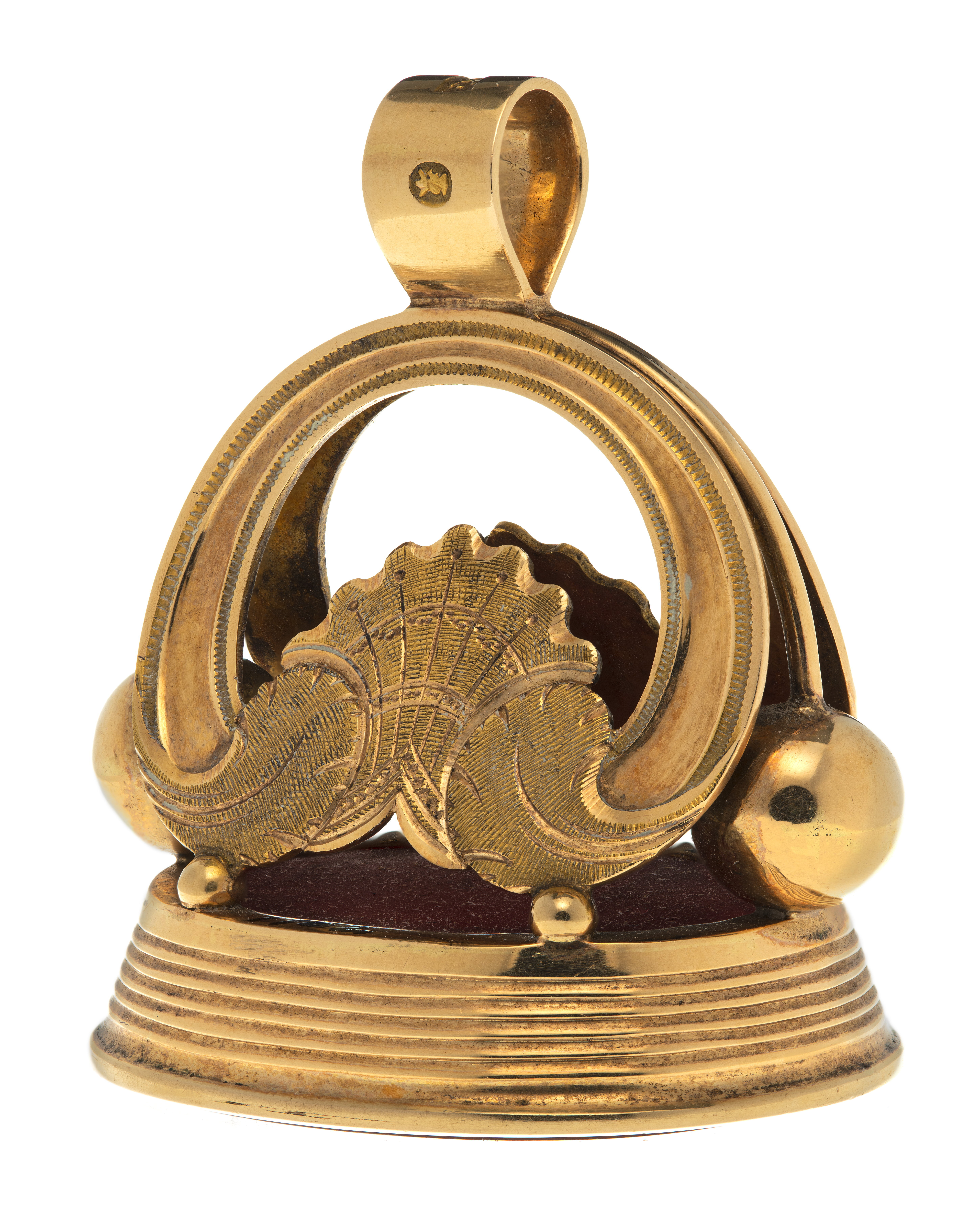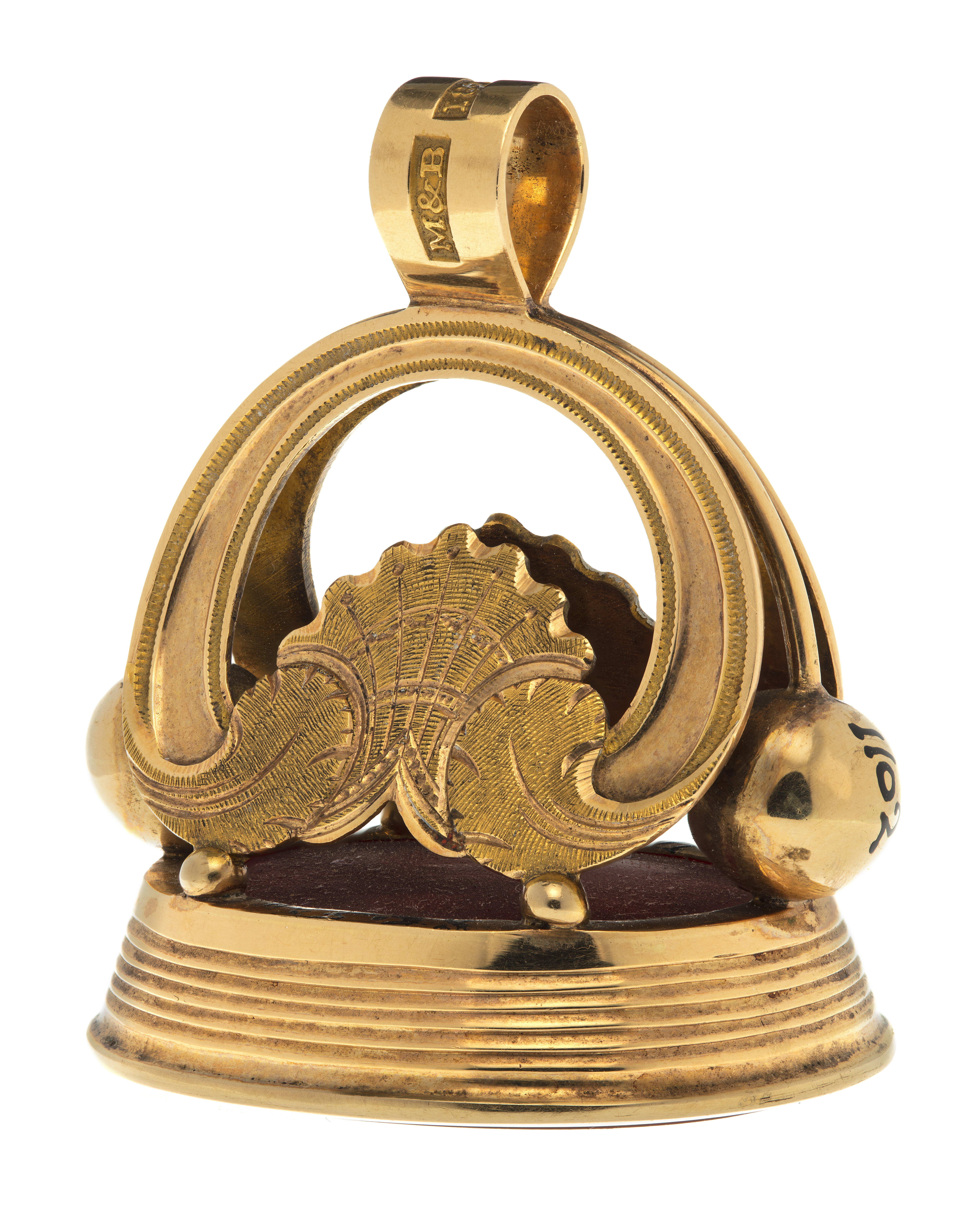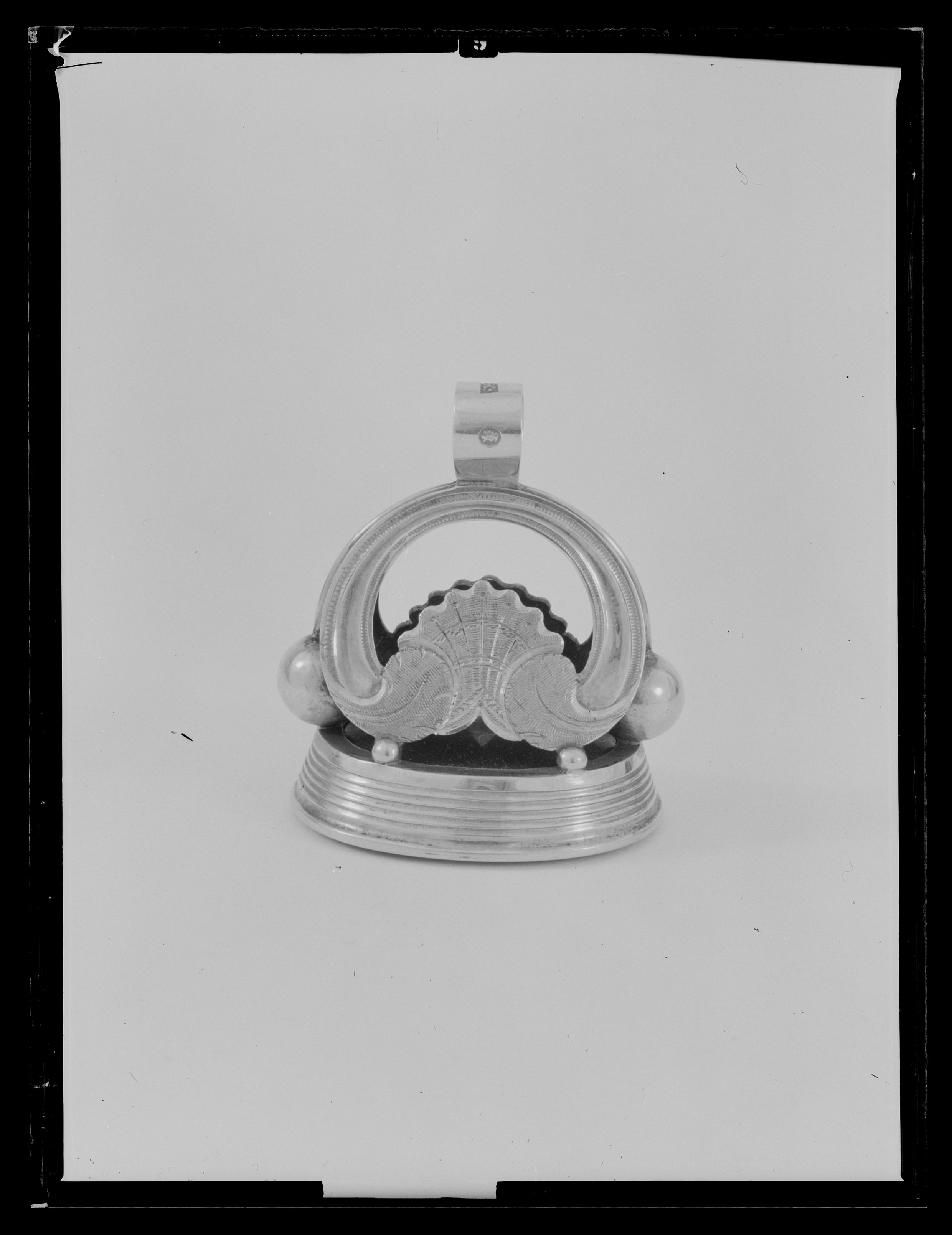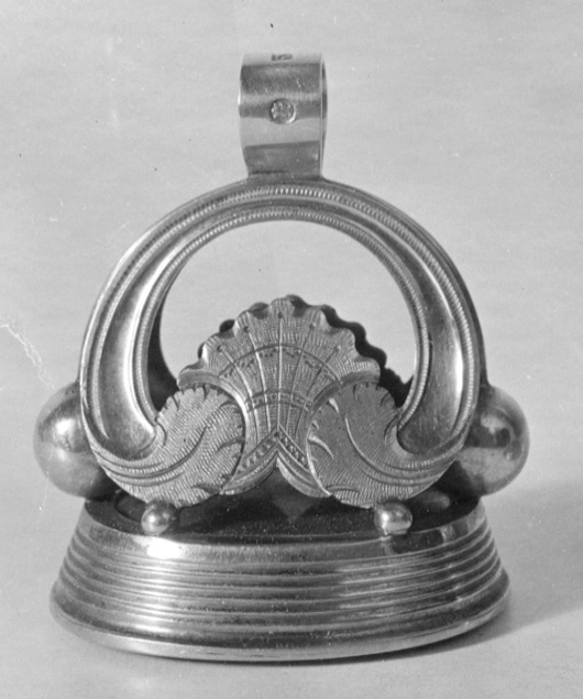 Oval karneol med fasad kant, graverat vapen, delad sköld, tre kronor, folkungalejonet. Hjärtsköld delad, övre fältet kluvet, Norge, Schleswig, Holstein. Runt huvudskölden Nordstjärne-, Svärds-, och Serafimerordens kedjor och tecken. Vapentält, krönt med kronprinskrona. Slät fattning à jour av guld, på sidorna fem kannelerade ringar. Skaft i form av två njurformiga byglar, nertill avslutade av rocailler, mellan byglarna två kulor, hängande i guldtenar från byglarnas föreningspunkt. Upptill en rörformig ring, stämplad: M&B, 18 K, S:t Erik (Michaelsson & Benedicks,1796-1848, Stockholm).
