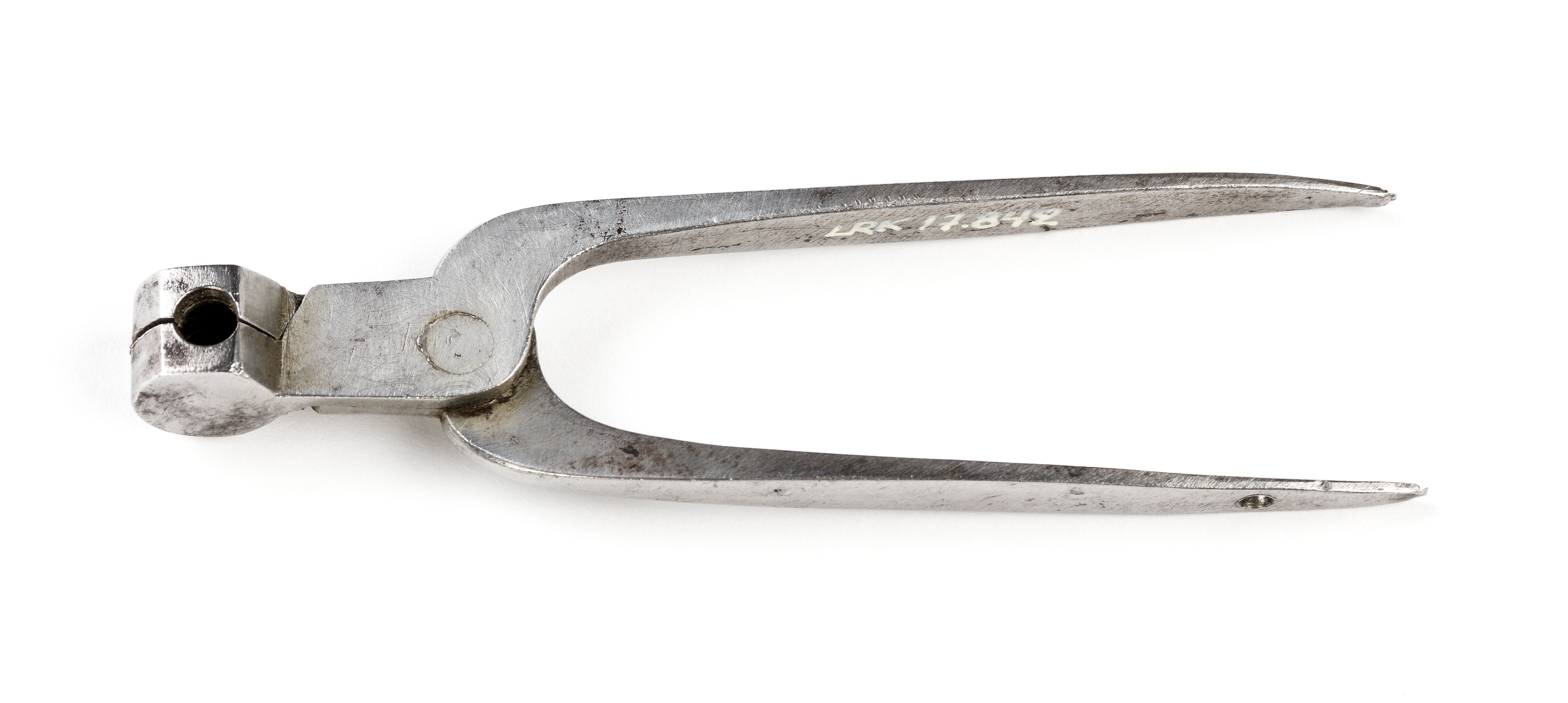 Tång med cylindrisk gjutform med plan yta vid öppningen. Skänklarna spetsovala med fyrsidigt tvärsnitt, 14 mm från änden på den ena borrat ett hål.