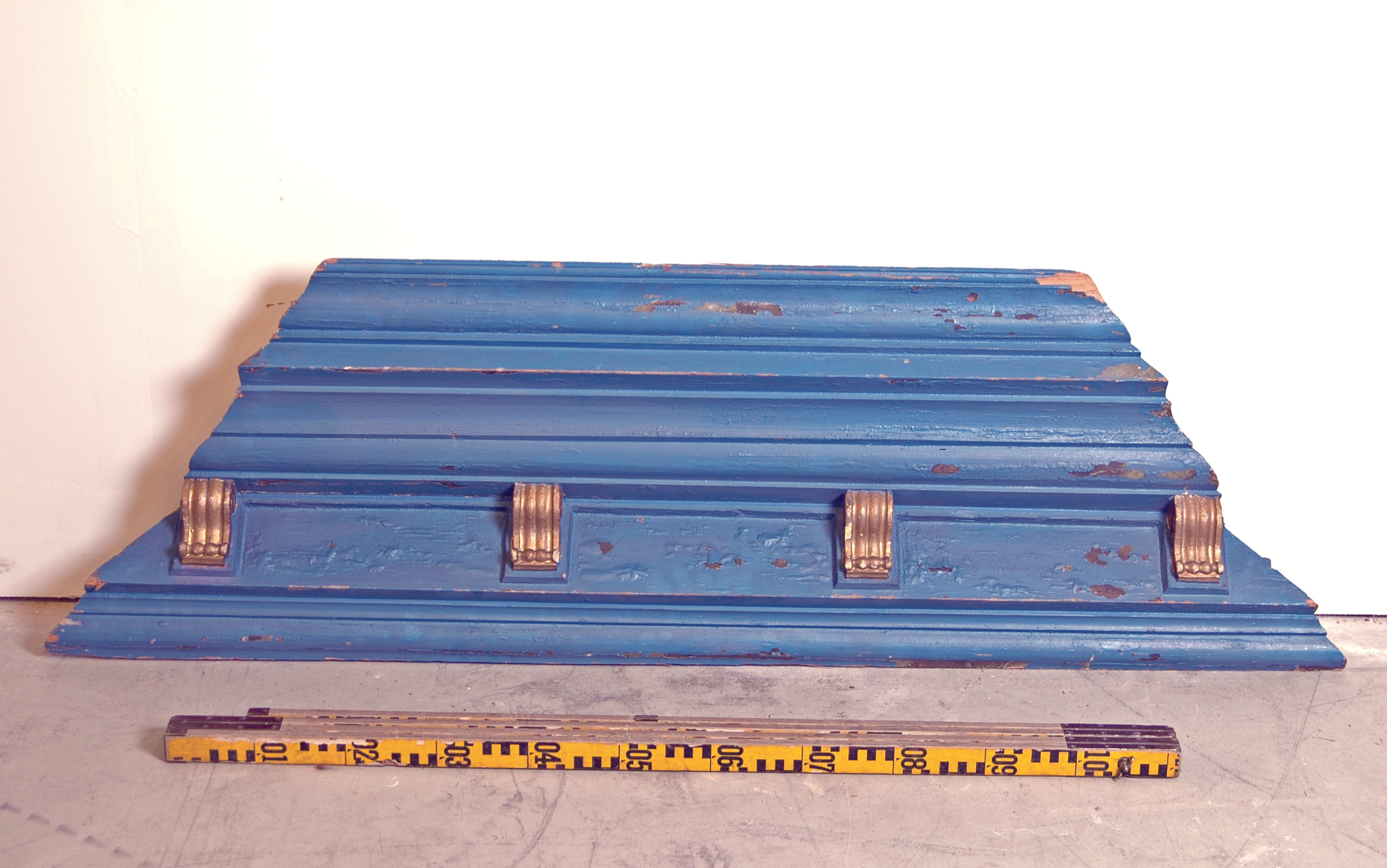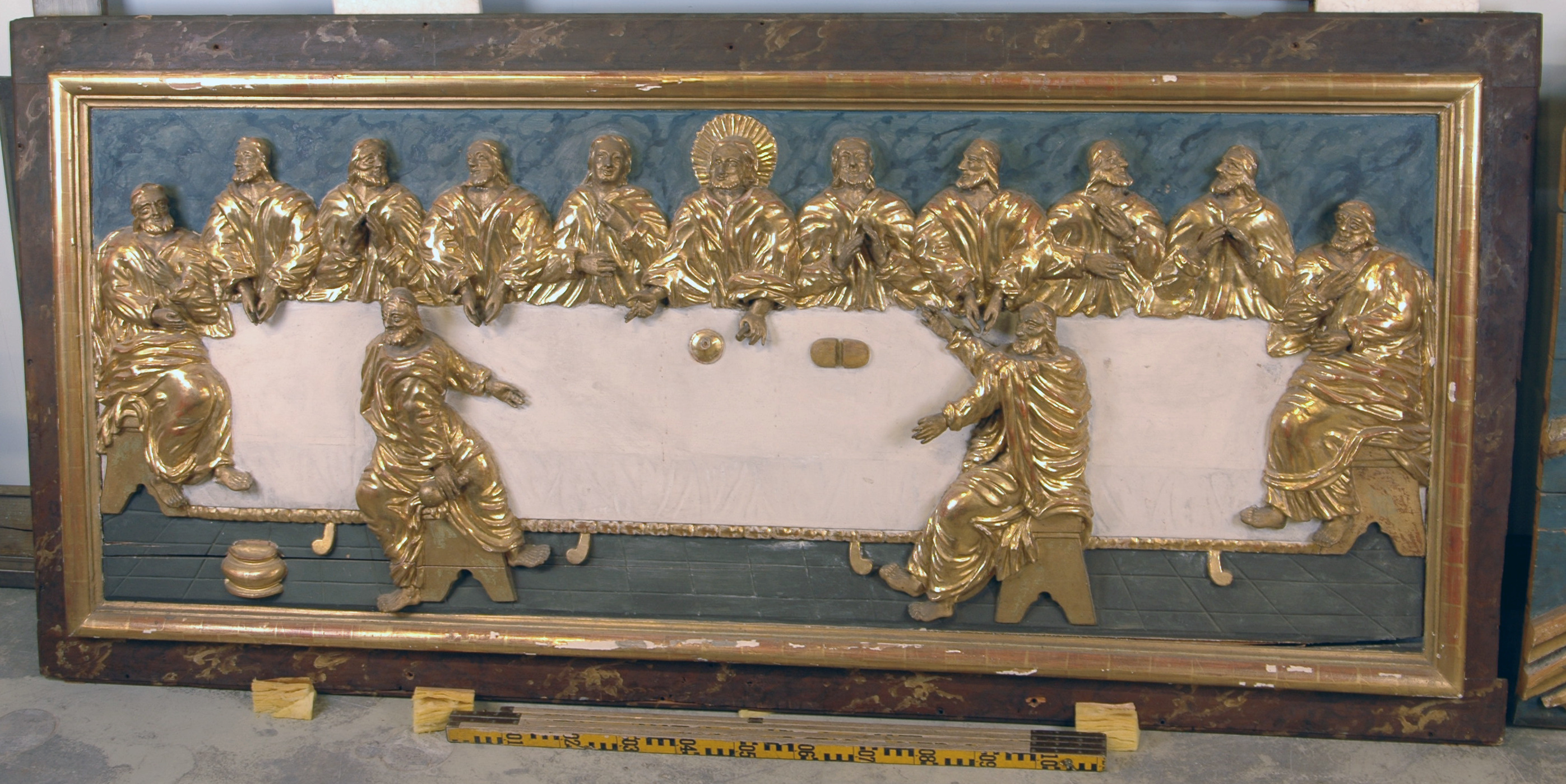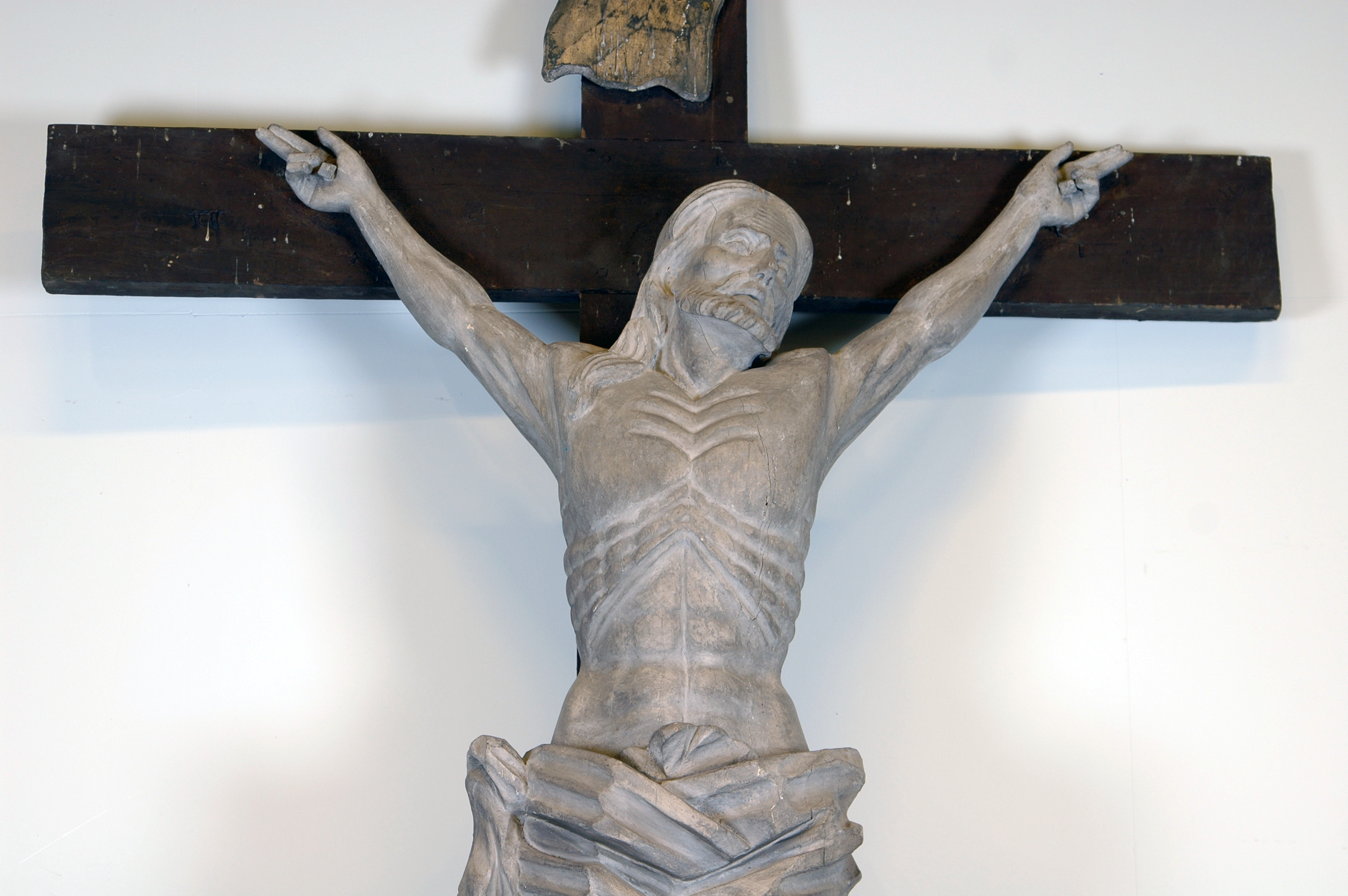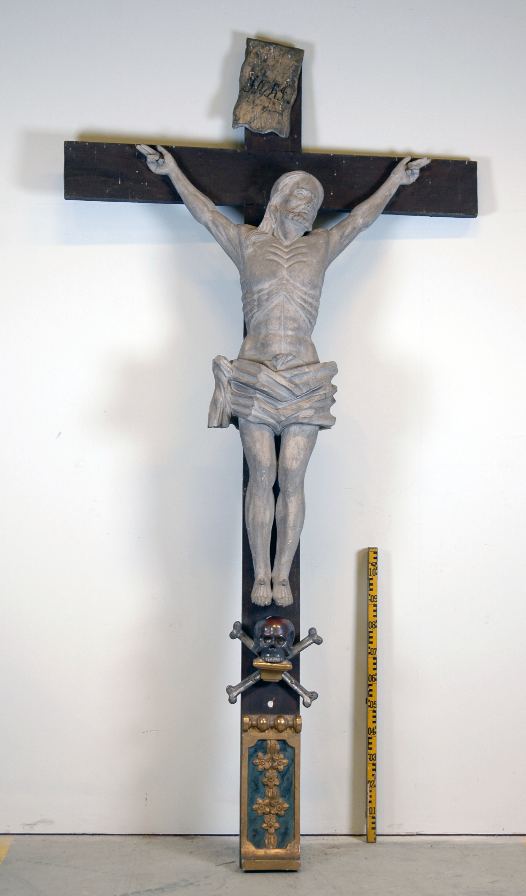 Krucifx med lösa delar till korsets fotstycke. a) krucifix b) Kristi vapen c) sidovoluter till fotstycke