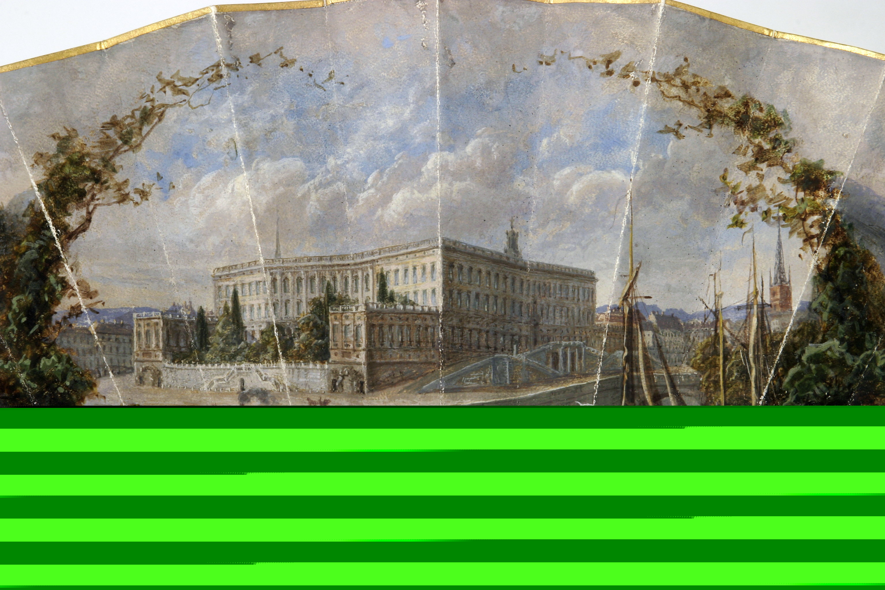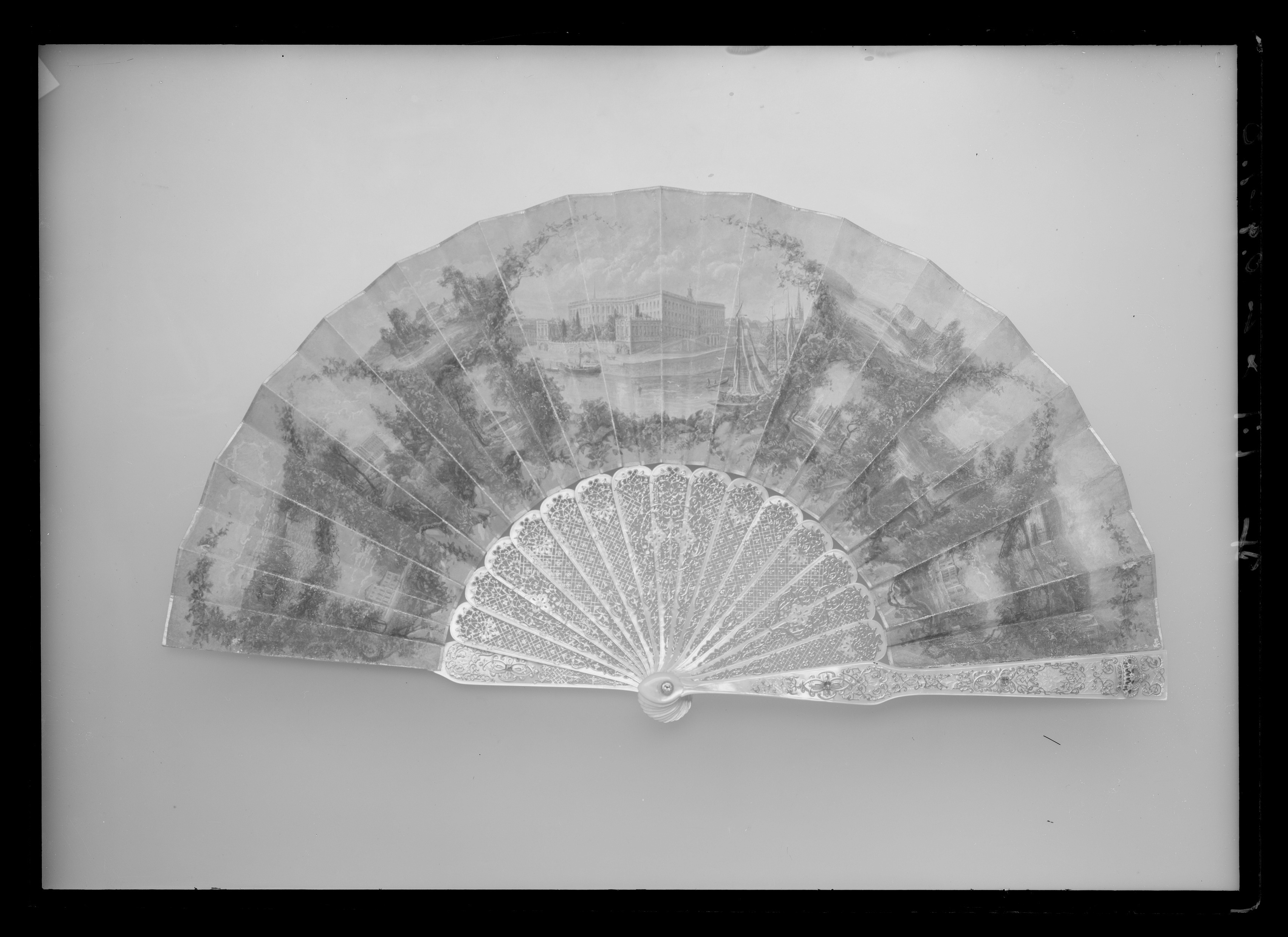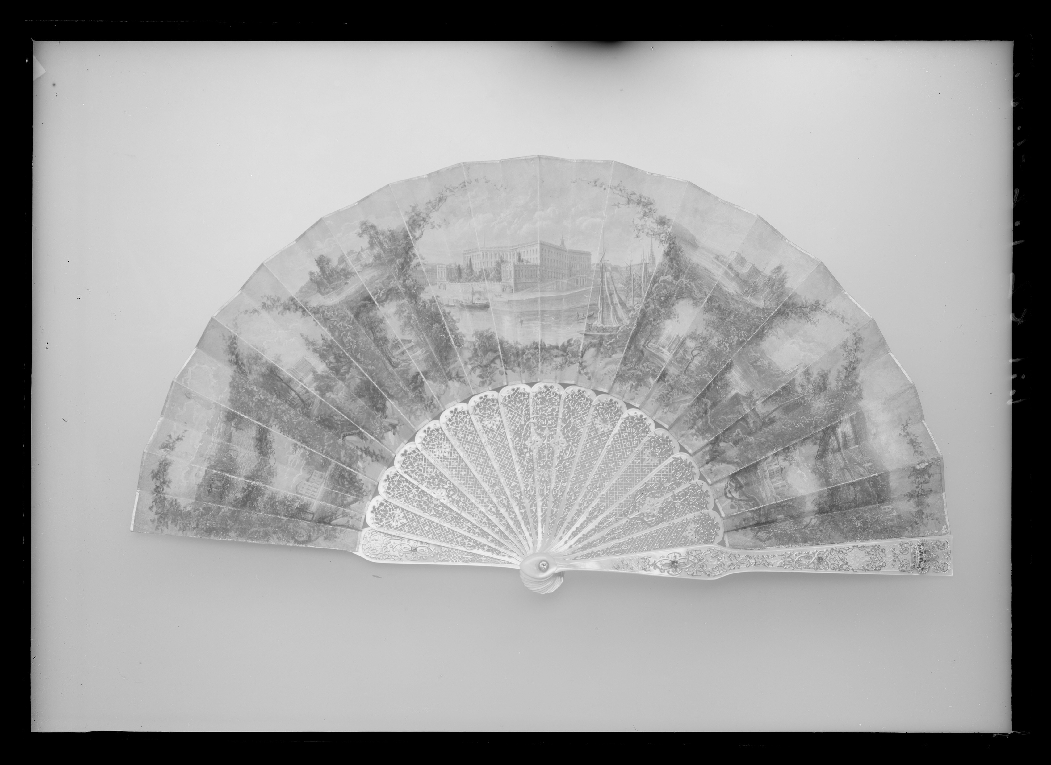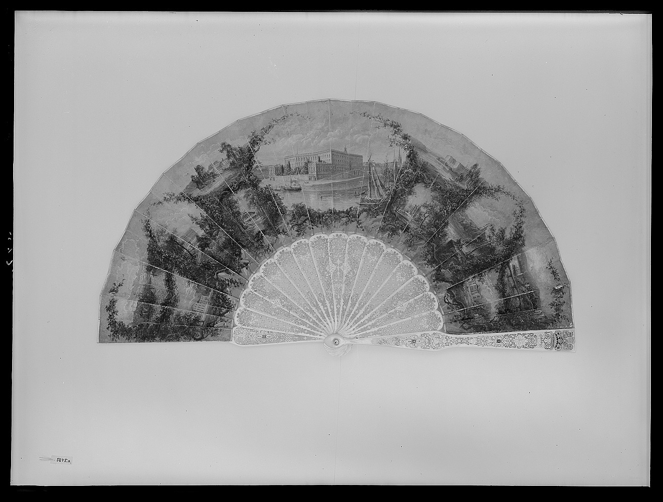 Solfjädern överlämnades till drottningen vid firandet av hennes 50-åriga jubileum på Rosendals slott 1873-06-13 av hennes svenska och norska hov. Stomme av pärlemor i 17 delar, genombruten, skuren dekor, nätmönster och bladrankor. På utsidan delvis förgyllt. De yttre bladen går över hela bredden, delvis förgylld dekor i relief, det vänstra bladet täckt av skärmen, på nedre delen en kvadratisk, rödemaljerad platta. På det högra bladet en kunglig krona av guld samt röd emalj, på kronringen två rubiner och tre smaragder. Nertill på bladet en smaragd och en rubin i avdeckt fattning. På insidan likadan dekor på det högra bladet. Ihopfästning nertill med stift med guldhuvud, däri infattat en smaragd på vardera sidan, avdeckt fattning. Bredvid drottning Josefines krönta namnchiffer omgivet med band med svenska och norska färgerna bärande årtalen 1823 och 1873. På stommen fäst en 145 mm bred skärm av pergament, målad dekor i gouache. På utsidan ovala fält, omgivna med bladrankor, träd m.m.. I fälten stadsvyer, slott m.m., i mitten i ett större ovalt fält Stockholms slott; till vänster upptill hamnbild i solnedgång (Stockholm?). Därnedanför Drottningens paviljong, Haga(?), till höger slottet i Oslo, därinvid upptill Drottningholms slott därnedanför alpstuga av trä. På höger sida upptill Tullgarn, därnedanför minnestempel och fontän, i mitten borg på höjd, längst till höger upptill vy av Skeppsholmen med Karl Johanskyrkan, nertill Rosendals slott. Signatur längst till vänster med röd färg: "B.Wernqvist // Sthlm 1873". På insidan i mitten drottning Josefinas krönta namnchiffer målat med guldfärg, därnedanför blommor, längst till vänster edelweiss, i mitten penséer, till höger röda blommor,däremellan violer. Bakgrund i form av himmel med flygande fjärilar (3st) och en trollslända. Vid penséerna fladdrande band, ett blågult med årtalet 1823, ett rött medblåvita kanter med årtalet 1873. Till vänster signatur med brun färg: "B.W. // 1873 Stockholm". Målad av Berta Agneta Wernkvist 1873-04-28 - 1875-08-22, elev vid K.Akademien för de friakonsterna.