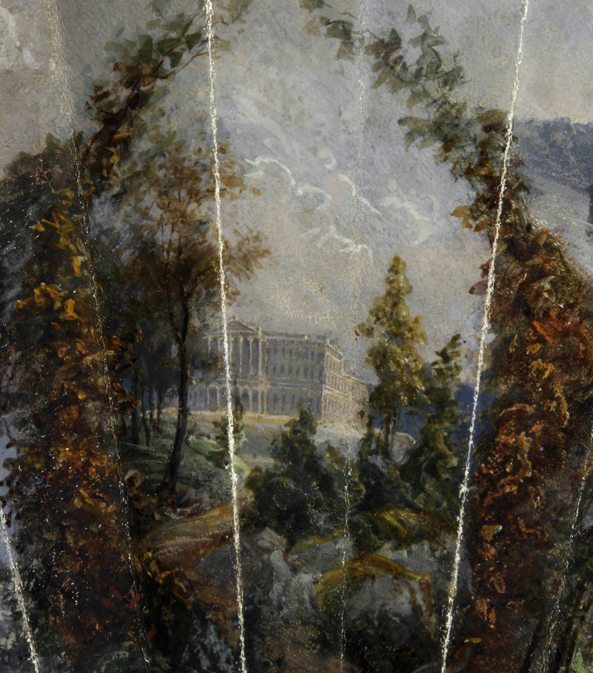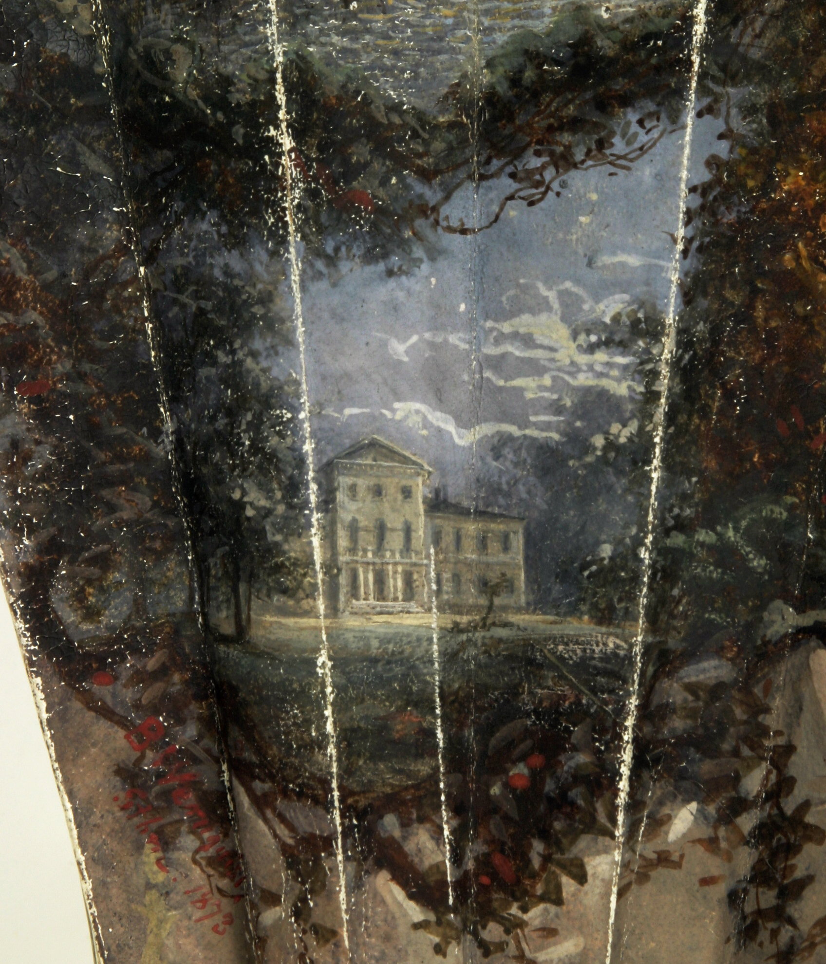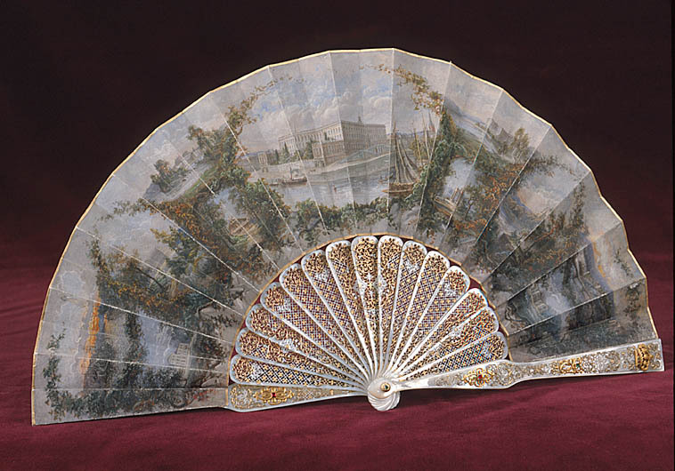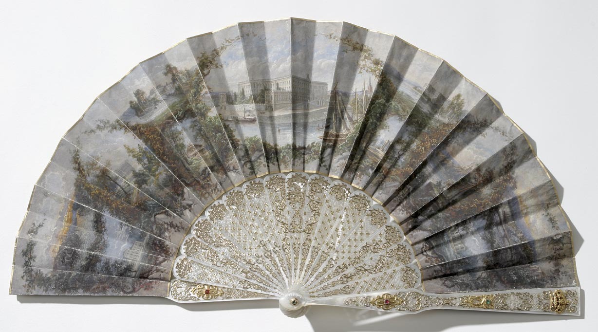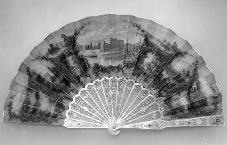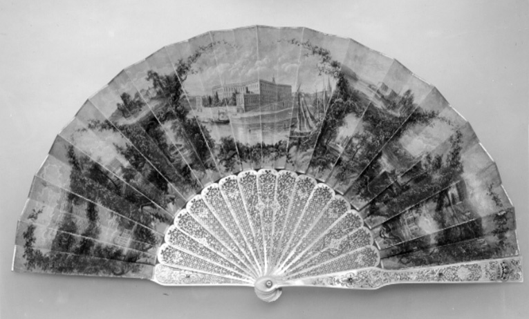 Solfjädern överlämnades till drottningen vid firandet av hennes 50-åriga jubileum på Rosendals slott 1873-06-13 av hennes svenska och norska hov. Stomme av pärlemor i 17 delar, genombruten, skuren dekor, nätmönster och bladrankor. På utsidan delvis förgyllt. De yttre bladen går över hela bredden, delvis förgylld dekor i relief, det vänstra bladet täckt av skärmen, på nedre delen en kvadratisk, rödemaljerad platta. På det högra bladet en kunglig krona av guld samt röd emalj, på kronringen två rubiner och tre smaragder. Nertill på bladet en smaragd och en rubin i avdeckt fattning. På insidan likadan dekor på det högra bladet. Ihopfästning nertill med stift med guldhuvud, däri infattat en smaragd på vardera sidan, avdeckt fattning. Bredvid drottning Josefines krönta namnchiffer omgivet med band med svenska och norska färgerna bärande årtalen 1823 och 1873. På stommen fäst en 145 mm bred skärm av pergament, målad dekor i gouache. På utsidan ovala fält, omgivna med bladrankor, träd m.m.. I fälten stadsvyer, slott m.m., i mitten i ett större ovalt fält Stockholms slott; till vänster upptill hamnbild i solnedgång (Stockholm?). Därnedanför Drottningens paviljong, Haga(?), till höger slottet i Oslo, därinvid upptill Drottningholms slott därnedanför alpstuga av trä. På höger sida upptill Tullgarn, därnedanför minnestempel och fontän, i mitten borg på höjd, längst till höger upptill vy av Skeppsholmen med Karl Johanskyrkan, nertill Rosendals slott. Signatur längst till vänster med röd färg: "B.Wernqvist // Sthlm 1873". På insidan i mitten drottning Josefinas krönta namnchiffer målat med guldfärg, därnedanför blommor, längst till vänster edelweiss, i mitten penséer, till höger röda blommor,däremellan violer. Bakgrund i form av himmel med flygande fjärilar (3st) och en trollslända. Vid penséerna fladdrande band, ett blågult med årtalet 1823, ett rött medblåvita kanter med årtalet 1873. Till vänster signatur med brun färg: "B.W. // 1873 Stockholm". Målad av Berta Agneta Wernkvist 1873-04-28 - 1875-08-22, elev vid K.Akademien för de friakonsterna.
