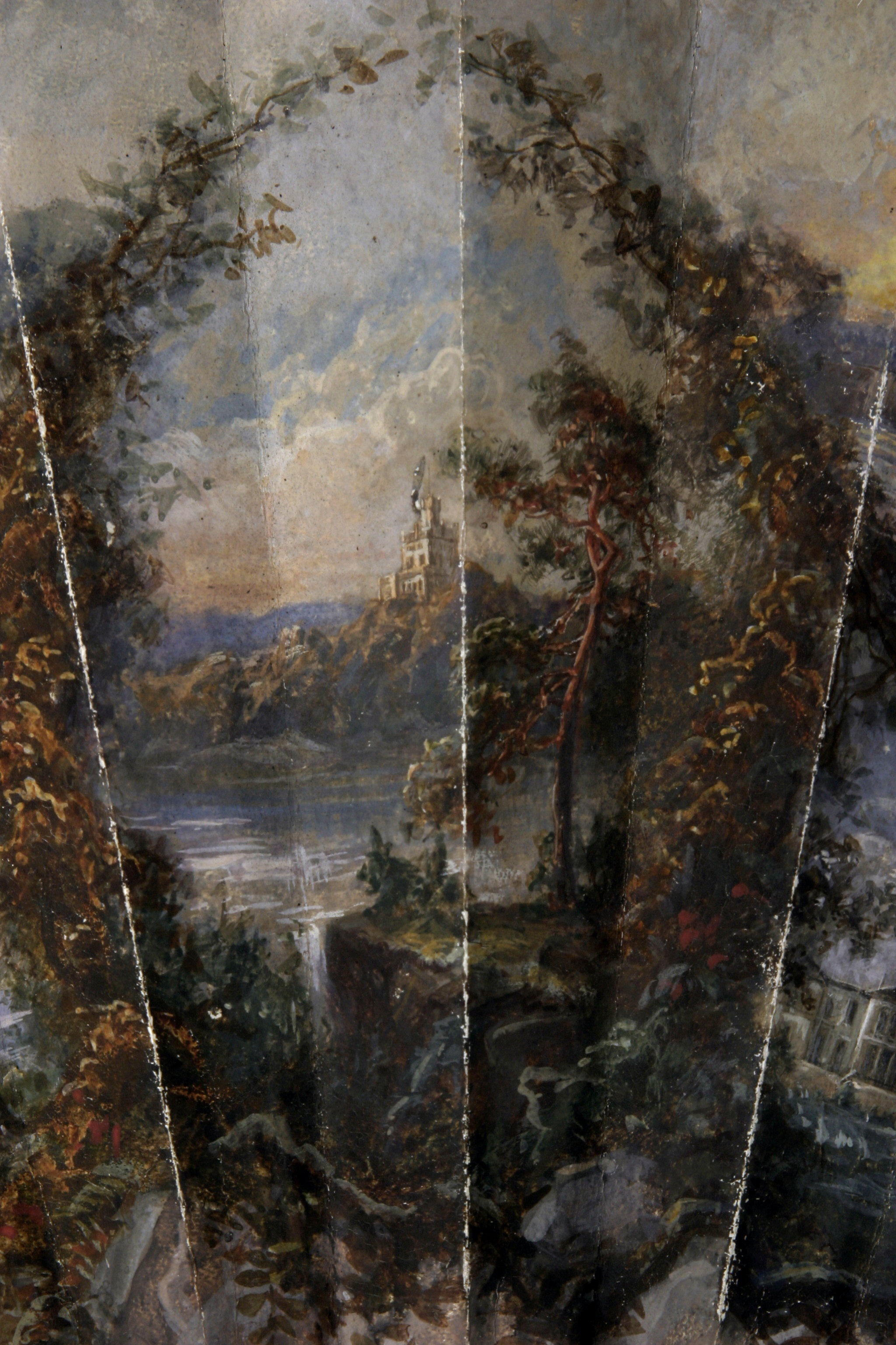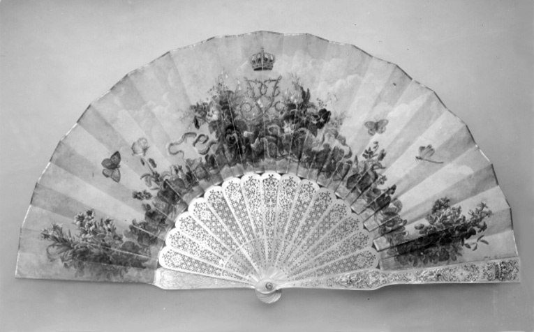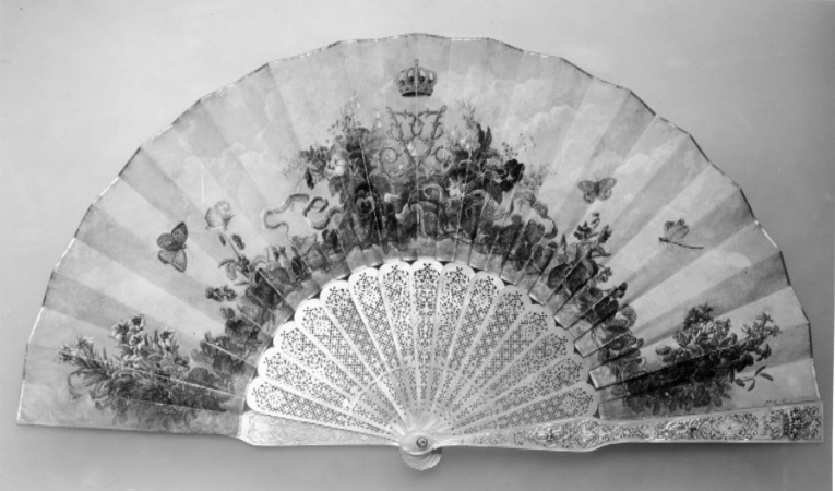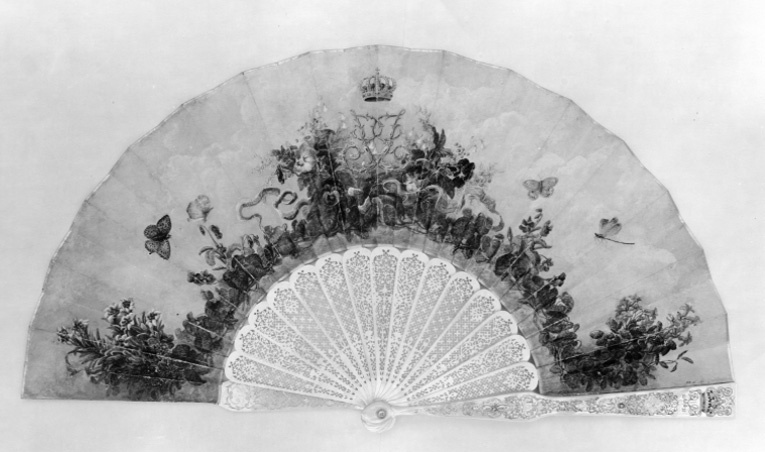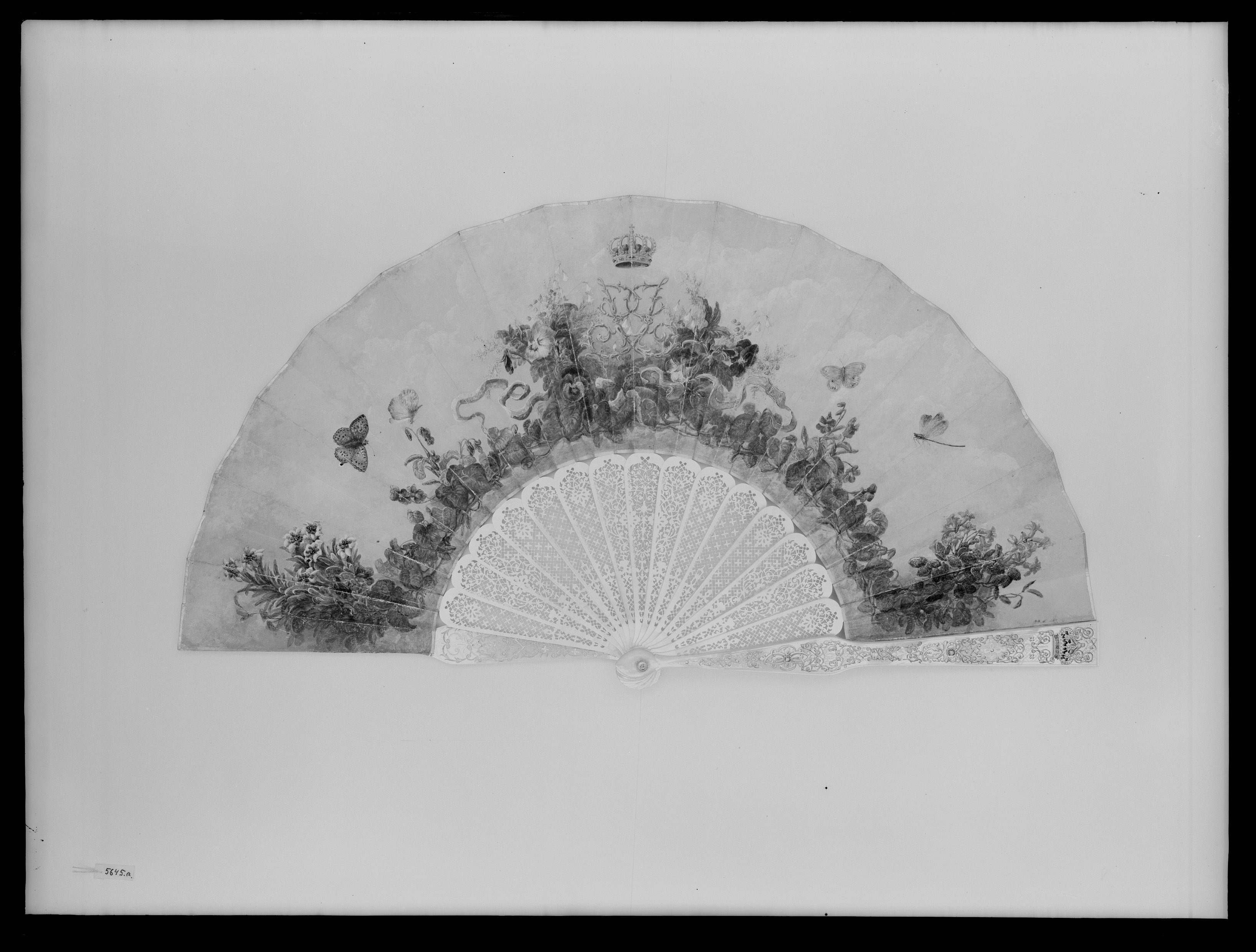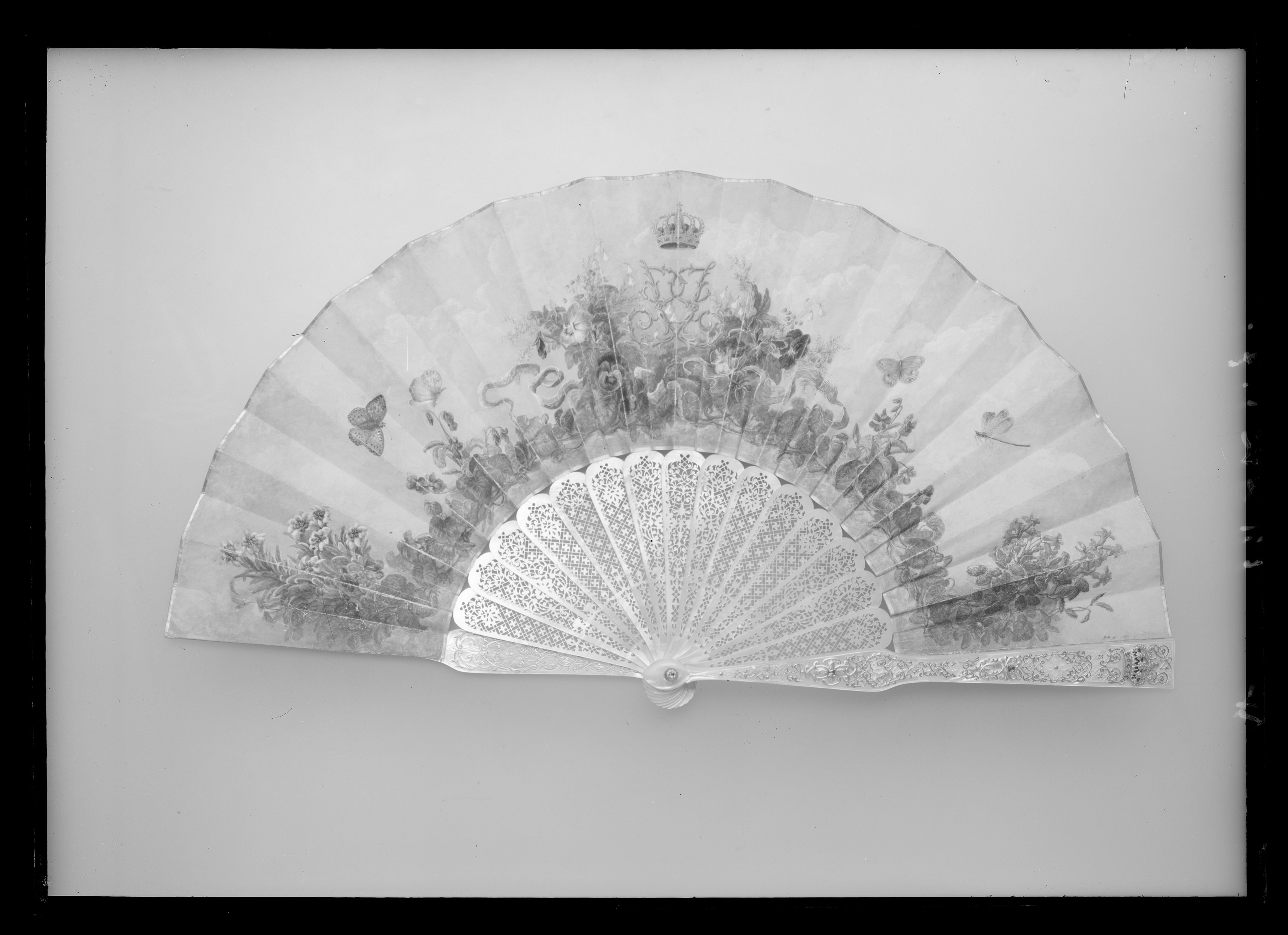 Solfjäder som tillhört drottning Josefina. Gjord till drottningens 50-åriga jubileum? 1873. Med etui 2656. Berta Wernqvist