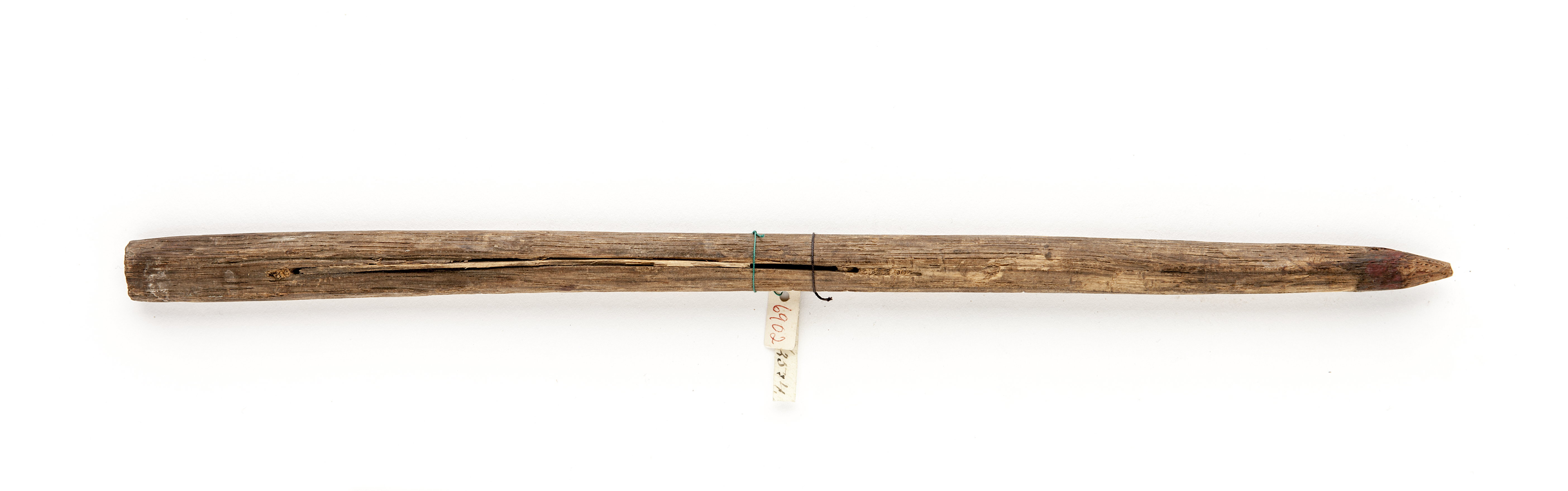 Spets saknas. Skaft av trä, runt tvärsnitt, pilstjärten platt och något vidgad, framtill spetsat.Två snett ställda skåror med fragment av styrfjädrar av trä.