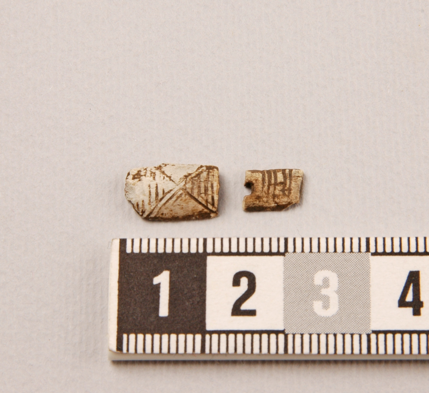 Ena fragmentet med nithål och ornerat med raka linjer. Andra fragmentet ornerat med korslagda linjer och raka linjer i mellanliggande fält.