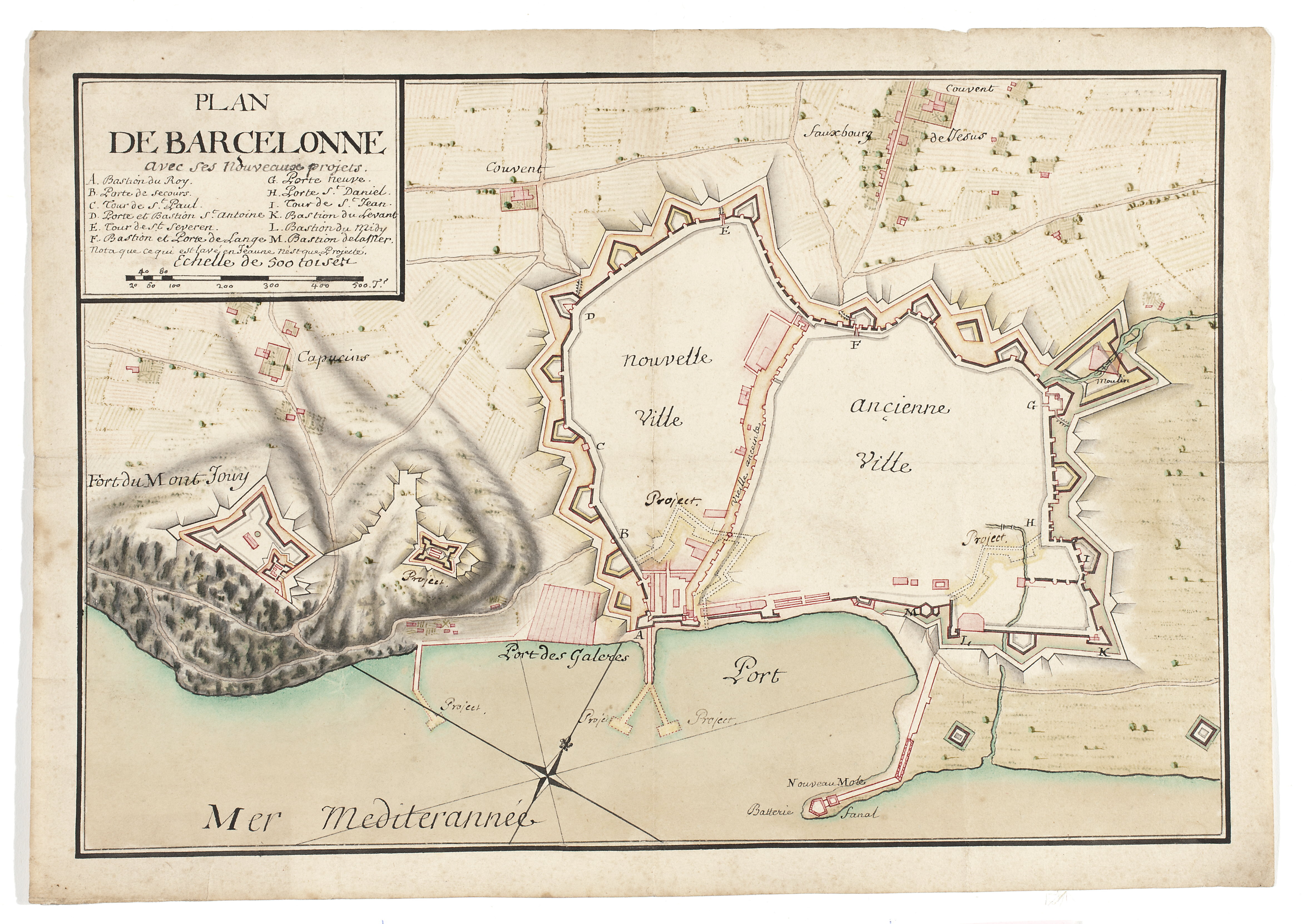 Handkoloreras på papper. Upptill t.v. ”Plan de Barcelonnne avec see nouveaux projets” samt föklaringar, samt skala. Med bläck på baksidan: ”Plan de Barcelonne”.