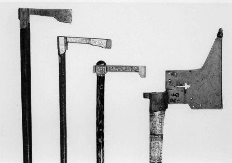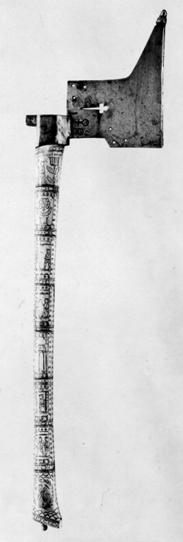 Blad av stål med framåtriktad egg och uppåtriktad spets med ett ekollon av mässing på ytteränden. Dekor i form av en genombruten treklöver och två grupper med tre hål. På klingan intill holken två stämplar, dels ett riksäpple, dels "IC S" och två korslagda klingor. Rektangulär holk med en rutad klack på nacken. Skaft av trä, helt överklätt med 8 breda ringar av ben med rik, graverad dekor med scener ur bergshanteringen, omgivna av bårder i prickmönster och streck. Intill holken finns en otydlig text, graverad på benringen. Skaftets ytterände är spetsig framåt och graverad med det sachsiska vapnet. Snidad, rund knapp av ben på den plana ytteränden.