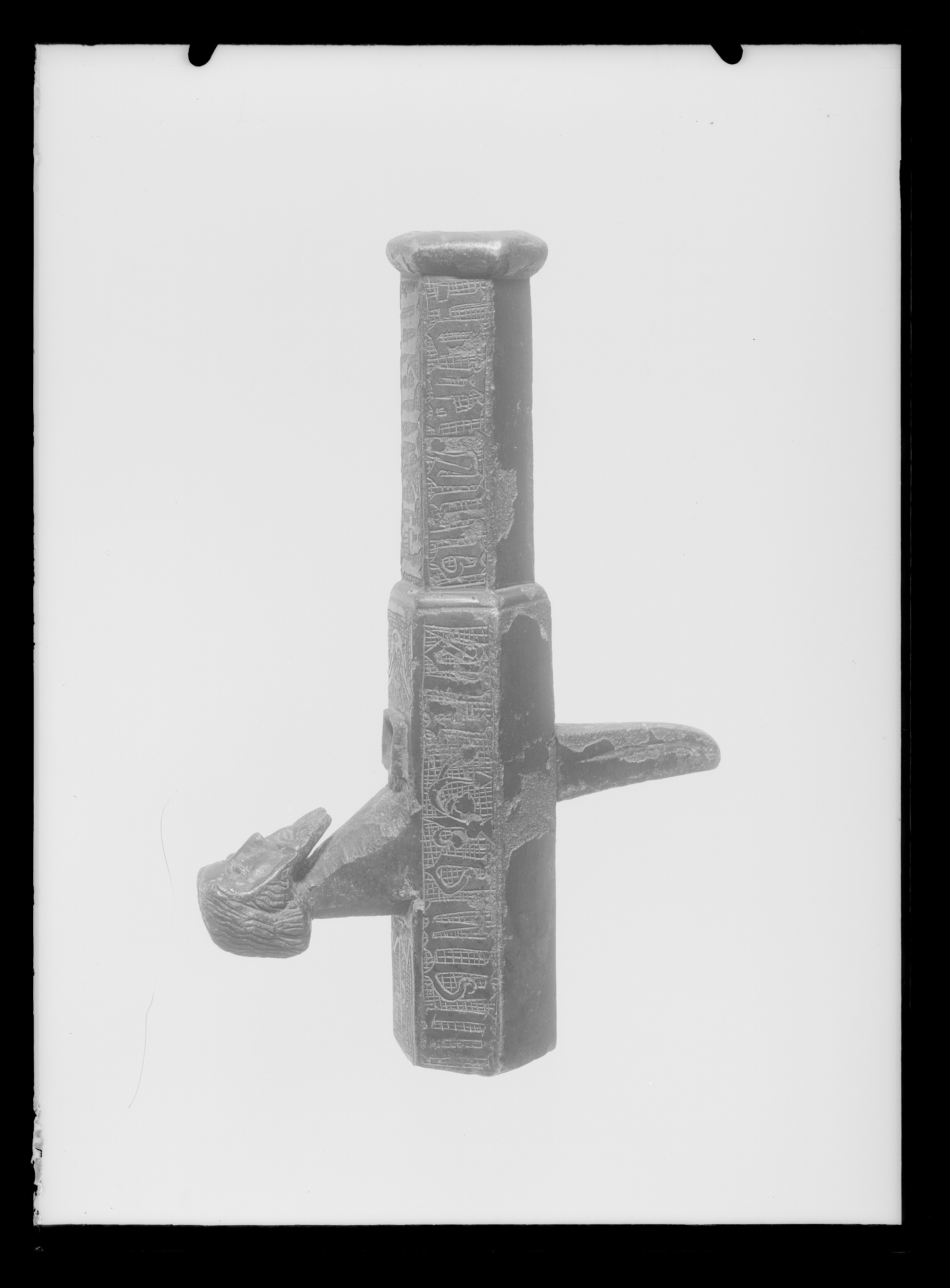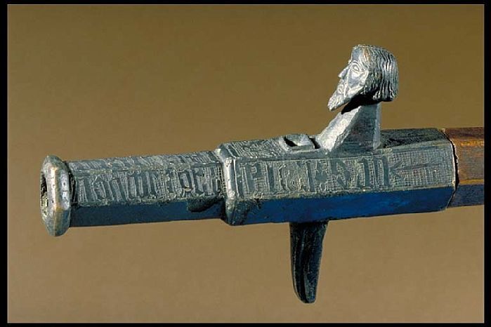 Av brons, sexsidig pipa med trumf, sexsidig, tjockare, bakre del, baktill med urtag för stock, djup 69 mm. På kammarens ovansida fänghål, omgivet av en upphöjd, fyrsidig ram, därbakom ett skäggigt manshuvud på en uppåt avsmalnande "kropp", h: 46 mm, bakom huvudet ett bomärke. På pipans och kammarstyckets tre övre sidor text med gotiska minuskler, på h. sida: "mariaple" (r-i ligatur), på främre delen "ahiepgot". På ovansidan: "mariapl" (r-i ligatur). På v. sida: "namctqhi" (q=g?), på bakre delen "pleh.snv". På undersidan en hake, l: 47 mm.