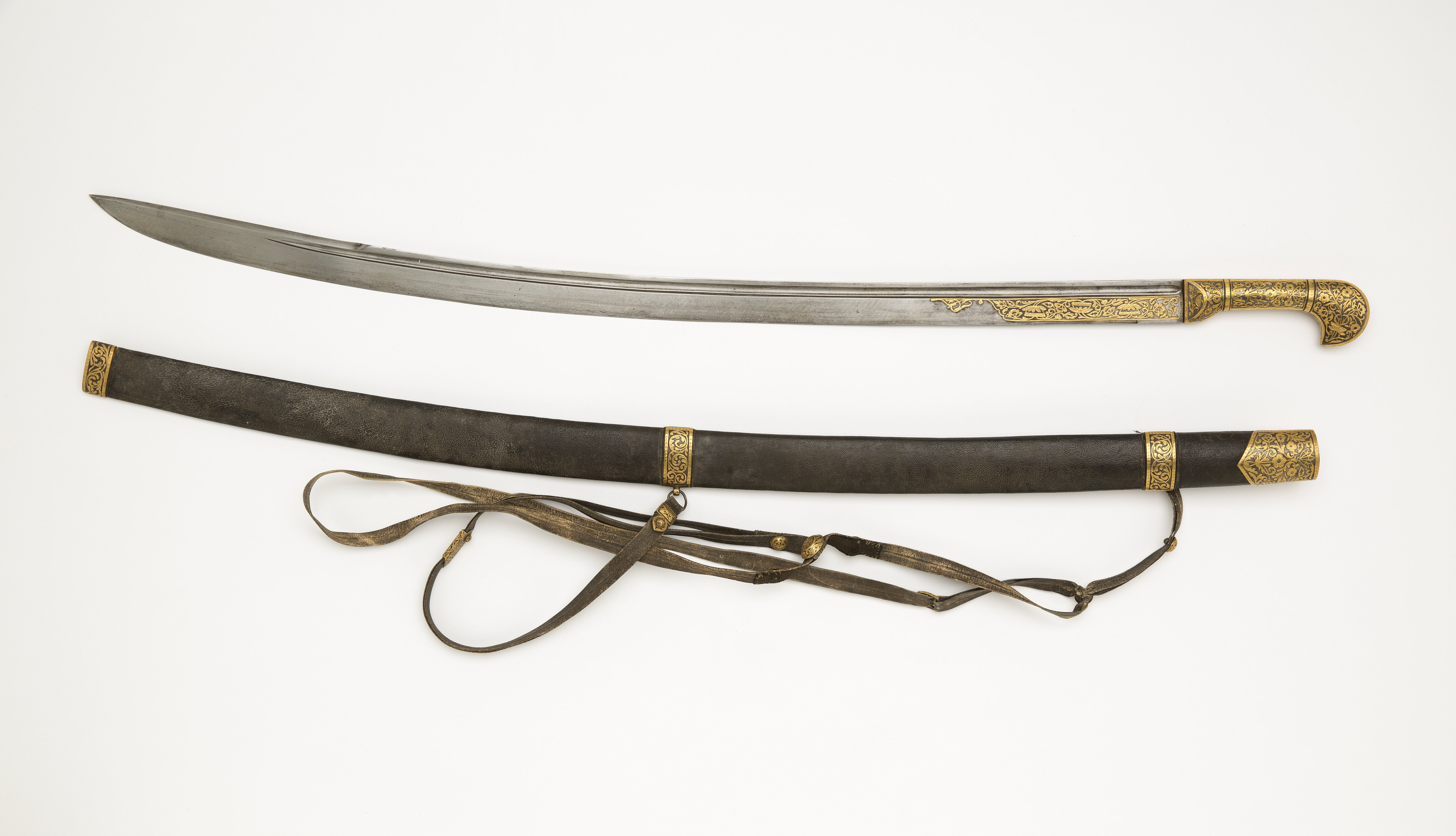 Balja överklädd med svärtat skinn (får), beslagen med munbleck, två mellanband och doppsko, alla med yttäckande ornering av rankor av påslaget guld. Munblecket, b: 61 mm, på ena sidan neddraget i en spets. Mellanbanden b: 21 mm, doppskon ringformig, b: 19 mm. På övre mellanbandet en rektangulär bygel, på det nedre hållare med koppelring, allt för bäranordning. Tillbehör: Gehäng av brunt läder, b: 13 mm, med fem små välvda, förgyllda knappar samt en större oval och två beslag av samma material.