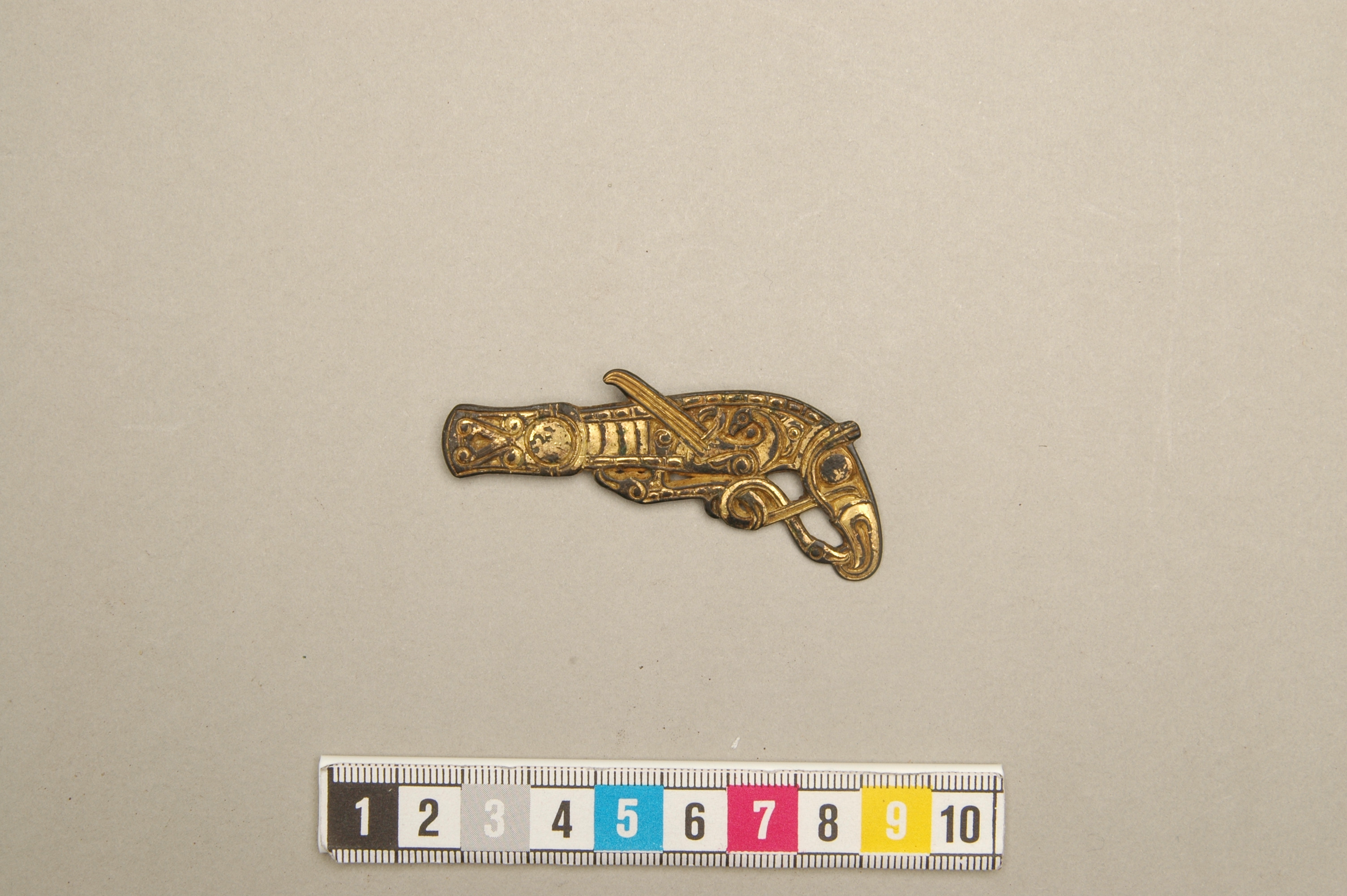 Förgyllt stiliserat djurformigt bronsbeslag. Djuret håller i sina klor en orm och biter i dess huvud.