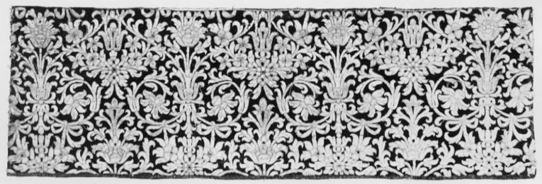 Bottentyg av röd sammet i kypert. Mönster av två omväxlande akantusmotiv, nedtill avslutade med ett blomstermotiv. Varannat motiv över hela höjden, varannat förskjutet ett halvt motiv i höjdled. Broderiet yttäckande i läggsöm med trådar av guld och silver nersydda med silke. Konturer av snoddar med metall spunnet över en silkeskärna. Längs kantena har sytts på ett 10 mm brett rött bomullsband, halva synlig från rätsidan.