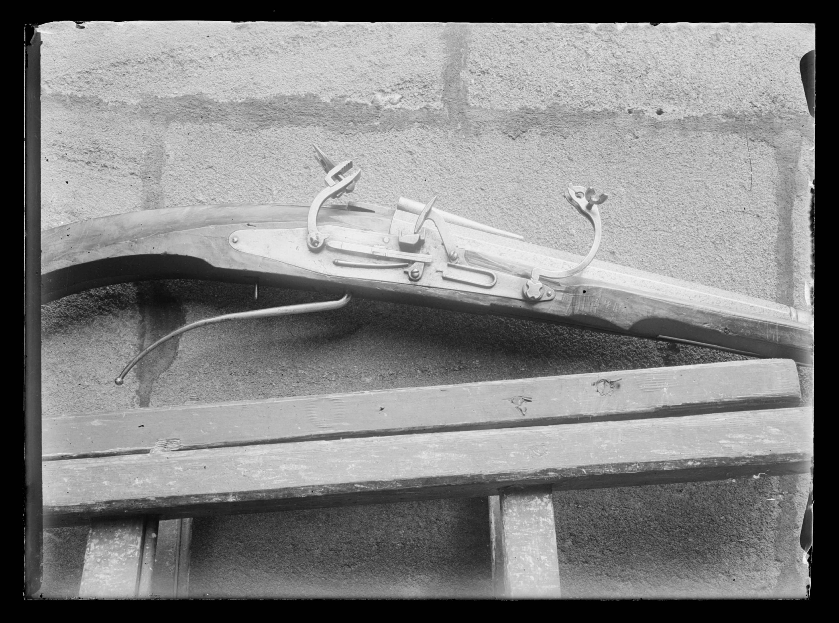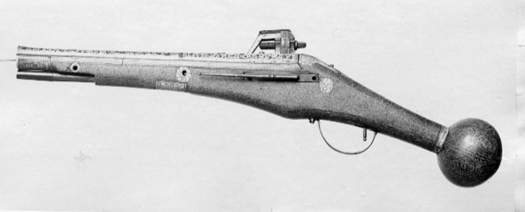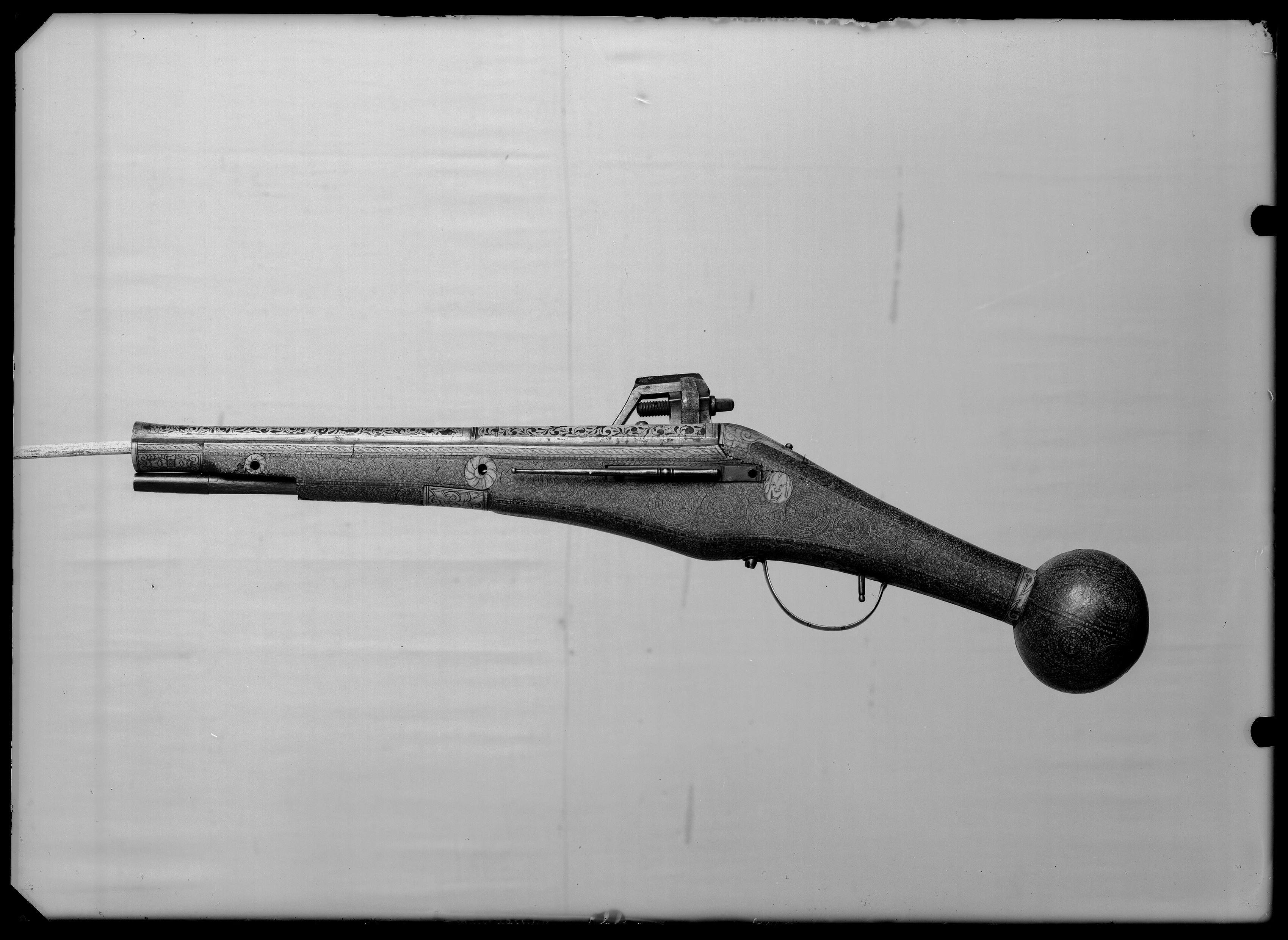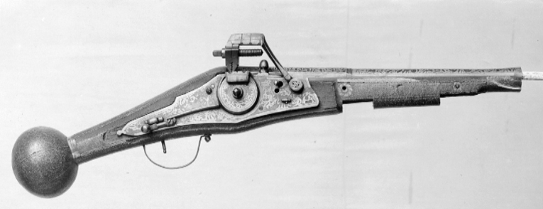 Rund, på kammaren åttsidig pipa med trumf, vid övergången på ovansidan en profilerad ring. Rektangulärt, mjukt böjt svansskruvblad. Pipans och svansskruvbladets ovansida täckt av påslaget silverbleck med utsparad rankdekor. På kammarens ovansida vid pipbasen en otydlig stämpel, på kammarens undersida en Z-liknande stämpel (ankarslut?). Fästning: Två häften. Pipan fäst med krysskruv underifrån (varbygelns skruv) samt urspr. två pipstift. Hjullås av tysk typ med plant låsbleck, dekor som på pipan. Hjul täckt av plan hjulkapsel med dekor som på pipan. Rektangulär fängpanna med streckdekor på gaveln. Fängpannelock med rörlig arm, ollonliknande grepp med djupt inskuren hals, rundad främre arm med dekor av två streck. Svarvad tryckknapp med kulformigt huvud av skaftets diameter. Hane med rester av förgyllning, fyrsidig kropp med framtill fasade ytterkanter, hals med ås och streckdekor. Rombiska, framtill tvärt avskurna käkar, underkäken lös, käkskruv med fyrsidigt huvud. Nedtill på hanen en rund skiva trädd på hanaxlen, på axeln korsformig dekor. På låsbleckets insida kommaformig nöt och hanfjäder. Säkring: Virvelsäkring med spår av förgyllning, ollonliknande grepp, rak fjäder till hjulhuset. Fästning: En, urspr. två låsskruvar från h. sida, den främre saknas. Avtryckare: Rak, svarvad avtryckare. Helstock av trä med något böjd, bakåt avsmalnande kolv med stor, rund kolvkula, d: ca 83 mm, h: ca 73 mm. Helt sluten laddstocksränna. Yttäckande inläggningar av ben i form av lister, koncentriska cirklar och små punkter. Längs kanterna bredare lister med repstavsdekor, vid kolvkulan ring med beslagsornamentik. På kolvkulans ände en rund platta med ett graverat manshuvud med mustasch och morionliknande hjälm. Bakom sidblecket en rund platta med en maskaron. Fyra blomformiga pipstiftbrickor samt krysskruvsbricka. Näsband av ben, en (urspr. två) rörkor av av ben, den främre saknas, dekor i form av en maskaron. På båda sidor om svansskruvbladet benplattor, bakom bladet liksom som avtryckarbleck triangulära benplattor, på plattan på kolvryggen en maskaron. Rektangulärt sidbleck av stål med bältehake, l: 117 mm, balusterdekor samt ändknopp, rester av förgyllning på balustern. Smal varbygel med dekor av tvärgående, dubbla streck, bakre stolpen inskruvad i stocken, framstolpen fäst med krysskruven. Tillbehör: Laddstock av trä, l: 324 mm, framtill ett invändigt gängat, blånerat stålrör med rester av förgyllning, l: 43 mm.