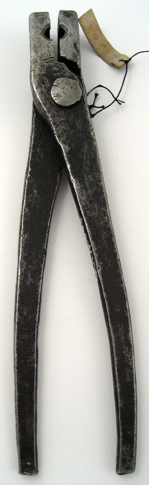 Tång av stål med rektangulära flata käftar. I käftarnas mitt urtaget hål, dim ca 8,5 mm, med öppning åt ena sidan.