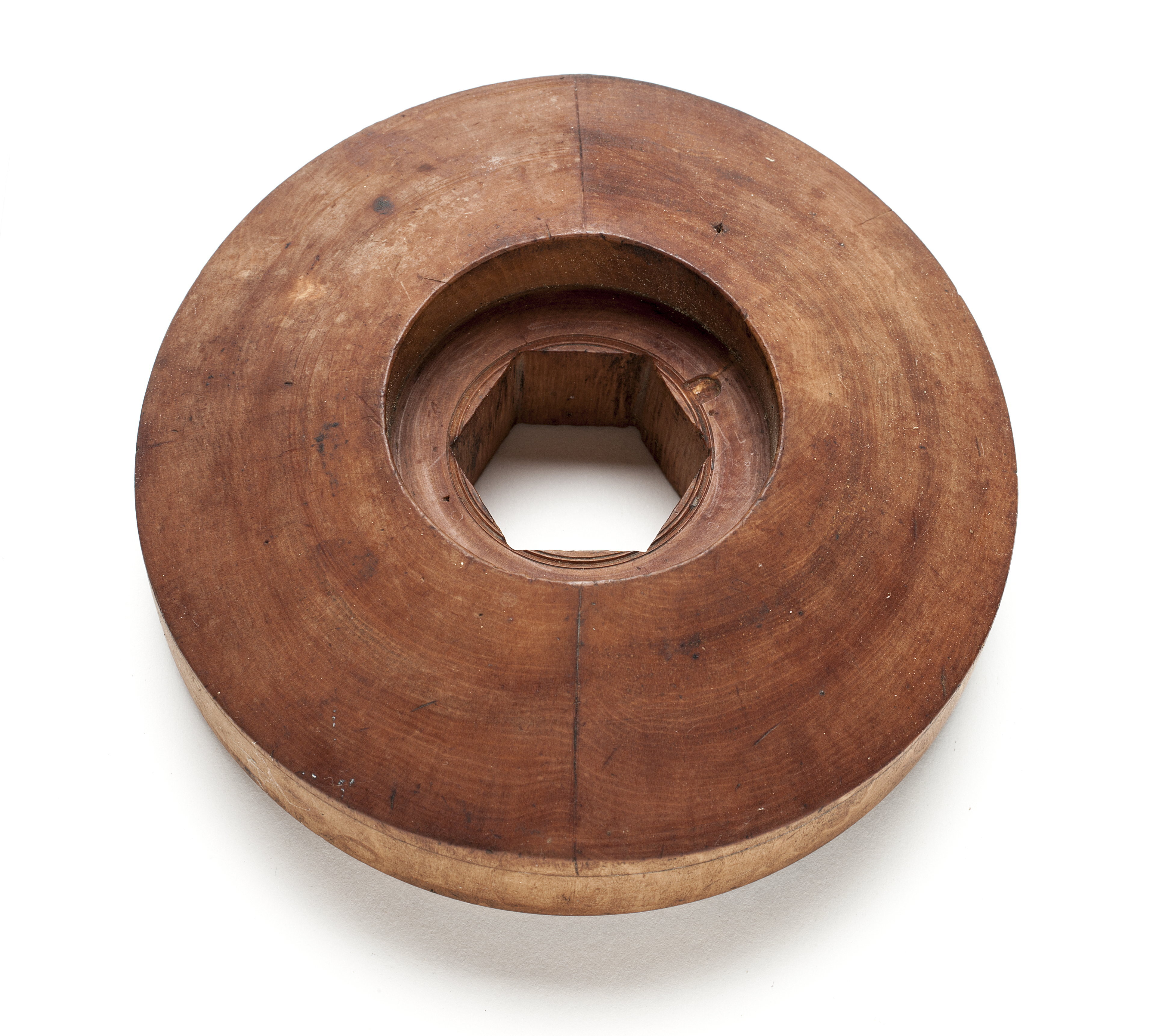 Ena sidan plan, den andra kupig med diagonal ås samt rund fördjupning för spindelhylsan, diam 54 mm. Sexsidigt hål, diag 36,2 mm. Stämpel två gånger: sköld med "S B" eller "S H" över fransk lilja.