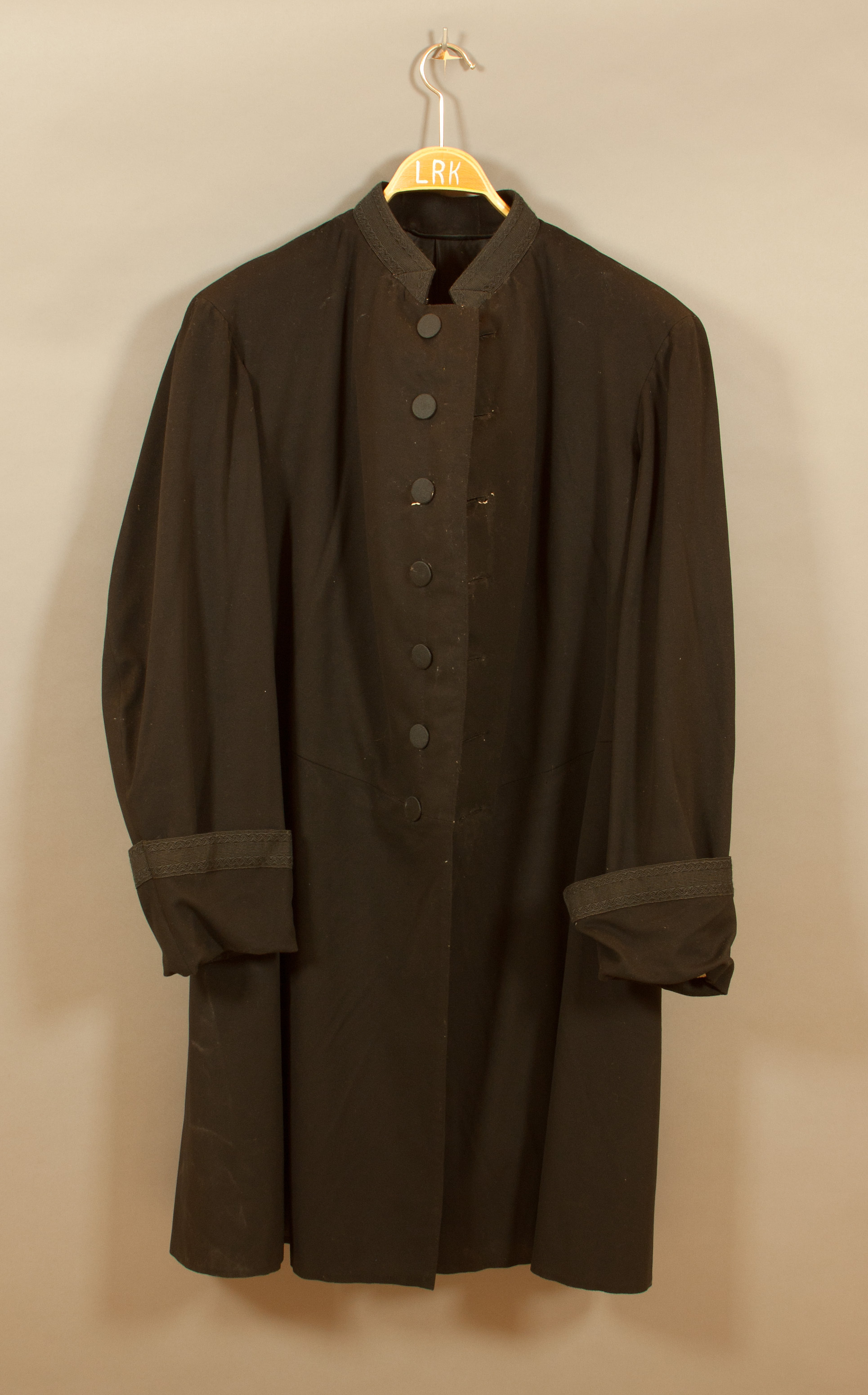 Syrtut av svart kläde, ståndkrage med svart redgarnsboy. Enkelknäppt med sju svarta, tygklädda knappar, diam 25 mm, med instämplad text på baksidan: "C W & Co // SOLIDE". Kragen slutes med hylsa-hake. Ryggen skuren i våder, livsöm. Sprund ända upp till livsömmen. På vardera sidan om sprundet sydda veck från livsömmen och till nederkanten. Spetsiga fållklaffar, l: 270 mm, med tre knappar av nämnda typ, en vid livsömmen, en mitt på och en vid nedre kanten. Vid fållklaffarna horisontella fickor. Isydda ärmar med runda uppslag, h: 135 mm, kantade med samma svarta galon som på kragen. Framstyckena ner till livsömmen fodrade med svart kläde. I övrigt är rocken fodrad med svart bomull. Strax ovanför livsömmen och uppåt är fodret matlasserat. Vitt bomullsfoder i ärmarna. Ovanför ärmarna två hällor, l: 60 mm. Hälla vid kragen. I vänster sida en påsydd innerficka av kläde. I livet två slejfar att hopsömmas med hyska-hake av mässing.