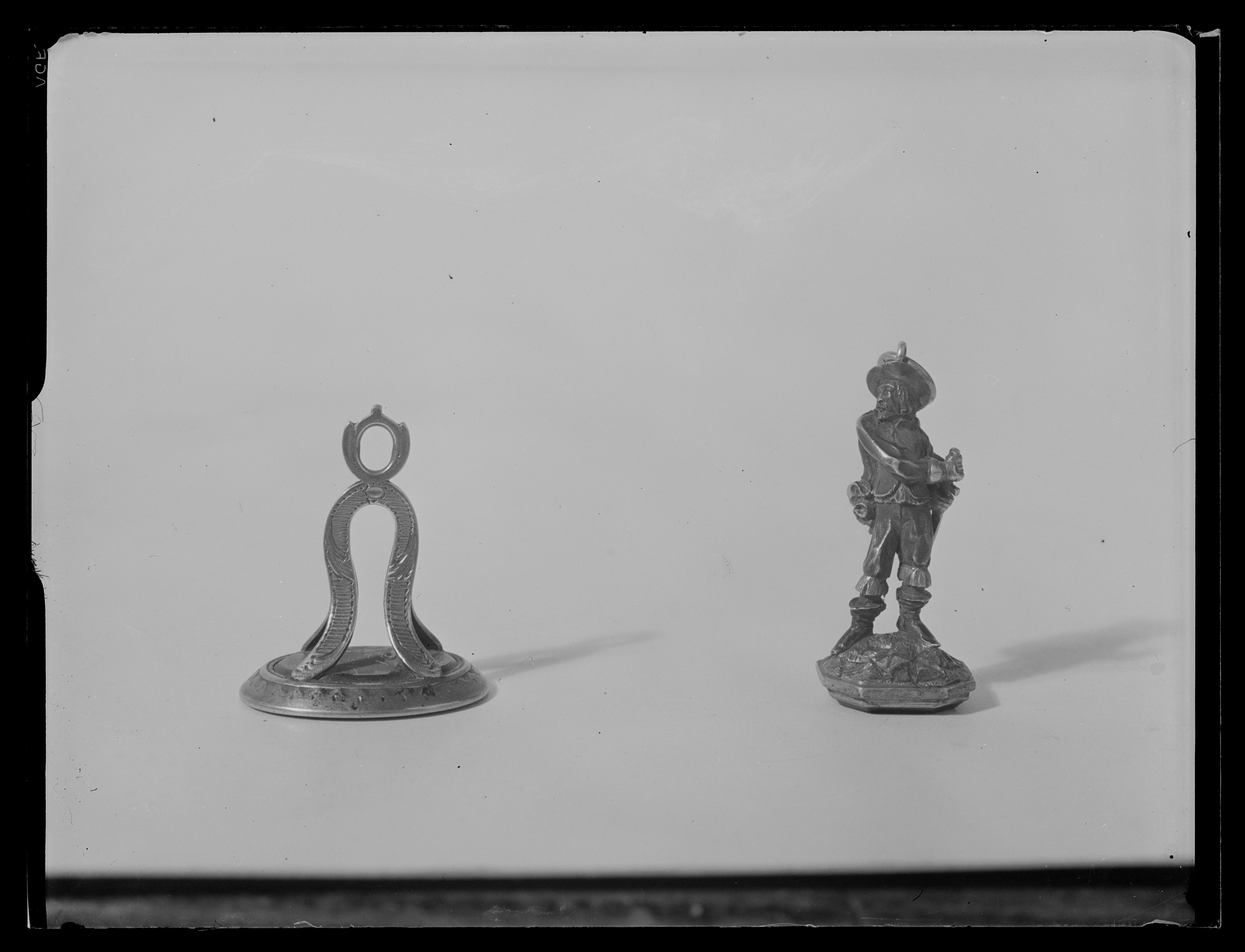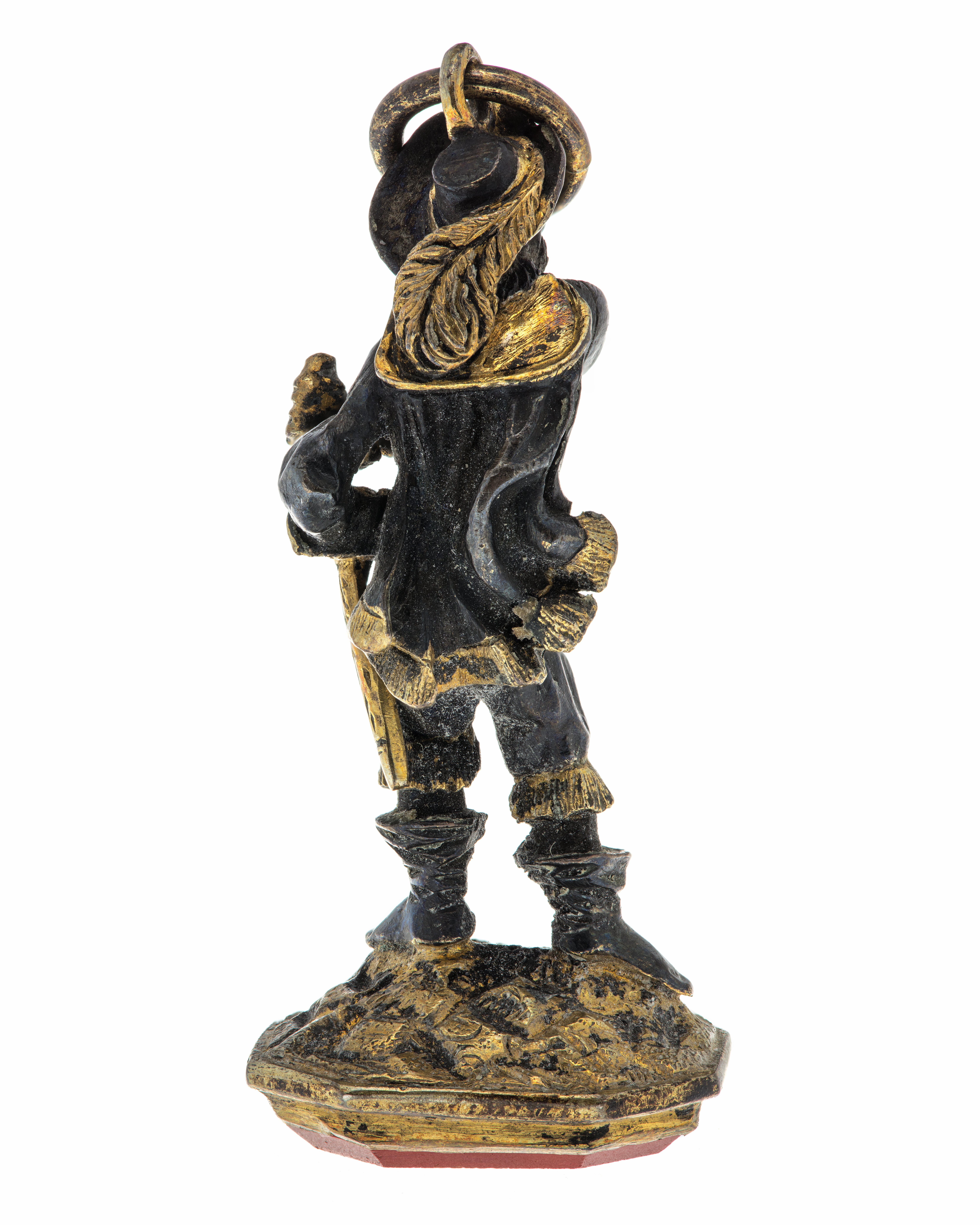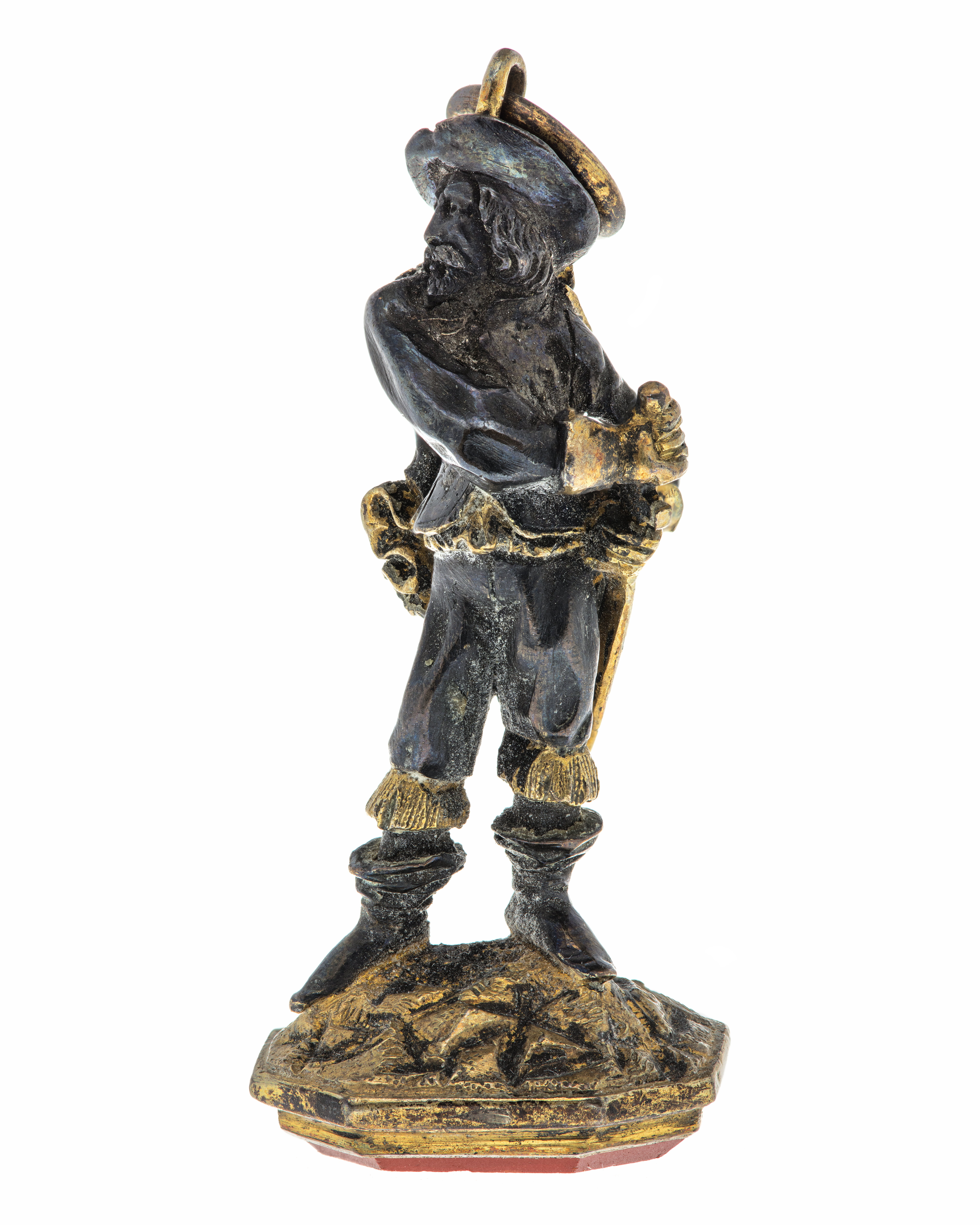 Åttkantig karneol med graverad, rutformig sköld med tre kronor, vågrät skraffering, under skölden två korslagda kredensknivar (symboler för stift Quedlingburg). Vapentält krönt med svensk hertigkrona. Slät fattning av förgyllt silver, skaft av silver, delvis förgyllt i form av soldat från 1600-talets mitt, som drar sitt svärd. Ögla med ring fäst vid hatten.